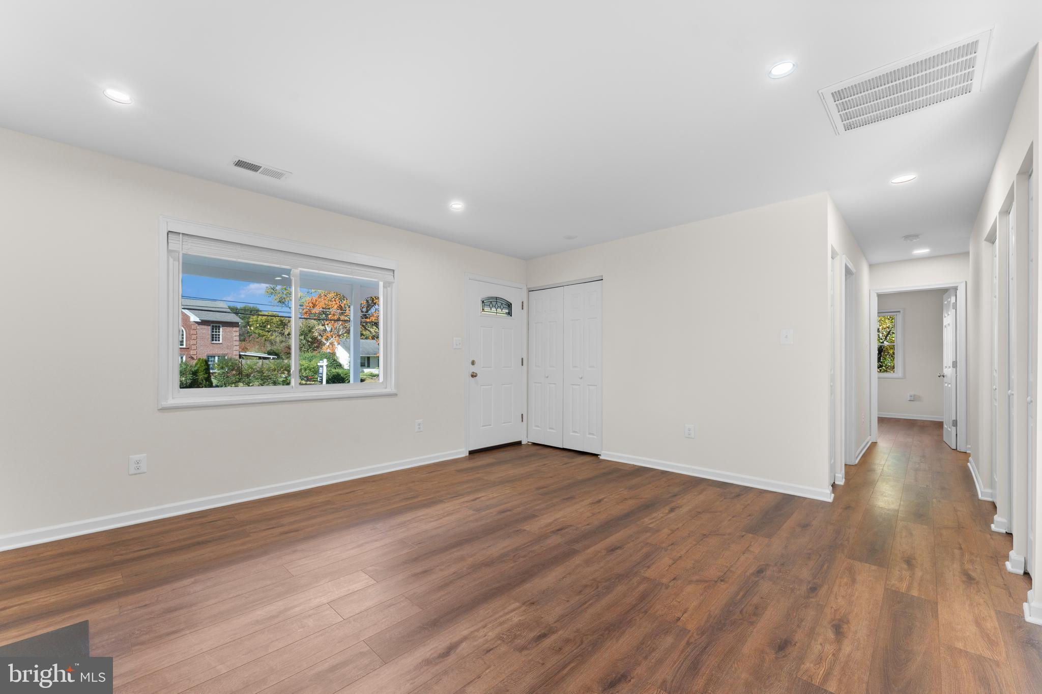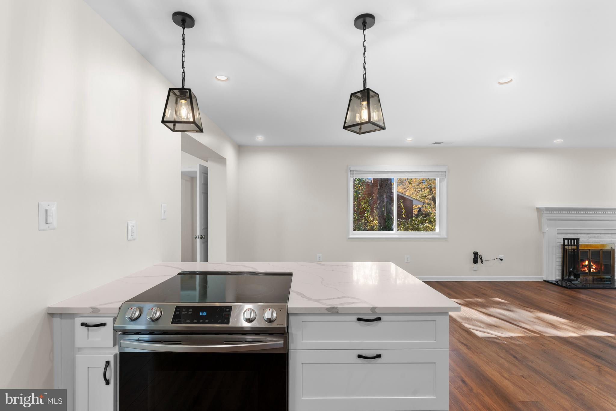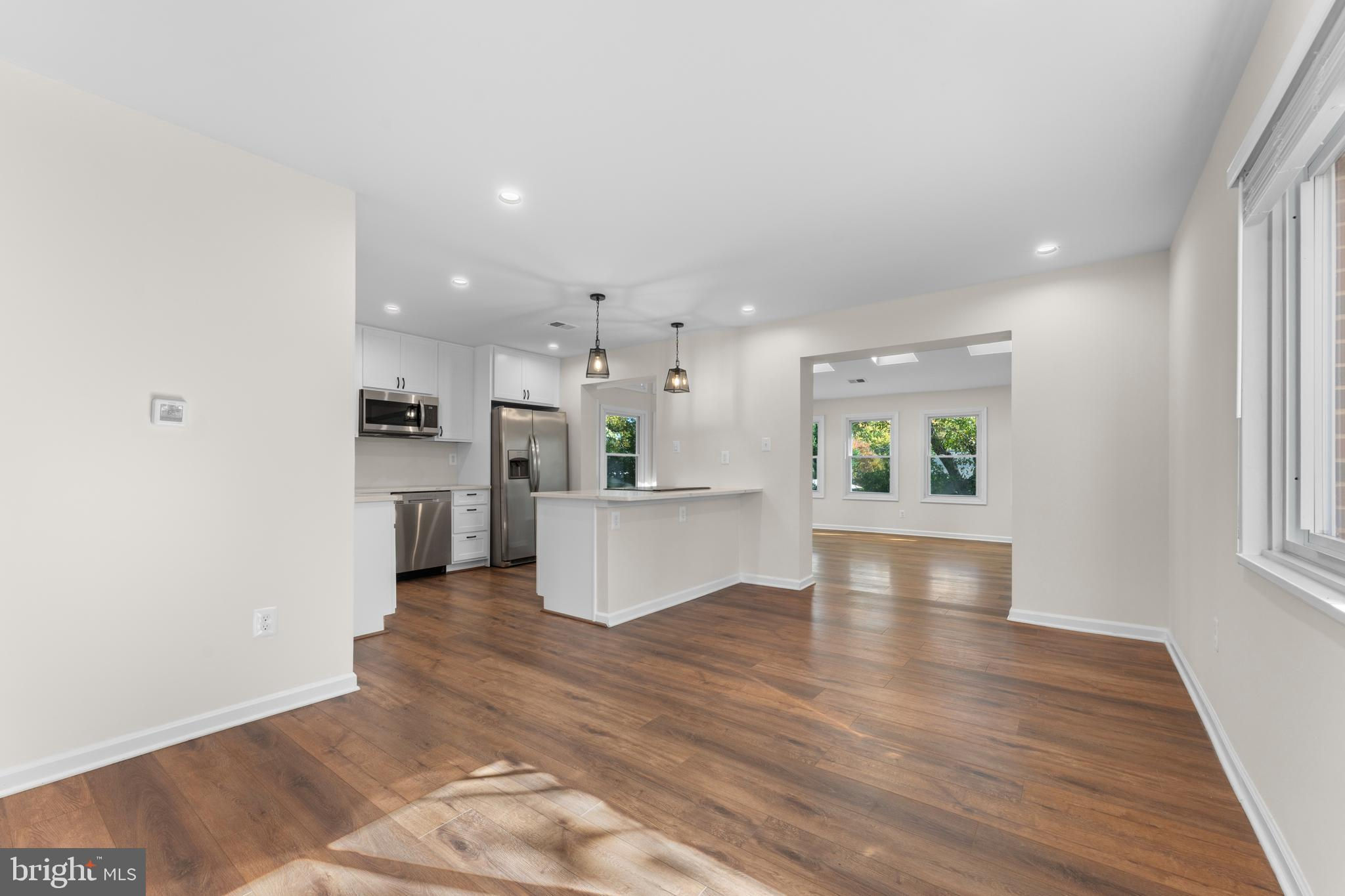 Beautifully Updated & Move-In Ready! This fully renovated home features white cabinetry, quartz countertops with a center island, SS appliances, and modern fixtures throughout. Enjoy the open layout and low-maintenance luxury vinyl plank flooring—no carpet anywhere! The spacious family room is filled with natural light and accented by skylights. The primary suite offers skylights, a walk-in closet, and an en-suite bath with double sinks and a tiled shower. Three additional bedrooms sit on the opposite side of the home for added privacy, along with an updated hall bath featuring double sinks and a tiled shower, plus a convenient powder room. The living room includes a cozy fireplace open to the kitchen, and an in-unit washer and dryer add everyday ease. Step outside to your large, fenced backyard with a patio perfect for grilling, plus a storage shed for bikes or seasonal décor. Relax with your morning coffee on the spacious covered front porch. Driveway parking for up to three vehicles, with plenty of additional street parking. DOGS WELCOME! (Sorry, no cats.) Don’t wait—make this your next home today!
