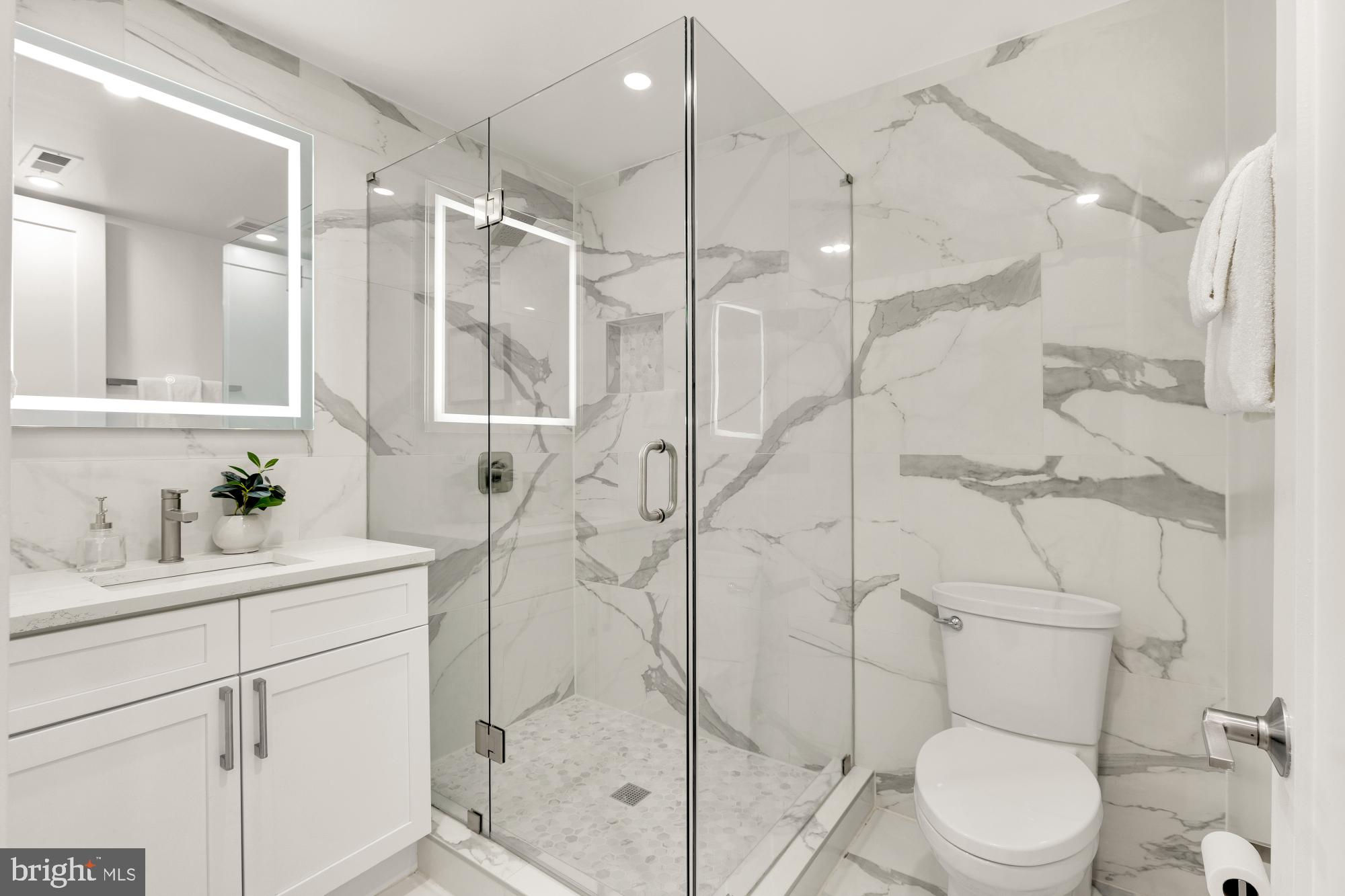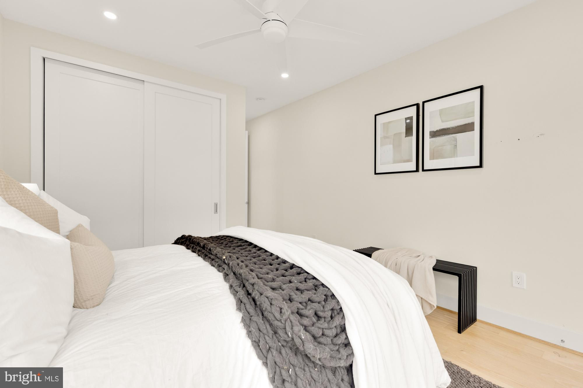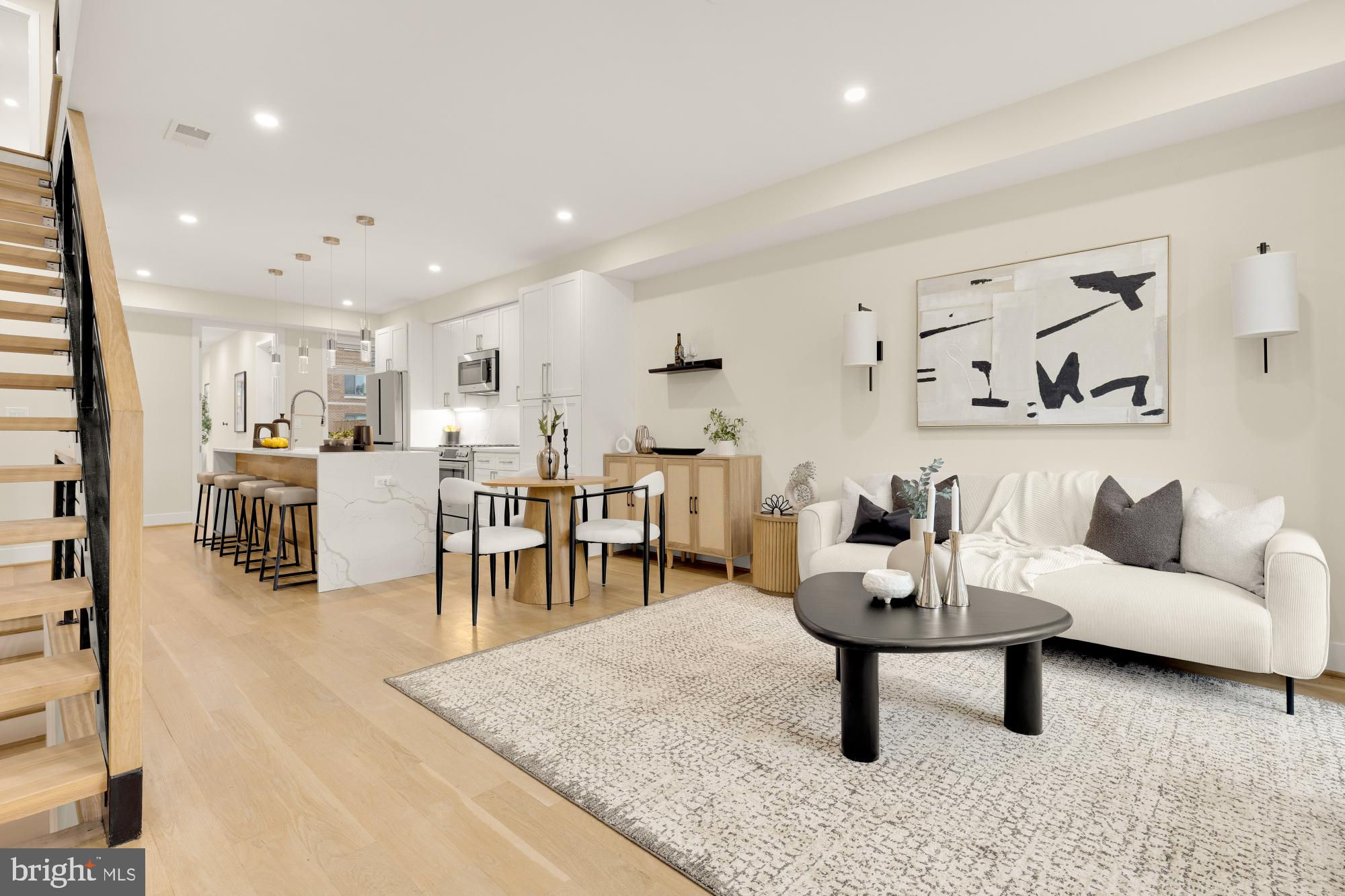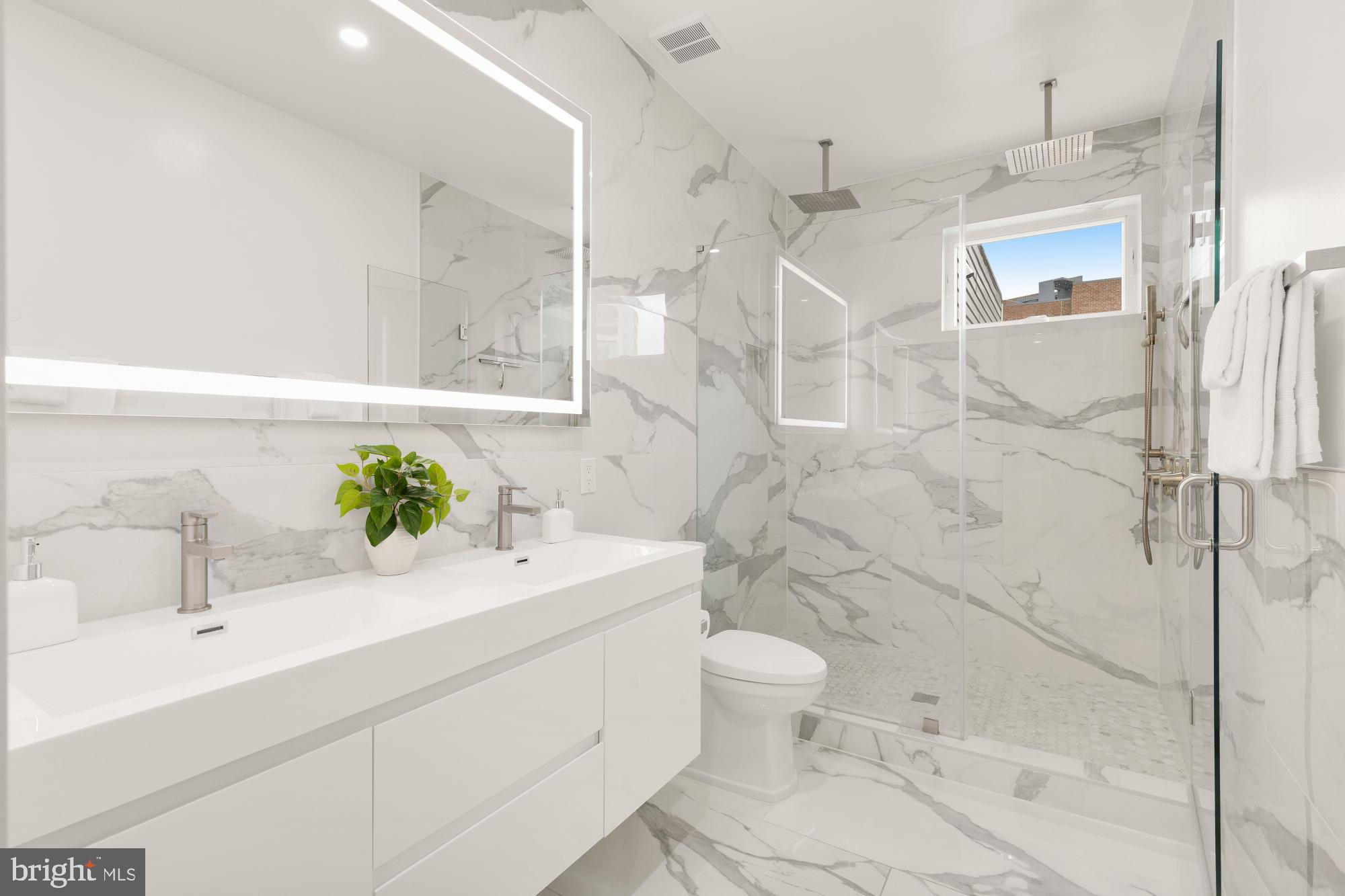Price improvement! Elevated city living awaits in this stunning two-level penthouse condo in the heart of Eckington, offering 3 bedrooms, 3.5 baths, and secure off-street parking. The main level welcomes you with an open-concept layout featuring a sun-drenched living room framed by a large picture window, a spacious dining area, and a gourmet kitchen outfitted with Calacatta Laza Quartz countertops, Bosch stainless steel appliances, and a generous center island. White oak hardwood floors run throughout, complemented by soaring ceilings and 8-foot doors. A guest suite with a full bath and private balcony, along with a stylish powder room, complete the main level. Upstairs, the floating staircase leads to a serene primary suite with a spa-like bath, walk-in closet, and an additional guest suite with its own ensuite bath and private balcony. Each bathroom boasts modern floating vanities, LED mirrors, and waterfall shower heads. Natural light pours in through oversized windows and skylights, while the two private balconies offer perfect spots to sip your morning coffee or relax in the evening. Additional features include a modular IP video intercom system with electric door strike controls and a roll-up garage for secure parking. Ideally located near neighborhood favorites like Big Bear Cafe and Pub and the People, with Union Market, Trader Joe’s, Harris Teeter, Quincy Lane retail and the NoMa Metro all nearby.