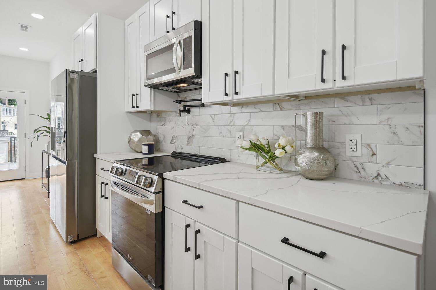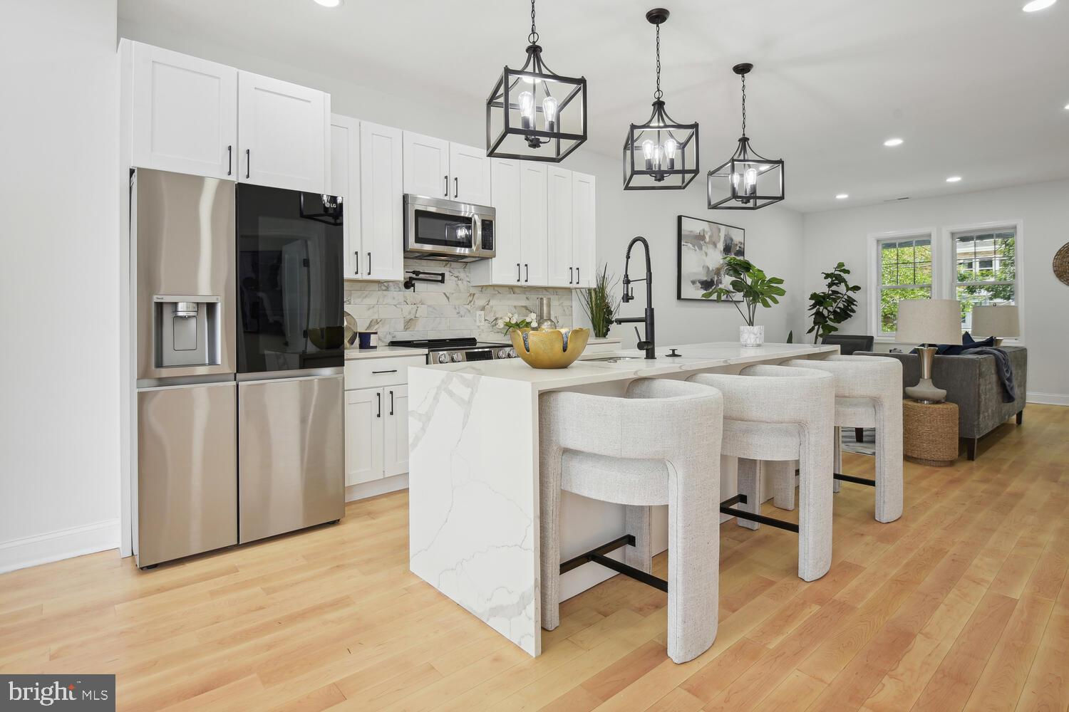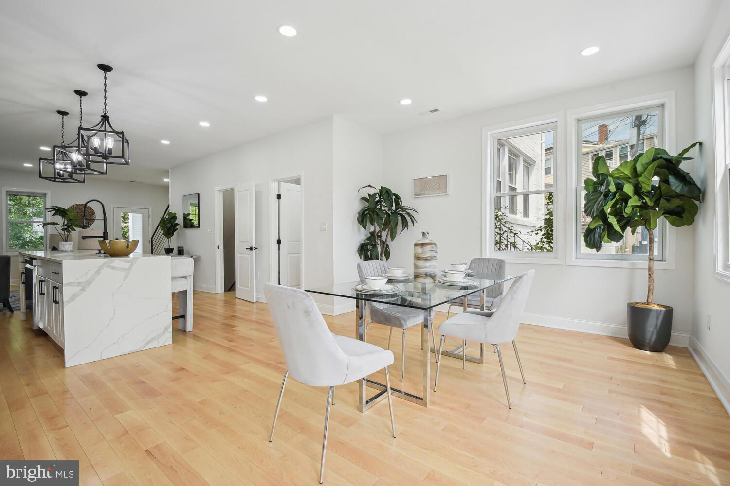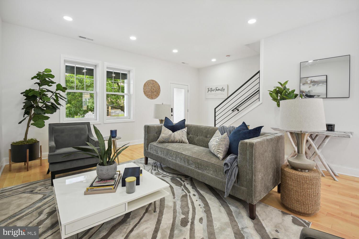 A custom-renovated home in the prestigious neighborhood of Petworth. With four bedrooms, three full bathrooms, and one-half bathroom, this modern-designed residence spans over 2,400+ square feet of luxurious living space. As you enter, you will be enthralled by the attention to detail and craftsmanship. The primary floor features an open-concept living room with bamboo hardwood floors, custom metal railings, soaring 10” ceilings, a powder room, and a collection of exquisite finishes. The living/kitchen/dining room areas provide an array of natural light and striking design. As you transcend from the living room, prepare to be captivated by its gourmet eat-in kitchen, a culinary sanctuary designed to delight even the most discriminating chef. Featuring an 8’ center island embellished with waterfall quartz countertops, high-end stainless-steel appliances, pot filler, and ample storage. From the kitchen/dining area is access to a 20x16 enclosed deck for privacy and entertaining. The second floor is home to three bedrooms, two full spa-like bathrooms, and a full-size washer/washer laundry room. The spacious en-suite primary bedroom offers a walkout balcony. The two remaining bedrooms share the common area bath with custom marble and ceramic finishes. The lower level features a family/recreation room, 4th bedroom or office, full spa-like bathroom, laundry room, and fully functional kitchen including stove, dishwasher, microwave, and fitted full-size refrigerator. Could easily serve as an income-producing unit. This home offers a perfect blend of tranquility and convenience. Easy access to parks, coffee shops, Petworth-Metro Station, and a host of restaurants and bars. Don't miss this opportunity to own one of Petworth’s most unique custom-built homes.