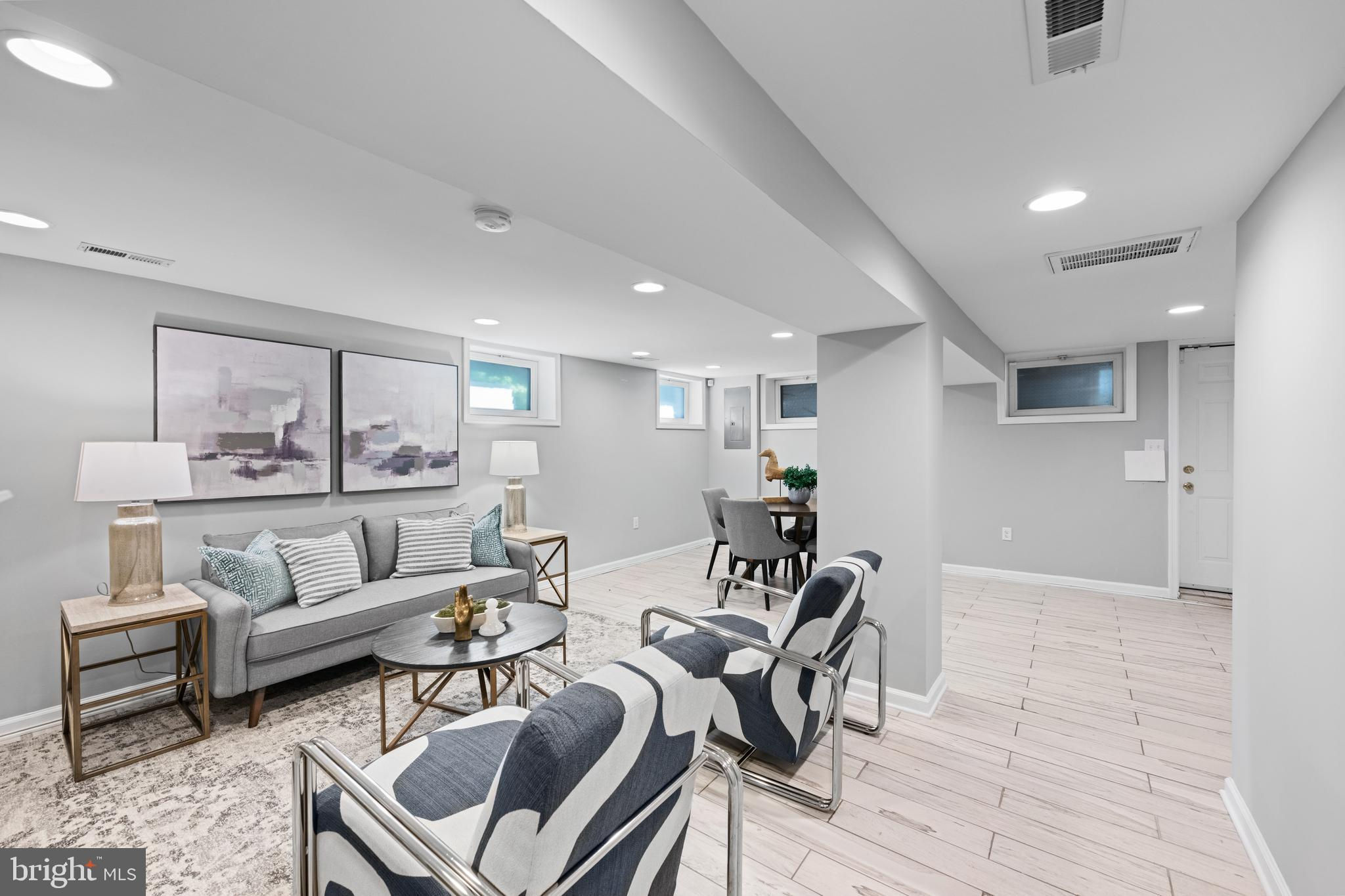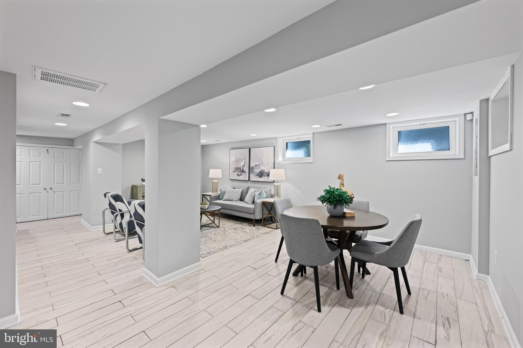 Charming Brookland End-Unit! This beautifully updated 3-bedroom, 2-bath home blends modern convenience with timeless appeal. Set on a large corner lot, the residence welcomes you with an idyllic, spacious front porch and a sun-filled living room featuring a brick-surround fireplace with classic mantel. Gorgeous hardwood floors flow throughout, leading to a formal dining area and an open galley-style kitchen with quartz countertops, stainless steel appliances, and a center island with breakfast bar seating. A dedicated main-level office offers the perfect work-from-home space or den/playroom. The upper-level has boasts 3 large bedrooms and a sleek hall bath with a double vanity and skylight. The completely finished lower level provides flexible space for a rec. room, play area, or additional living space, and includes a full bath—ideal for guests—as well as direct access to the rear yard. Parking is abundant with a two-car parking pad plus a detached garage. As an end-unit rowhome, this property offers extra light, privacy, and outdoor lawn space in front and back. Conveniently located within walking distance to the vibrant Monroe Market, and Brookland Metro, and multiple schools, playgrounds, and daycare centers, this home truly has it all. Please note: Square footage is estimated and calculated by an independent third party; information is deemed accurate but not guaranteed.
