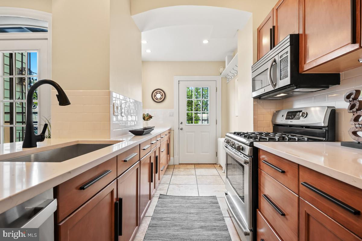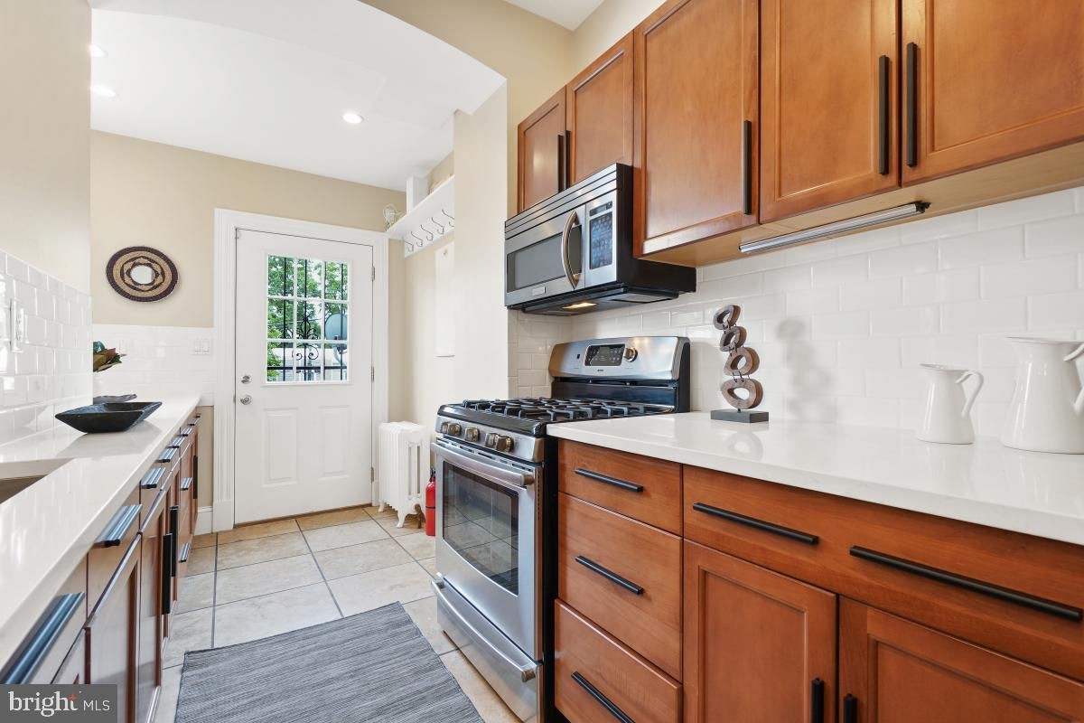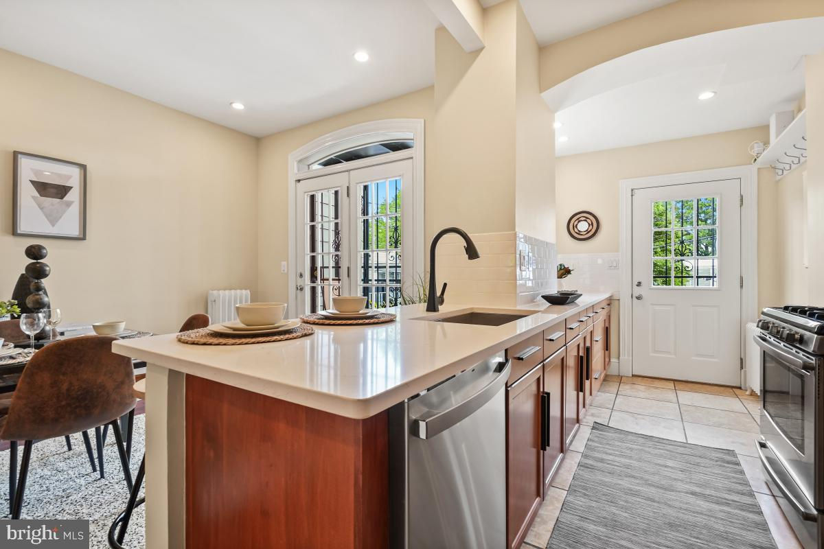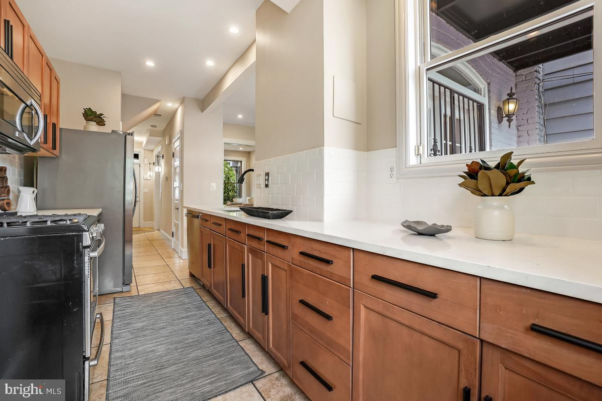 Inspired renovation in this 1915 porch-front in Park View. Urban and tasteful -- thoughtful design. Cook's kitchen with new large white quartz breakfast bar, white subway tile, stainless appliances, sweeps of counter space, open and fresh. Dining room with French doors overlooking large south-facing terrace - great for dining, sunning, reading and enjoying your flowers and herbs! Spacious living room - high ceilings, bright! Three bedrooms, two full baths up. WONDERFULLY INVITING lower level family room with good ceiling height, gas fireplace, and full bath. So many outdoor spaces - a delightful terrace, two balconies off two of the bedrooms, and a front porch! GARAGE. Short walk to top rated wine bar, St Vincent, Doubles coffee shop, and just down the block from Aurora Market, a corner market featuring a coffee bar and sandwich shop! LOADS OF UPDATES: New A/C - 2022 New refrigerator - 2023 Dishwasher - 2021 Basement vinyl planking floors - 2019 Relined furnace and water heater chimney flue - 2019 Roof - 2014 Upstairs windows - 2012 Thermostat upgrade - 2021 Garbage disposal - 2020