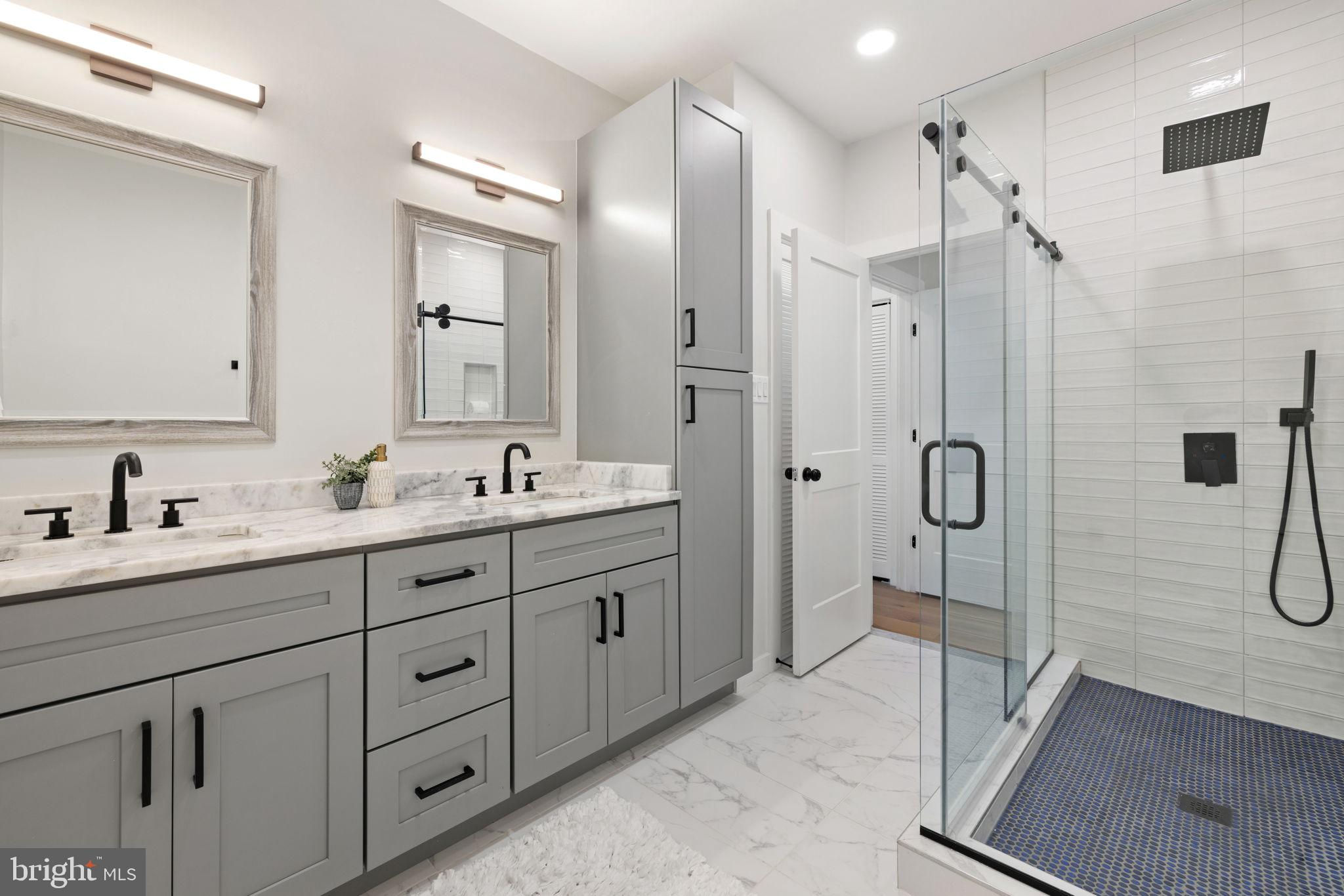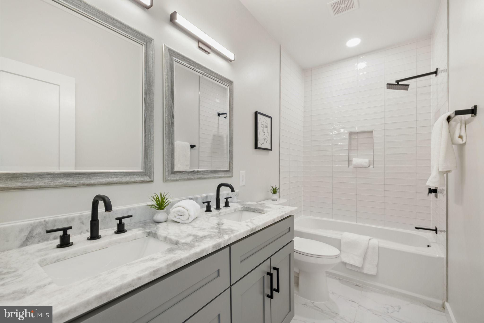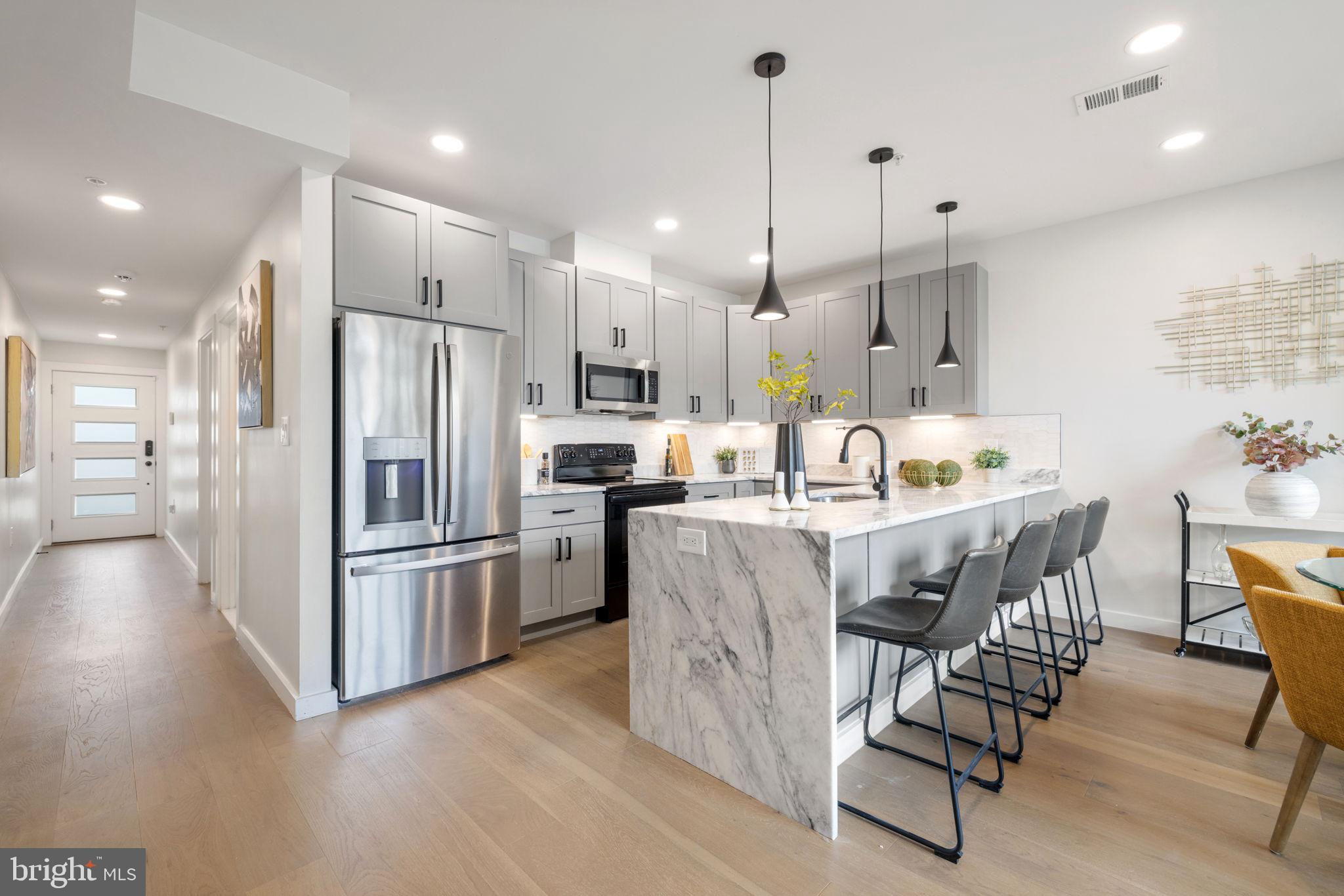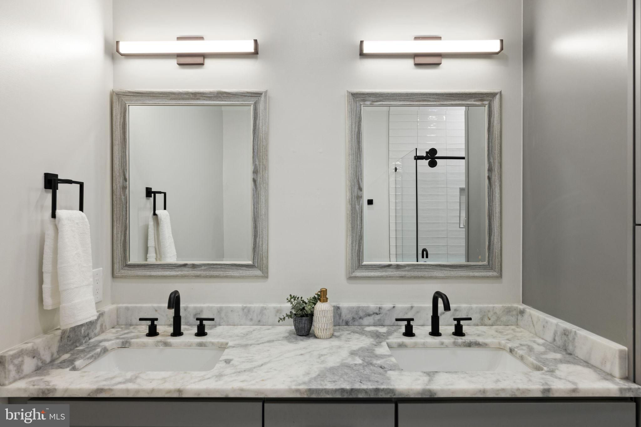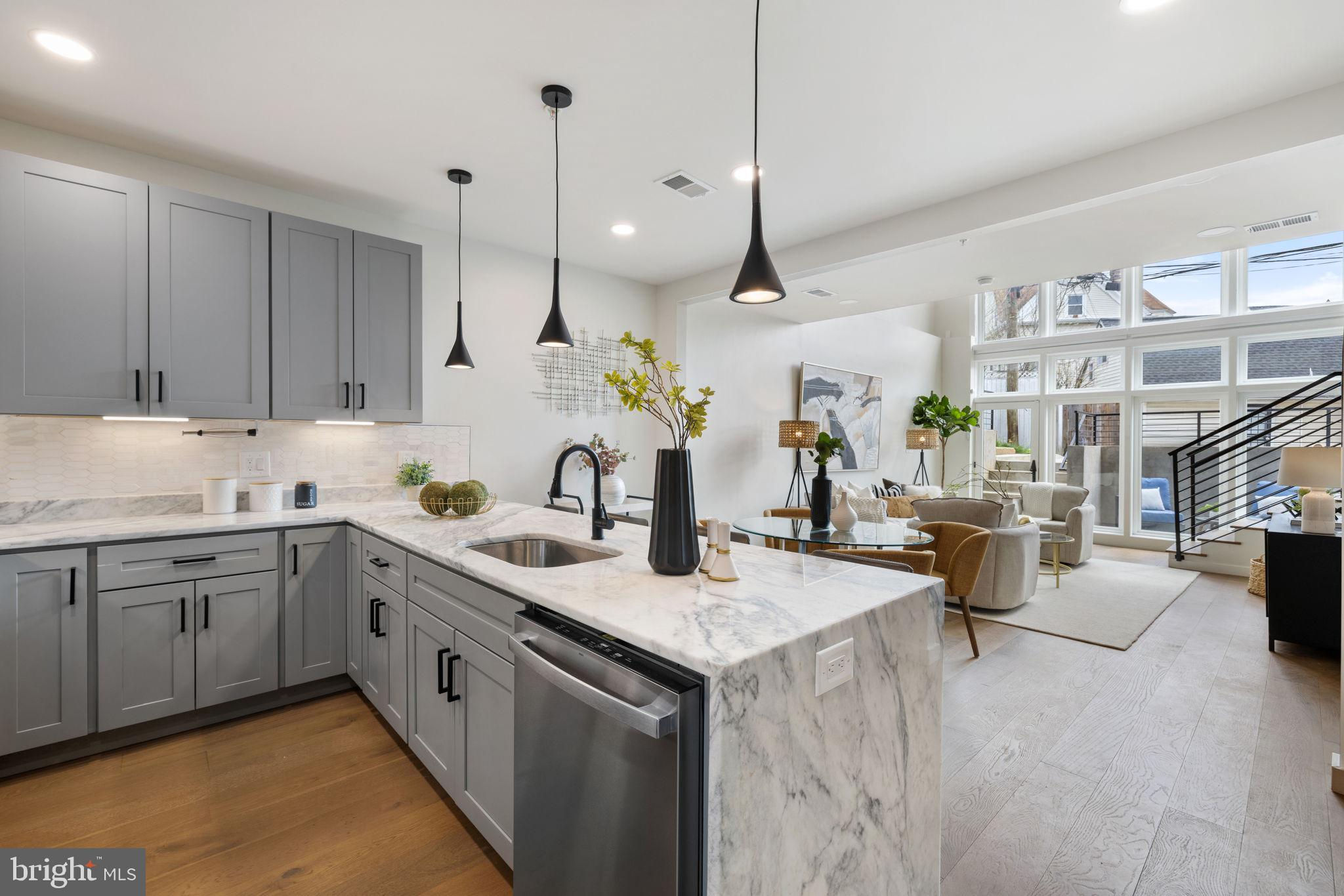 Best Value in the Neighborhood! Welcome to contemporary living in the vibrant Petworth! This stunning 3 bed/3.5 bath condo boasts over 1,800 square feet of space spread across two levels, offering a modern and spacious living experience. As you step into the dramatic double-height living room, you'll be greeted by floor-to-ceiling windows that flood the unit with natural light, creating a bright and inviting atmosphere. Custom motorized shades provide the flexibility to adjust for privacy, while the white oak floors seamlessly connect the living spaces. The open kitchen is a focal point, featuring stylish gray Shaker-style cabinets, quartz countertops, and a massive breakfast bar, perfect for entertaining guests or enjoying casual meals. Upstairs, the large primary suite is a luxurious retreat, offering ample space for a king-size bed and a massive walk-in closet. Custom black-out drapes ensure a peaceful night's sleep, while the en suite bath impresses with dual vanities, a large shower, and abundant storage. The guest bedroom doubles as a bright office, with an additional guest bath conveniently located on the same level. The third bedroom on the main level provides a private retreat for guests, complete with a built-in Murphy bed and an en suite bath. Located in a boutique building, this condo offers the best of both worlds – a peaceful residential setting near the heart of Petworth, with easy access to the vibrant dining scene on Upshur Street, Petworth Metro, Safeway, Yes! Organic, and more. Potential parking too - ask for more details.