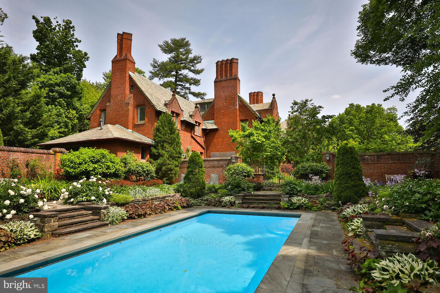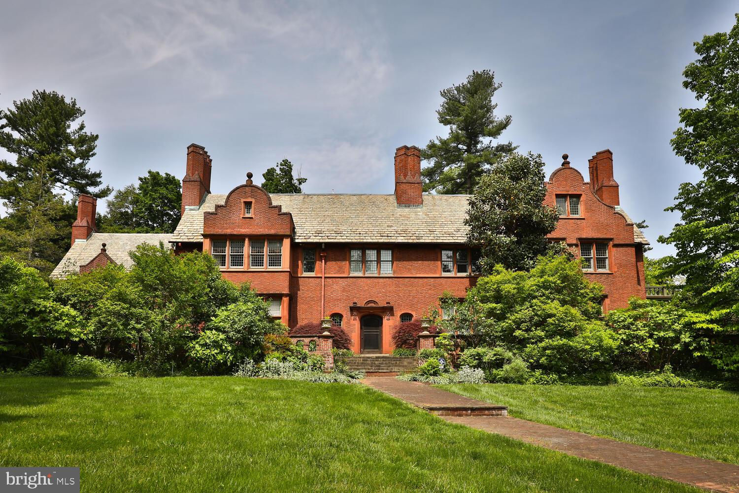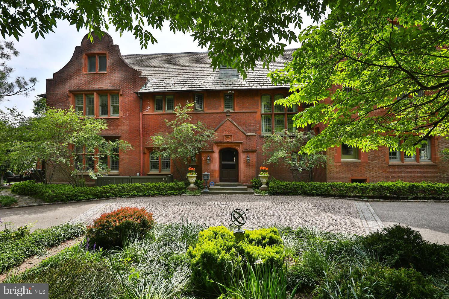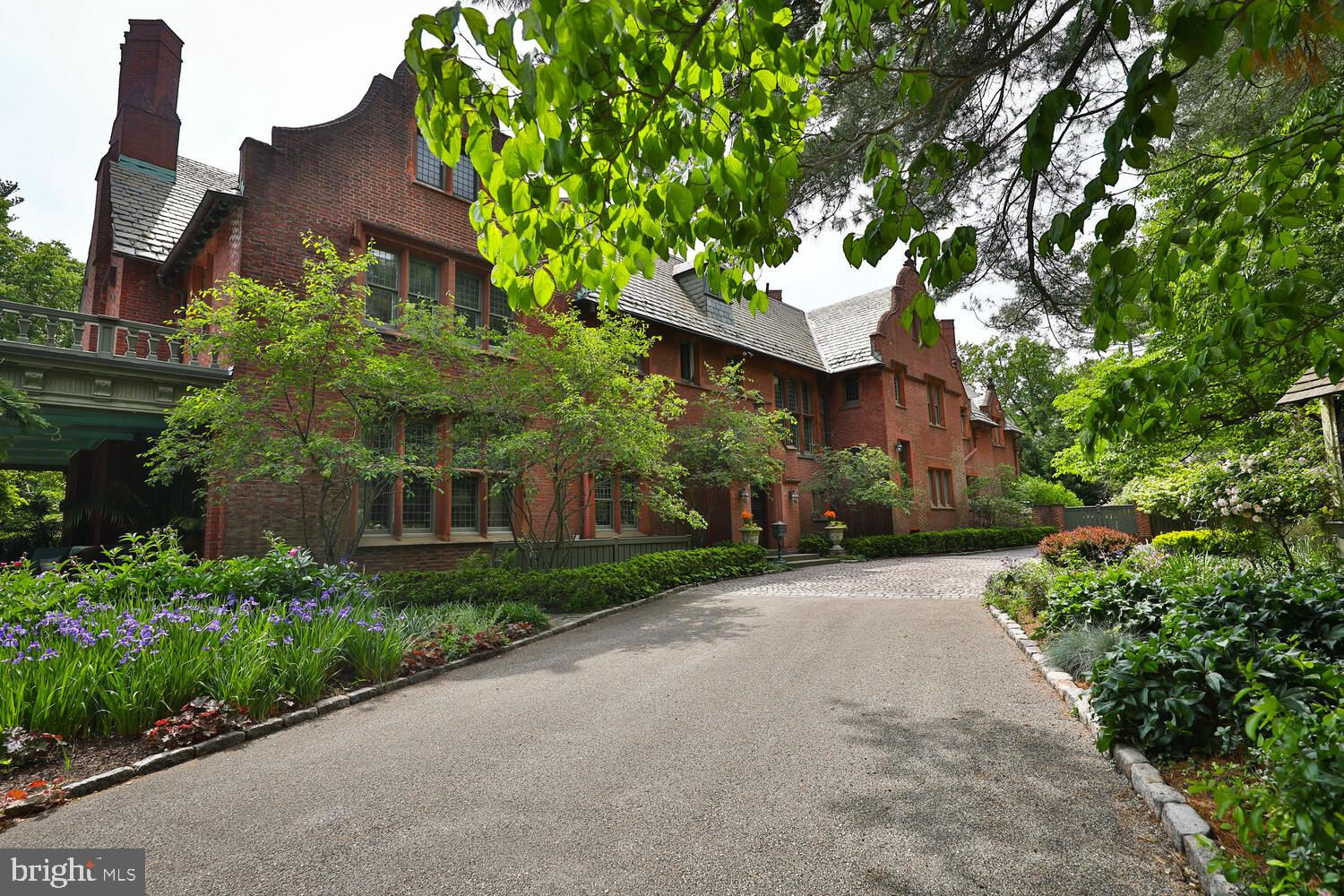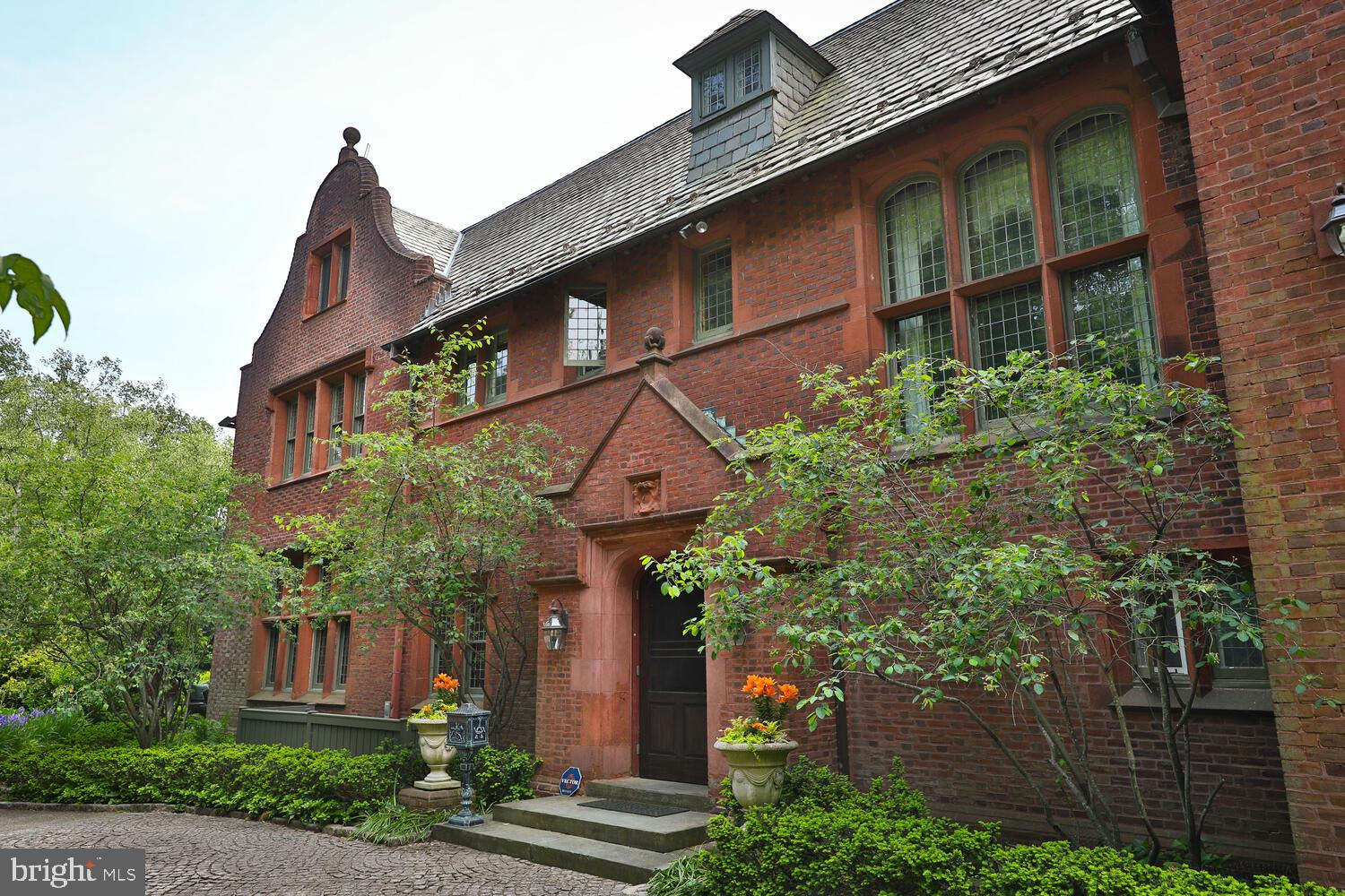 Every year, Americans scramble to the UK to walk the streets filled with history, and tour fine old houses. Why bother when you can own one of those fine homes, right here, in Philadelphia. Once in a generation opportunity to own one of the most significant properties in the city, "Binderton" was designed by Cope & Stewardson Architects (also designed for University of Pennsylvania and Princeton). The house was started in 1903 and finished in 1906. The renowned landscape architecture firm of the Olmsted Brothers was engaged to handle landscape, hardscape, and garden design. During their ownership, the present owners purchased 461 W Chestnut Hill Ave. (which had been subdivided from the original plot many years earlier) demolished the modest house that existed , and expanded the property and gardens, and redesigned the driveway. Situated on the quietest street in Chestnut Hill and surrounded by homes of equal caliber, Binderton stands out with its brilliant red brick construction and distinctive Jacobean Revival (or Jacobethan) style , with shaped parapets, and intricately designed chimneys. In most places, the house is designed only one room deep and was built linearly, near the property line at the high side. The brilliance of the Olmsted Brothers work is apparent in the brick walkway that rises elegantly from Towanda Street up a gradual hill with a low step every 20 feet or so. From the stone patio, enter the front door into the formal entry hall with main staircase at the back. The foyer is filled with natural light from two sides, a fireplace, a powder room, and a large coat room with window. Again from the entry hall, walk into, what was called in 1906, the "Ladies' Parlor", a sunny, elegant sitting room with big windows and a fireplace. The formal living room with two distinct seating areas, beamed ceiling , and wood burning fireplace can be accessed from the "ladies' parlor" or directly from a hallway. The exterior door off the living room leads to an open air loggia with tiled floor and finished ceiling. To the left of the front door, head to the formal dining room with fireplace, elegant crystal chandelier and room for a second dining table! The kitchen has everything you want. From the front hall, head through the butler's pantry with lighted cabinetry, porcelain sink , and dishwasher: a great spot to set up the bar on party nights. Further on you reach the supersized chef's kitchen with two sinks, three ovens, a six-burner range, banquette seating for conversation while prepping dinner, stools at the counter for breakfasts on a busy day, and a big table at the end of the house for casual dinners. Off the kitchen is a huge pantry area and laundry room. Beyond the kitchen end is a glassed in garden porch that will serve myriad functions that make daily living more convenient. Head up the carved and turned staircase and turn left at the top to reach the primary suite, that includes the bedroom with fireplace and door to second floor balcony, a cozy sitting room, great for reading or streaming late into the night, a beautiful, bright corner office/den, and a spacious bathroom with two sinks and walk-in shower. On the second floor to the right of the main stair are four additional bedrooms, two of which share a jack-and-jill bath ; and two others that share an additional hall bath. The third floor has three bedrooms, a full bath, and a large central room, perfect for play or privacy. The 1.6 acres that surround the house defy description. Mature trees, abundant perennial beds, lush lawns, and garden rooms; one prettier than the next. The main focus in the summer is the pool area. Exquisitely private with its walled garden, and elegant brick veranda, it is here where you can escape from the sun and the world. Built to span the ages, Binderton will pass to someone who loves grand old houses and understands stewardship.