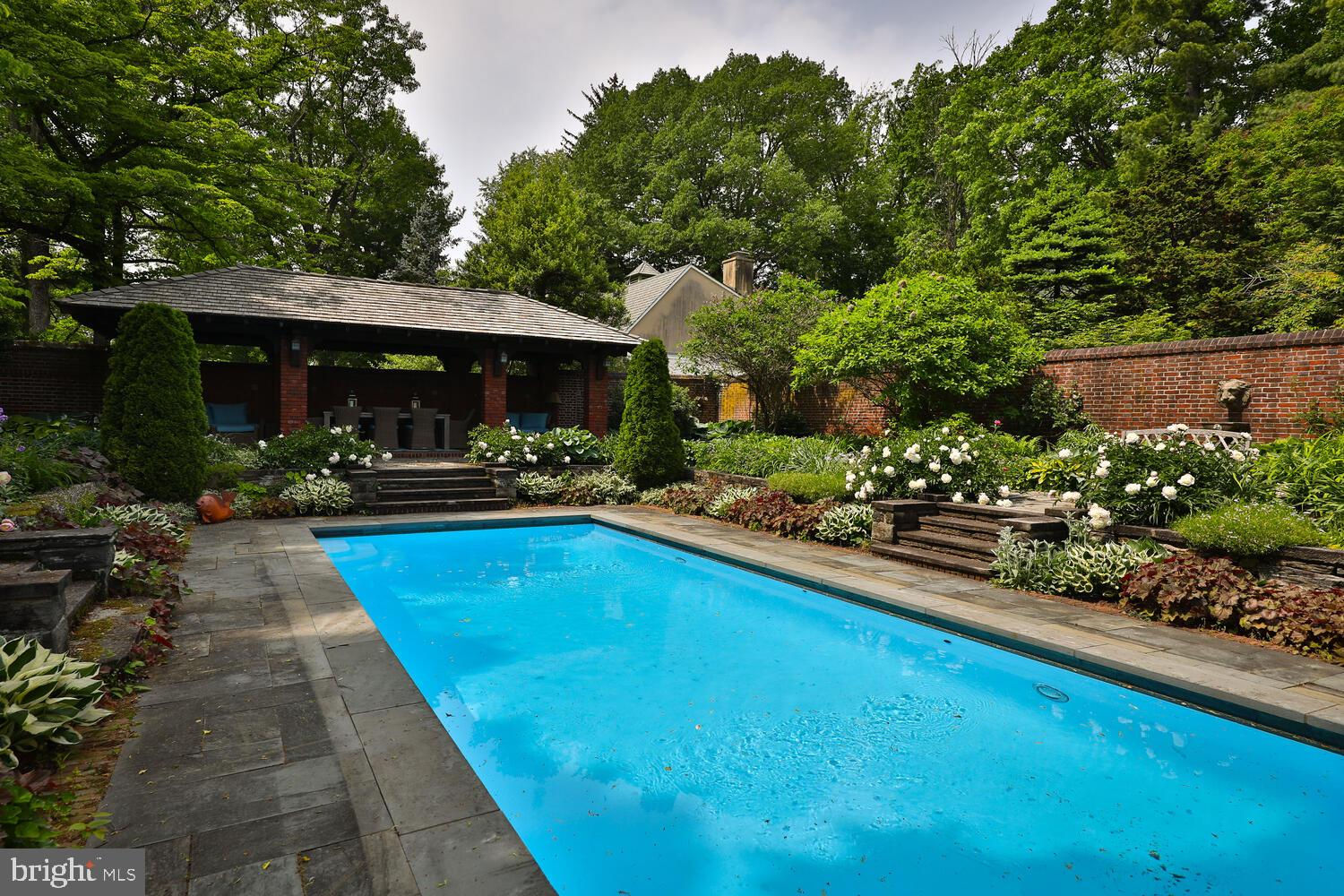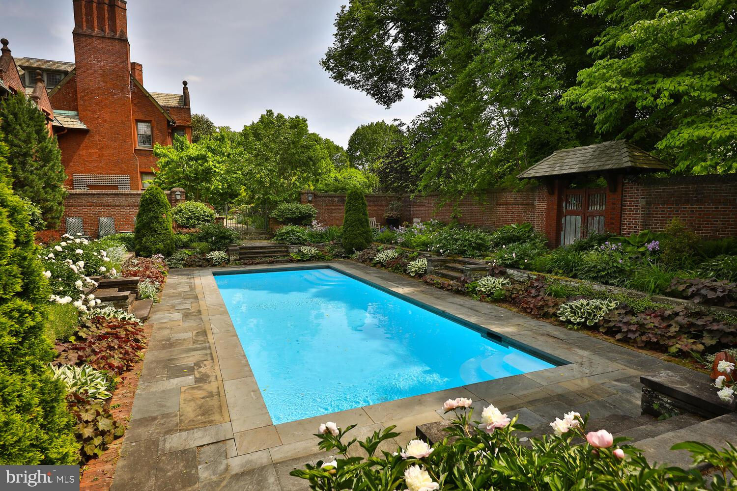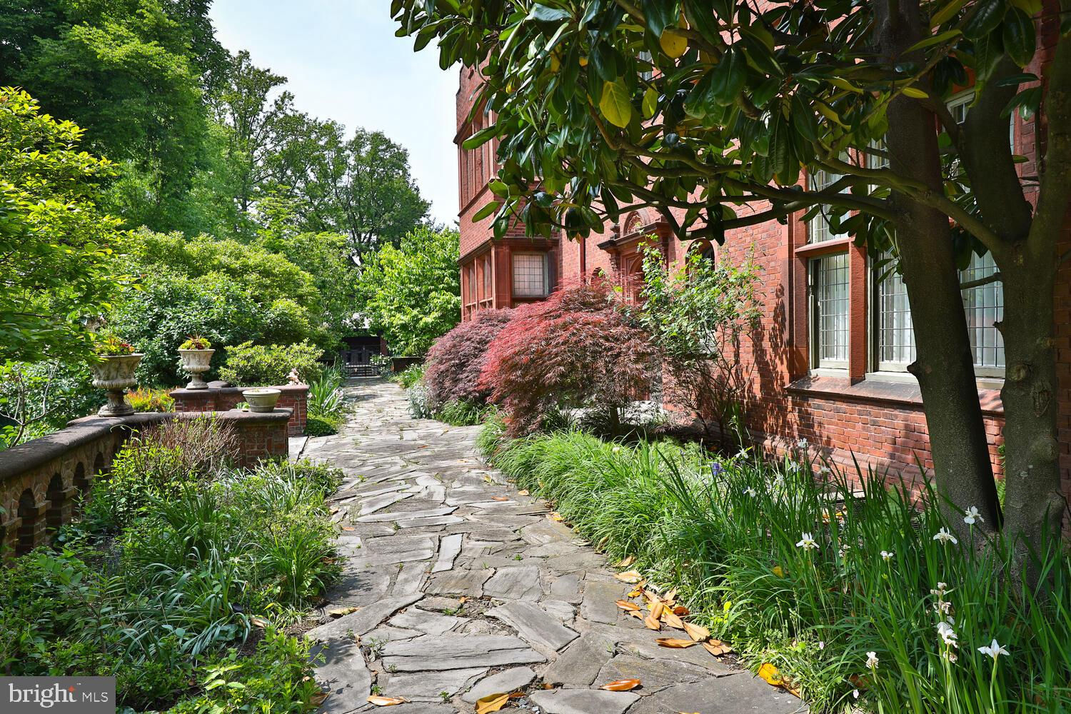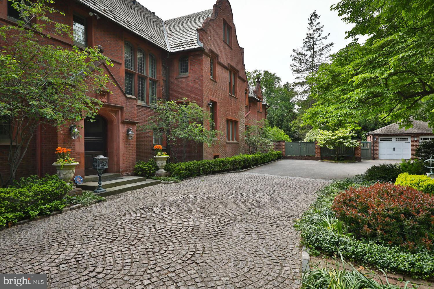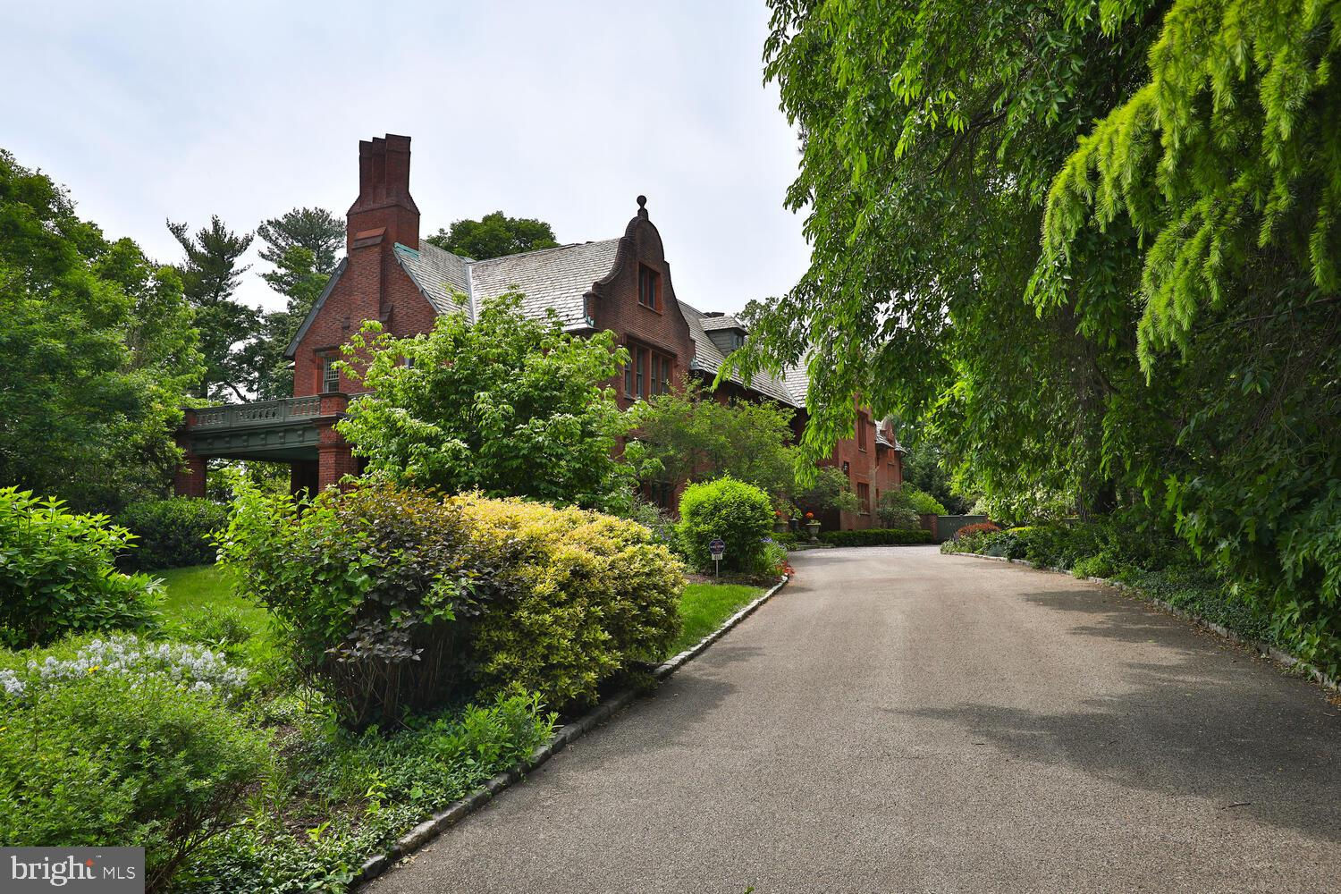 Every year, Americans scramble to the UK to walk the streets filled with history, and tour fine old houses. Why bother when you can own one of those fine homes, right here, in Philadelphia. Once in a generation opportunity to own one of the most significant properties in the city, "Binderton" was designed by Cope & Stewardson Architects (also designed for University of Pennsylvania and Princeton). The house was started in 1903 and finished in 1906. The renowned landscape architecture firm of the Olmsted Brothers was engaged to handle landscape, hardscape, and garden design. During their ownership, the present owners purchased 461 W Chestnut Hill Ave. (which had been subdivided from the original plot many years earlier) demolished the modest house that existed , and expanded the property and gardens, and redesigned the driveway. Situated on the quietest street in Chestnut Hill and surrounded by homes of equal caliber, Binderton stands out with its brilliant red brick construction and distinctive Jacobean Revival (or Jacobethan) style , with shaped parapets, and intricately designed chimneys. In most places, the house is designed only one room deep and was built linearly, near the property line at the high side. The brilliance of the Olmsted Brothers work is apparent in the brick walkway that rises elegantly from Towanda Street up a gradual hill with a low step every 20 feet or so. From the stone patio, enter the front door into the formal entry hall with main staircase at the back. The foyer is filled with natural light from two sides, a fireplace, a powder room, and a large coat room with window. Again from the entry hall, walk into, what was called in 1906, the "Ladies' Parlor", a sunny, elegant sitting room with big windows and a fireplace. The formal living room with two distinct seating areas, beamed ceiling , and wood burning fireplace can be accessed from the "ladies' parlor" or directly from a hallway. The exterior door off the living room leads to an open air loggia with tiled floor and finished ceiling. To the left of the front door, head to the formal dining room with fireplace, elegant crystal chandelier and room for a second dining table! The kitchen has everything you want. From the front hall, head through the butler's pantry with lighted cabinetry, porcelain sink , and dishwasher: a great spot to set up the bar on party nights. Further on you reach the supersized chef's kitchen with two sinks, three ovens, a six-burner range, banquette seating for conversation while prepping dinner, stools at the counter for breakfasts on a busy day, and a big table at the end of the house for casual dinners. Off the kitchen is a huge pantry area and laundry room. Beyond the kitchen end is a glassed in garden porch that will serve myriad functions that make daily living more convenient. Head up the carved and turned staircase and turn left at the top to reach the primary suite, that includes the bedroom with fireplace and door to second floor balcony, a cozy sitting room, great for reading or streaming late into the night, a beautiful, bright corner office/den, and a spacious bathroom with two sinks and walk-in shower. On the second floor to the right of the main stair are four additional bedrooms, two of which share a jack-and-jill bath ; and two others that share an additional hall bath. The third floor has three bedrooms, a full bath, and a large central room, perfect for play or privacy. The 1.6 acres that surround the house defy description. Mature trees, abundant perennial beds, lush lawns, and garden rooms; one prettier than the next. The main focus in the summer is the pool area. Exquisitely private with its walled garden, and elegant brick veranda, it is here where you can escape from the sun and the world. Built to span the ages, Binderton will pass to someone who loves grand old houses and understands stewardship.