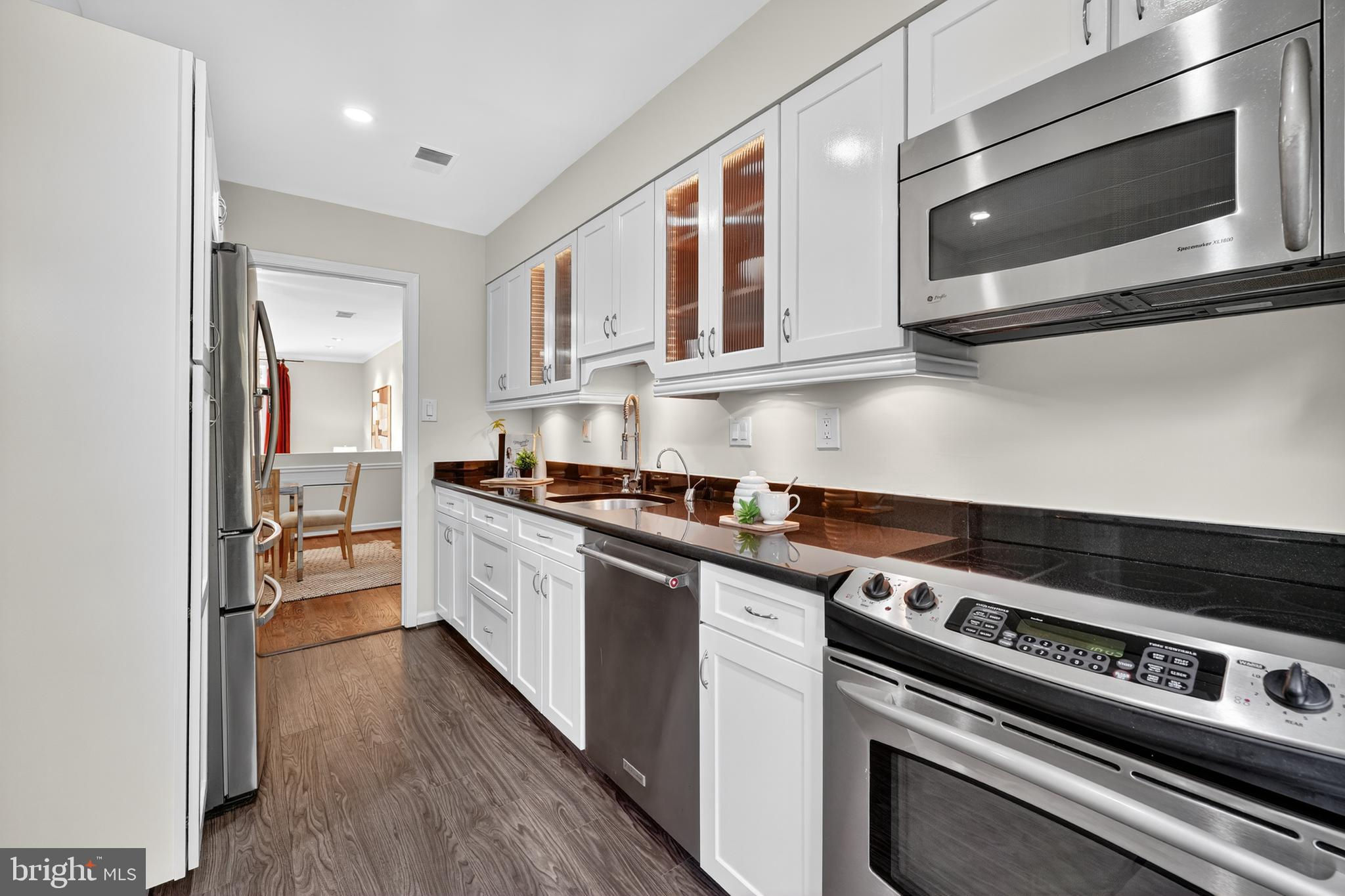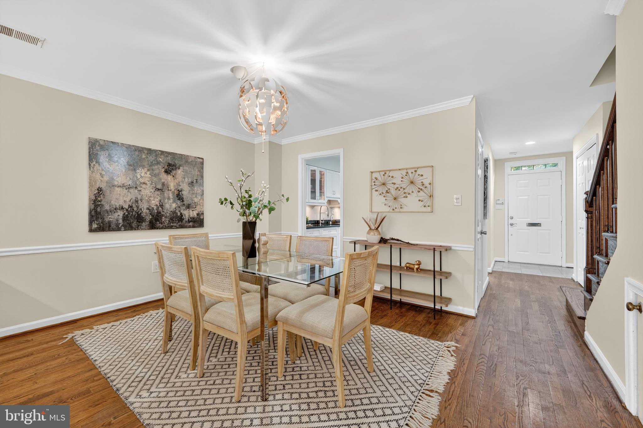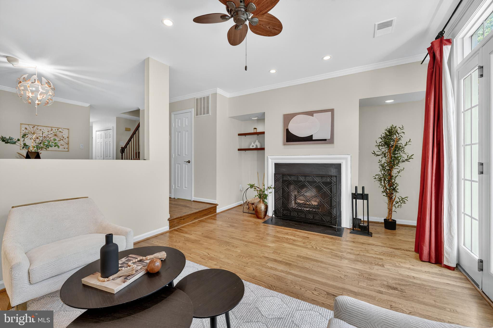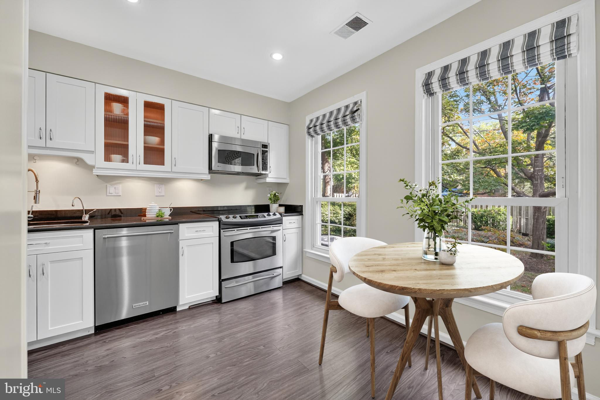 Nestled in the charming Beverly Hills Manor community, this delightful 3-bedroom, 3.5-bath townhome offers a thoughtfully designed and beautifully updated living space. Step inside to a light-filled main level featuring gleaming hardwood floors and recessed lighting. The kitchen is a true culinary delight with white cabinetry, stainless steel appliances, including a KitchenAid dishwasher and Samsung French door fridge (2022), granite countertops, and a cozy breakfast area framed by large windows overlooking the peaceful front common green space. The warm and inviting living room, paired with an adjacent formal dining area accented by an updated light fixture, serves as the heart of the home. A beautiful wood-burning fireplace, floating shelves, and French doors leading to the rear patio create a seamless blend of indoor comfort and outdoor enjoyment. A stylish powder room and a laundry closet with stacked washer and dryer complete this level. Upstairs, you’ll find two spacious bedroom suites, each featuring ceiling fans, customized walk-in closets, and private en-suite baths with tiled tub/shower combinations and contemporary vanities. The top level offers versatility as a home office or third bedroom, complete with plush carpeting, two skylights that can open for fresh air during the cooler seasons, ample closet space, and an en-suite bath with custom tile and a tub/shower combo. Step outside to your private patio, a perfect spot for morning coffee or evening gatherings under the stars. The newly fenced (2020) low-maintenance backyard with stone patio and retaining wall provides a peaceful outdoor oasis. Thoughtful updates include HVAC (2023), water heater (2023), roof (2018), Ecobee thermostat (2025), and crawlspace insulation (2020). Parking is a breeze with an assigned off-street space, plus 3 additional parking passes that convey. Ideally located within a mile of the legendary Birchmere and Del Ray’s charming shops and restaurants, and just minutes to Old Town Alexandria, multiple Metro stations, and the Four Mile Run Trail connecting directly to the W&OD Trail—this home truly has it all. Don’t miss it!