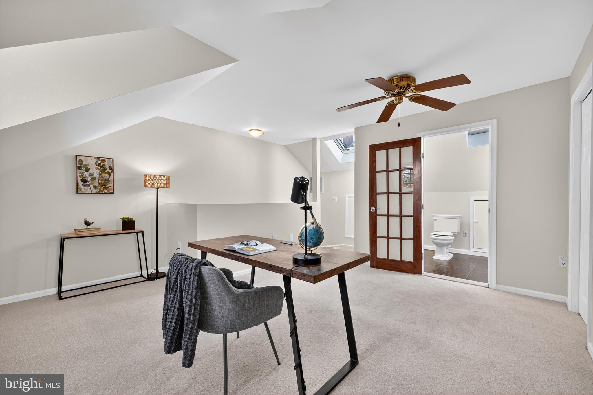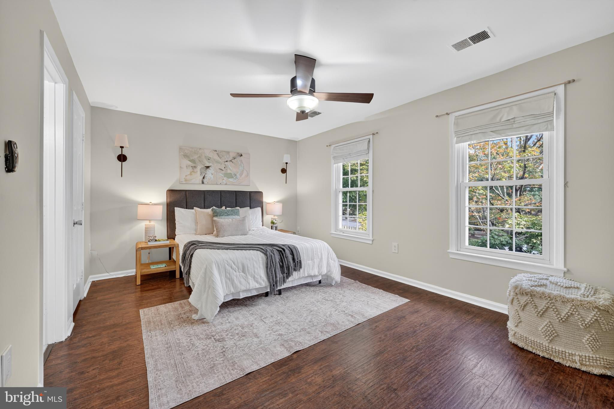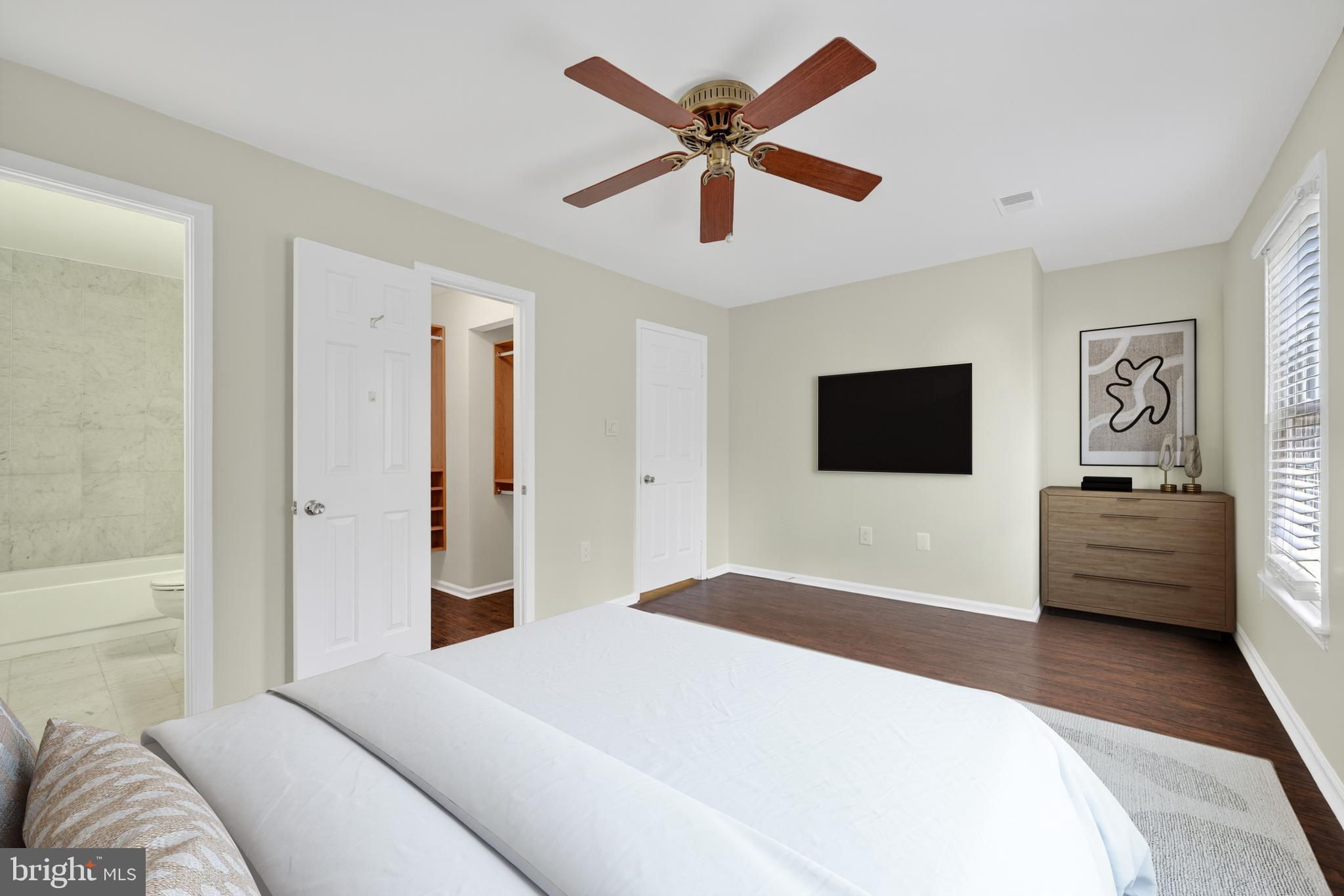 Nestled in the charming Beverly Hills Manor community, this delightful 3-bedroom, 3.5-bath townhome offers a thoughtfully designed and beautifully updated living space. Step inside to a light-filled main level featuring gleaming hardwood floors and recessed lighting. The kitchen is a true culinary delight with white cabinetry, stainless steel appliances, including a KitchenAid dishwasher and Samsung French door fridge (2022), granite countertops, and a cozy breakfast area framed by large windows overlooking the peaceful front common green space. The warm and inviting living room, paired with an adjacent formal dining area accented by an updated light fixture, serves as the heart of the home. A beautiful wood-burning fireplace, floating shelves, and French doors leading to the rear patio create a seamless blend of indoor comfort and outdoor enjoyment. A stylish powder room and a laundry closet with stacked washer and dryer complete this level. Upstairs, you’ll find two spacious bedroom suites, each featuring ceiling fans, customized walk-in closets, and private en-suite baths with tiled tub/shower combinations and contemporary vanities. The top level offers versatility as a home office or third bedroom, complete with plush carpeting, two skylights that can open for fresh air during the cooler seasons, ample closet space, and an en-suite bath with custom tile and a tub/shower combo. Step outside to your private patio, a perfect spot for morning coffee or evening gatherings under the stars. The newly fenced (2020) low-maintenance backyard with stone patio and retaining wall provides a peaceful outdoor oasis. Thoughtful updates include HVAC (2023), water heater (2023), roof (2018), Ecobee thermostat (2025), and crawlspace insulation (2020). Parking is a breeze with an assigned off-street space, plus 3 additional parking passes that convey. Ideally located within a mile of the legendary Birchmere and Del Ray’s charming shops and restaurants, and just minutes to Old Town Alexandria, multiple Metro stations, and the Four Mile Run Trail connecting directly to the W&OD Trail—this home truly has it all. Don’t miss it!