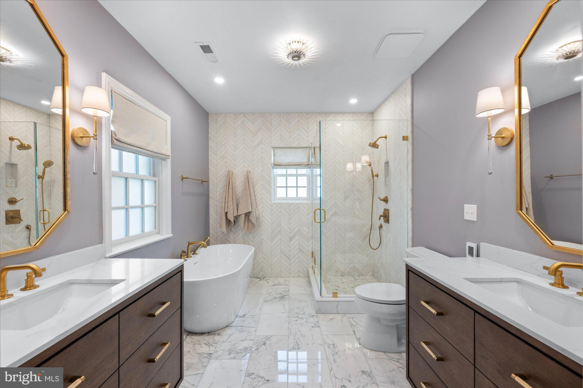 This is one of those truly magical homes that captures your heart the moment you step through the front door. Beautifully preserved, the home's original charm blends seamlessly, integrating modern amenities and luxurious finishes. Ideally located just steps from historic Battery Kemble Park with popular nature trails, a great sledding hill and a doggie meet-n-greet, this home offers an urban lifestyle with a serene, suburban feel. Walk out the door into the park-like backyard and leave your stress behind. Nestled among towering trees and lush, thoughtfully designed landscaping with specimen plantings, it provides exceptional outdoor spaces for summer entertaining, relaxing or simply stargazing. The current Owners have invested in high-end and high impact upgrades elevating the home's comfort and style. Recent improvements include transforming the kitchen with a new entry, marble countertops, designer backsplash, top-of-the-line stainless steel appliances and new hardware. The private, main level Primary Suite with a vaulted ceiling, gorgeous garden views and access to the rear terrace now offers a newly renovated Primary Bath, a true sanctuary, complete with a luxurious soaking tub, glass enclosed walk-in shower, heated floors and double vanities. The Powder Room, second level Jack and Jill bathroom and hall bathroom have all been beautifully renovated, top-to-bottom. Other improvements include LED recessed lighting, new paint & carpet, neutral custom window treatments, new exterior & landscape lighting, new hardscaping with additional seating and play area, new exterior storage sheds, security lighting and more professional landscaping. Enjoy four gorgeous, finished levels flooded with natural light especially the dramatic two-story family room with walls of glass. Kick back in the big, daylight lower level with a wood burning fireplace, a game room/2nd home office and a large storage room with a full bathroom. Another perk is the off-street parking for 2-3 cars and a basketball hoop! All this and one of the best locations in the city. Pack your bags and make this your home today!