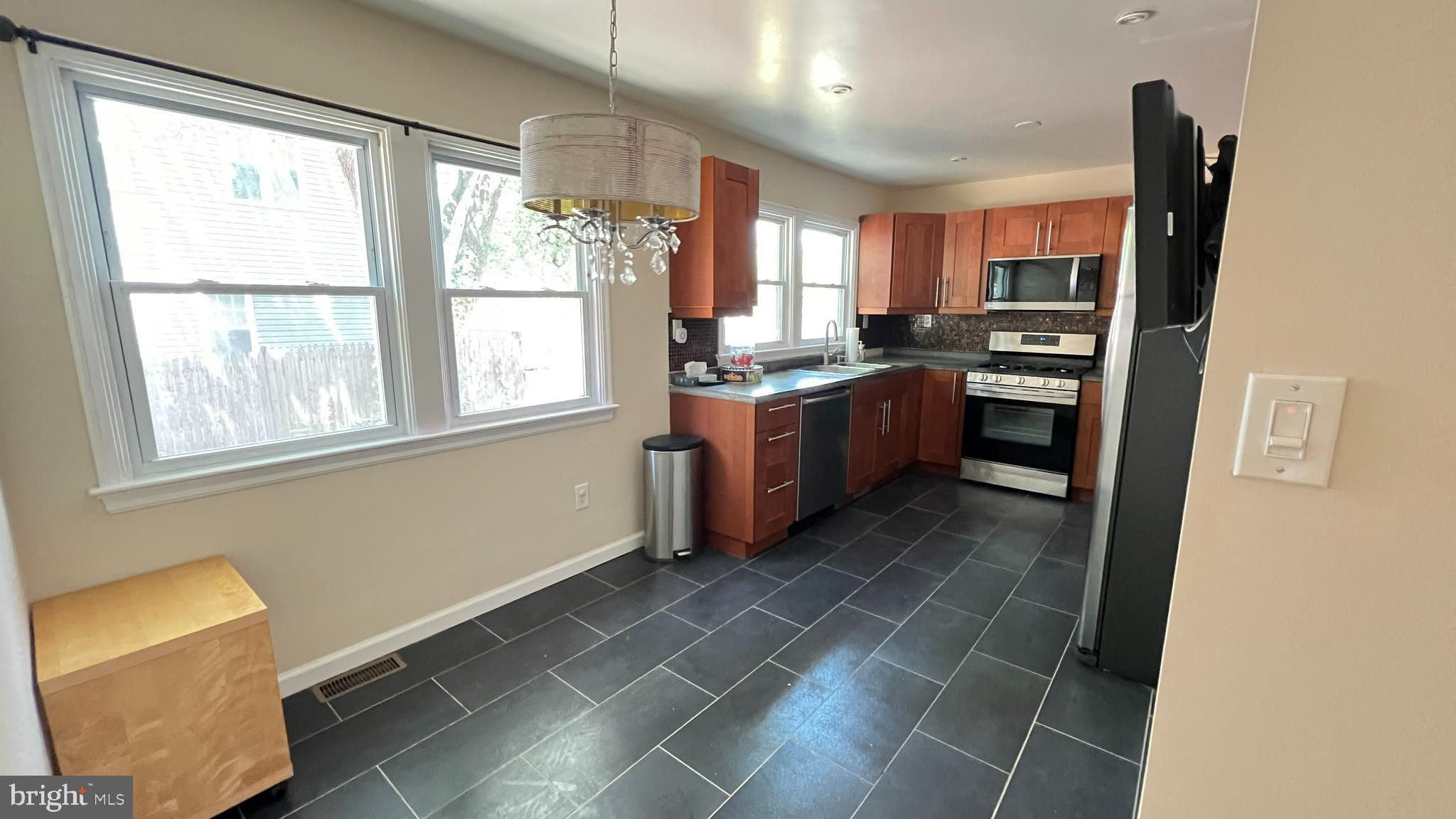 A single-family home on a corner lot featuring 5 bedrooms and 3 full baths with a carport and big yard. The top floor includes a spacious master bedroom with a walk-in closet, additional storage areas, and an en-suite bathroom, plus an office nook on the second floor outside the bedroom. The main level offers 2 bedrooms, 1 full bathroom, a cozy kitchen and dining room combination with stainless steel appliances a 32" TV, and a living room. The basement includes a separate area suitable for an in-law suite with 2 cozy bedrooms, a kitchenette, a separate entrance, and a separate washer and dryer. There is also a family room in the basement with an additional set of washers and dryers. This home has no carpet, and pets are allowed with landlord approval. The large yard features a big deck perfect for entertaining, and a fenced front and backyard with an unfenced driveway. The home is equipped with a high-efficiency, commercial-size gas hot water heater to accommodate large families and high water usage and central HVAC. The fenced yard includes a storage shed, carport, and ample parking spaces inside and alongside the house.