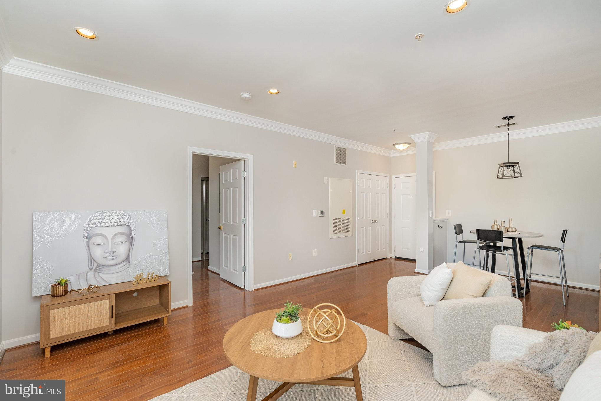 Discover the perfect blend of comfort and convenience in Alexandria at 4850 Eisenhower Ave #203. This beautifully maintained condo offers modern style, fresh updates, and an unbeatable location just under a mile from the Van Dorn Metro station, making commuting to Old Town Alexandria, Washington DC, the Pentagon, Amazon HQ2, and National Airport a breeze. Inside, you’ll find freshly painted interiors, soaring nine-foot ceilings, and brand new hardwood floors in the primary bedroom. This spacious two-bedroom, two-bathroom home is filled with natural light and designed for both relaxation and entertaining. The gourmet kitchen features granite countertops, stainless steel appliances, a gas range, tile floors, and generous cabinet space. The open-concept living and dining areas are accented with crown molding and hardwood floors, creating a warm and inviting atmosphere. Large windows frame serene courtyard views, which can also be enjoyed from your private patio. The courtyard itself is a peaceful retreat, complete with benches, sitting areas, and grills for outdoor gatherings. For added convenience, this home includes two designated garage parking spaces, two guest parking passes, a utility closet off the patio, and an in-unit washer and dryer. Residents of the Exchange at Van Dorn community enjoy a resort-style lifestyle with access to a large swimming pool, a fitness center, a basketball court, a business center, and a clubhouse featuring a great room with a cozy fireplace and a community room with a pool table. The community is pet-friendly and close to shopping, dining, and trails for biking and walking, with easy access to I-495 and major commuter routes. Don’t miss your chance to call this stunning condo home. Schedule your private showing today and experience the best of Alexandria living.