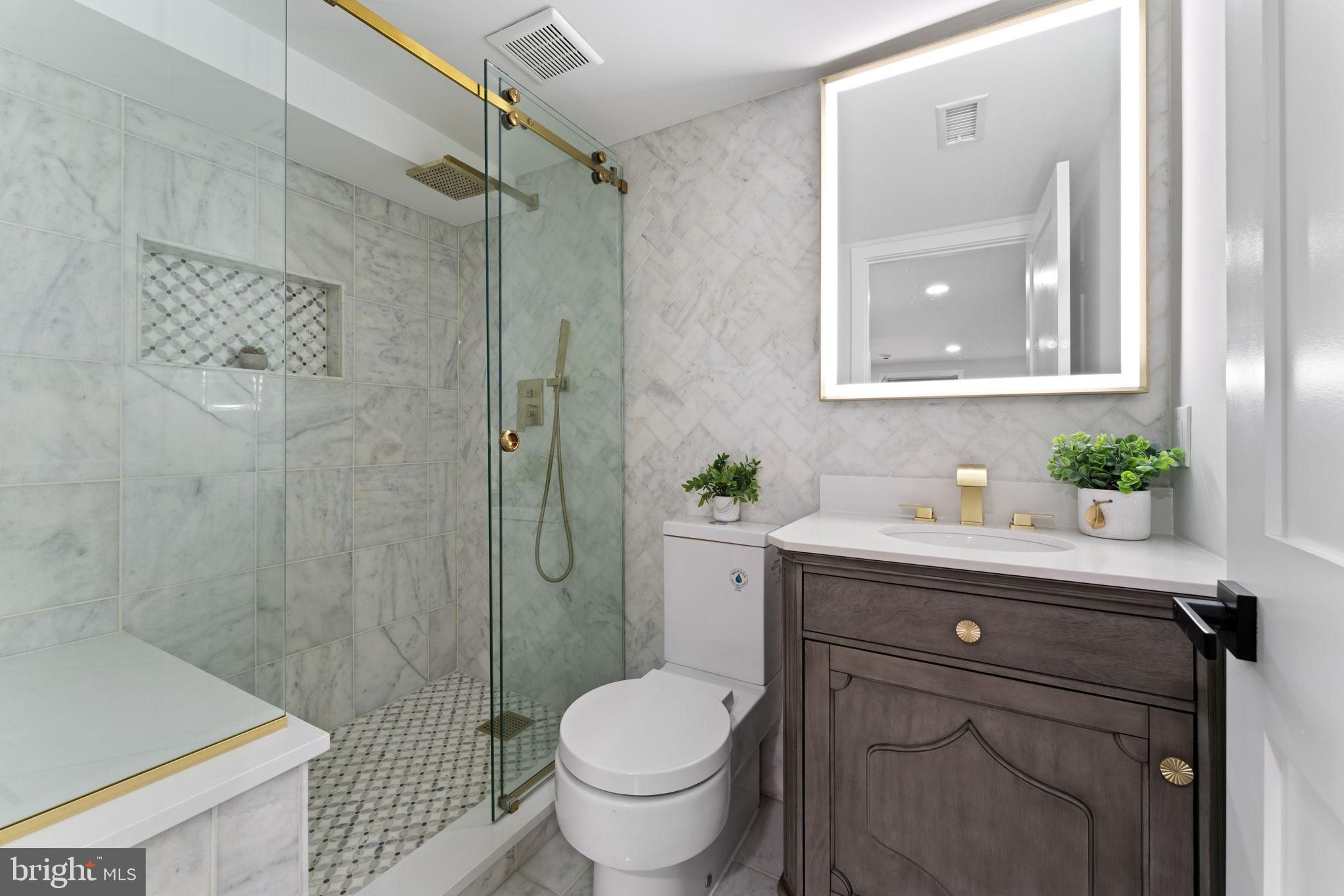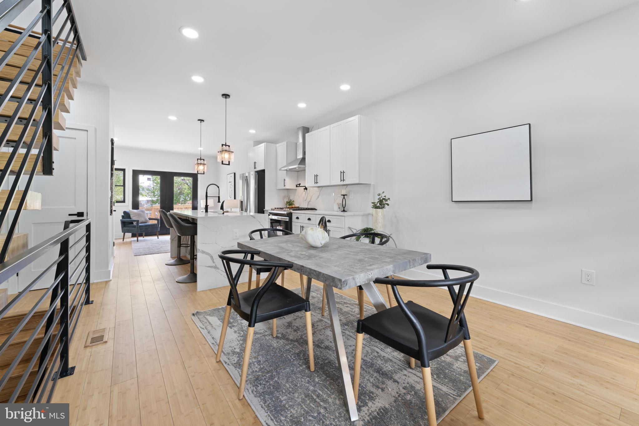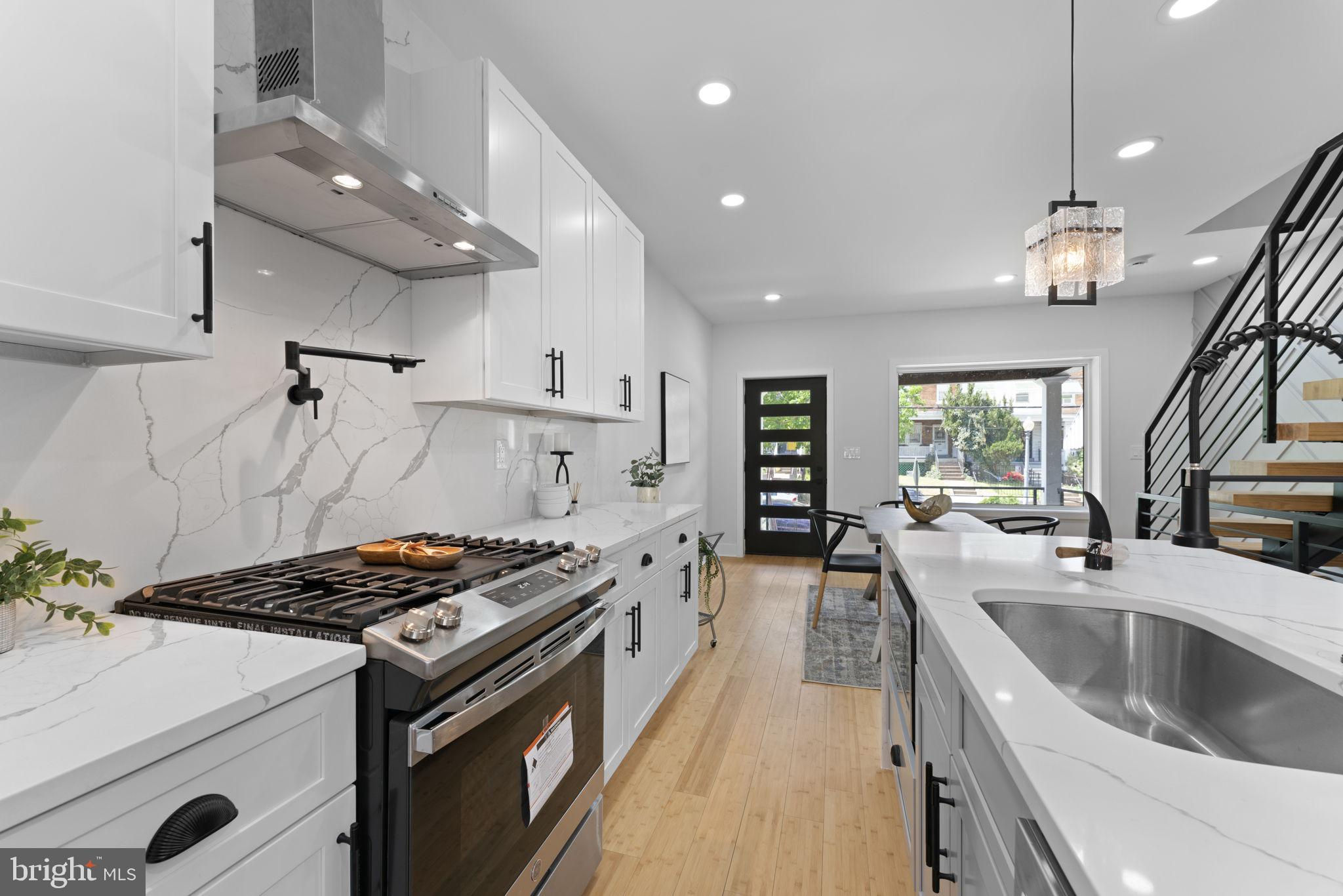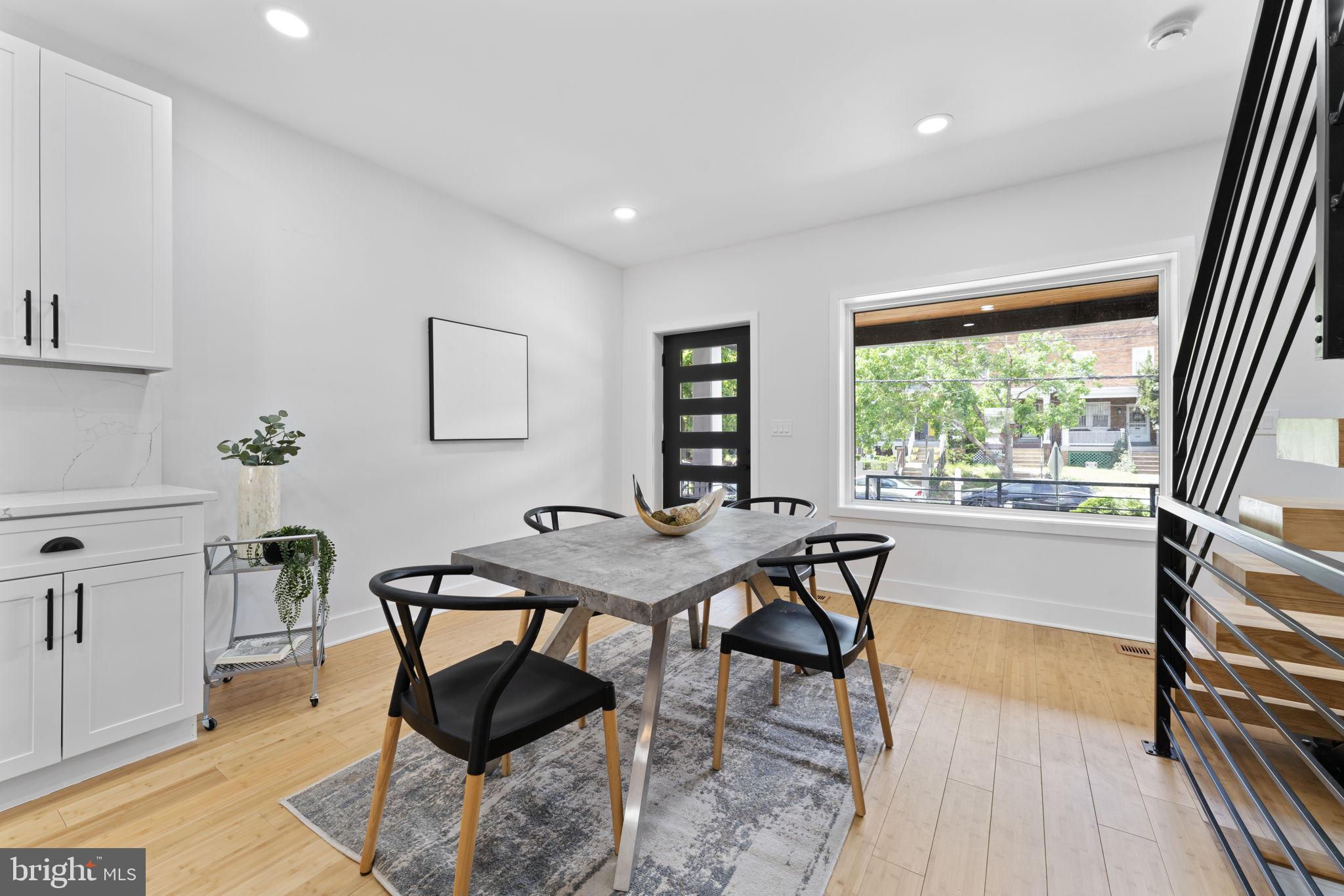 Welcome to 5123 8th St NW, a fully renovated rowhome in the heart of Petworth. This thoughtfully redesigned home spans three levels of elevated living, featuring high-end finishes, refined custom details, and a fully finished lower-level suite with its own entrance—ideal for guests, extended family, or rental income. Just reduced by $50,000, this is a rare opportunity to own a designer home with premium finishes and built-in rental potential at a significantly improved value. The main level boasts an open-concept layout flooded with natural light, wide-plank hardwood floors, and striking custom millwork that runs across all three levels of the home. The kitchen is a true showpiece with Calacatta quartz countertops, a dramatic waterfall island with built-in microwave, two-tone cabinetry featuring wood base cabinets, and a sleek pot filler over the gas range. Matte black hardware and designer lighting add style and contrast, while the accordion doors open to a private deck and fenced backyard with secure off-street parking. Upstairs, you'll find two spacious bedrooms, two full bathrooms, and a versatile den that makes for the perfect home office or nursery. The primary suite features a spa-inspired en suite bathroom with dual vanities, backlit mirrors, and a rainfall shower wrapped in elegant marble tile. The convenience of laundry on the upper level adds to the home's modern functionality. The fully finished lower level—with a separate entrance—includes one large bedroom, a full bathroom, a second laundry area, and generous living and dining space. In Petworth, one-bedroom lower-level suites like this can earn $1,900–$2,200/month on Furnished Finder, $1,850–$2,100/month on long-term leases, or up to $100–$140/night on Airbnb—making this an excellent opportunity to offset your mortgage or generate passive income. Every detail of this home was carefully selected—from the designer powder room on the main level to the layered lighting, sleek matte black fixtures, and premium finishes throughout. Perfectly located near Metro, bus lines, parks, and the dining and shopping on Georgia Avenue, this home offers sophisticated city living with unmatched flexibility. Whether you're looking for a forever home or a smart investment, 5123 8th St NW delivers—and now at an even better price.