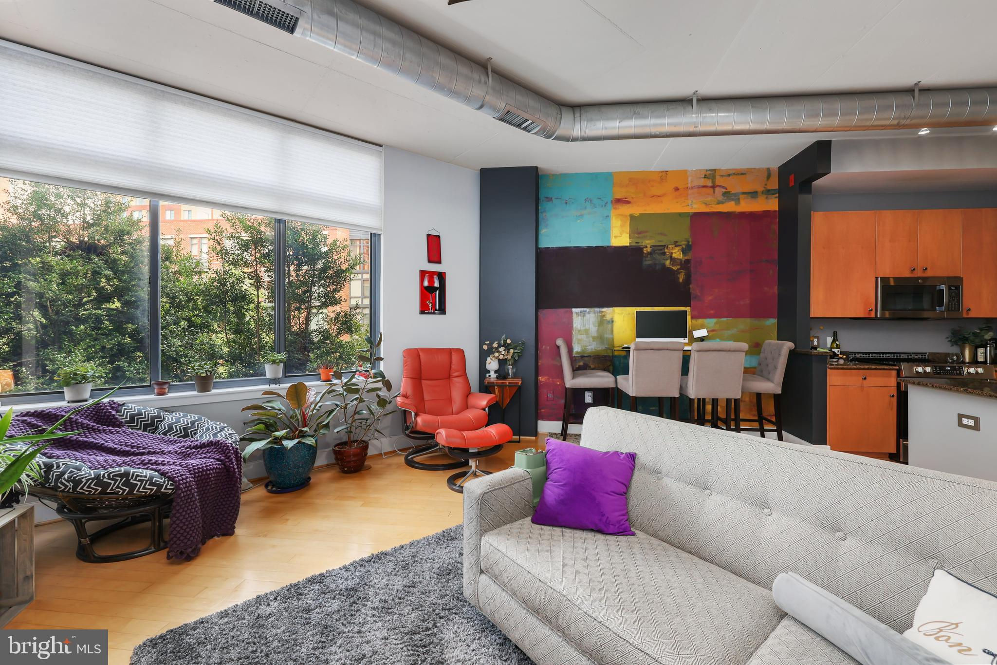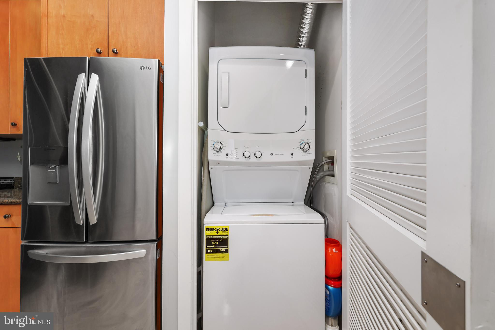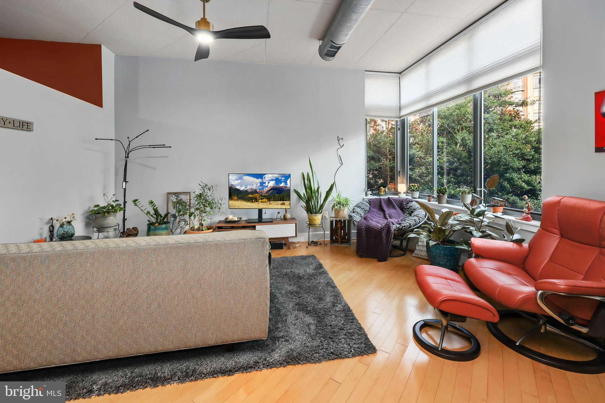 DON'T MISS OUT ON THIS CONDO! This incredible, well maintained, 760 sq. ft. 1 bedroom, 1 bath condo with soaring 9 ft. ceilings overlooks the artistically-designed courtyard yet still maintains privacy with the tall mature trees right outside your windows. A definite Pride in Ownership is evident as you walk into this beautifully decorated and pristine home with hardwood floors in the open concept living, dining and kitchen area. The galley style kitchen has granite countertops, with stainless steel appliances that have been updated – cooking range (2020), refrigerator (2021), dishwasher (2022), microwave (2022). The HVAC unit was replaced in 2022, hot water heater in 2019, and the stacked washer and dryer in 2022. Two aesthetically looking ceiling fans were installed in 2023 and receptacles have been updated to have functional USB ports. The pièce de résistance is the top to bottom fully renovated full bath in 2023. Retreat into your bedroom with luxury vinyl plank flooring installed in 2020 and two large side-by-side closets. An added bonus is the extra large 78 sq. ft. storage unit; B10 (valued at $10K in 2007) located in the garage and literally a few steps from your own assigned and deeded parking space (G2-55). The Carlyle Square condominium is strategically located just 4 minutes to Old Town's waterfront, minutes from 495 and a short distance to both the King Street Metro stop (blue and yellow lines), Amtrak and various dining (right outside your bldg.), shopping (Whole Foods and Wegmans), and entertainment options. This condo also has an option to rent for $2,950/month.