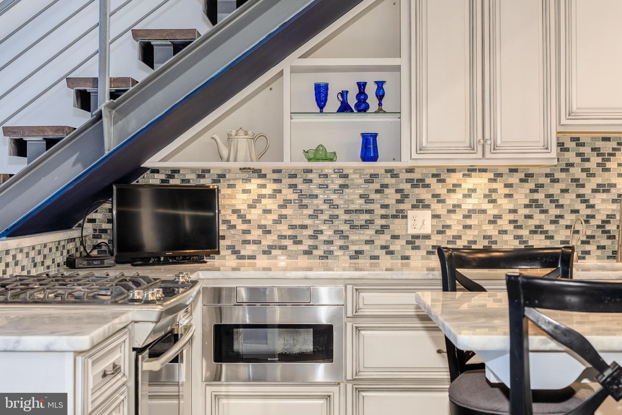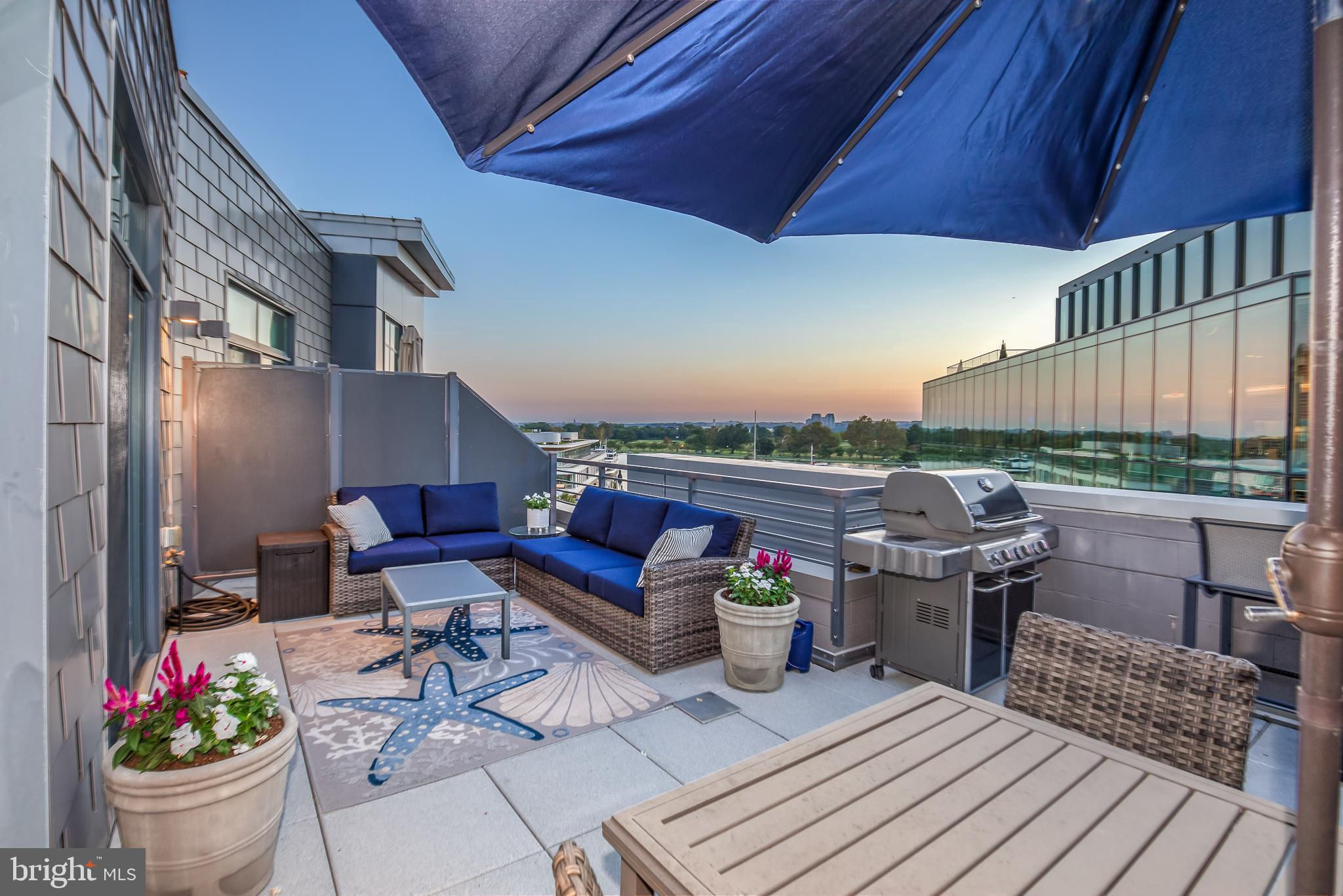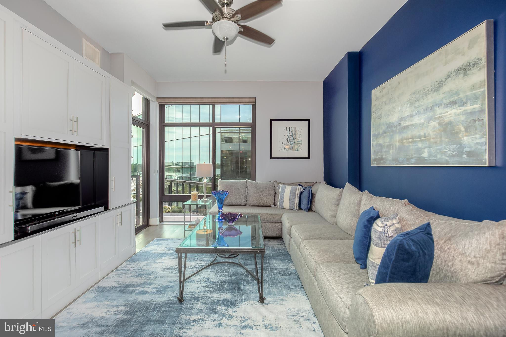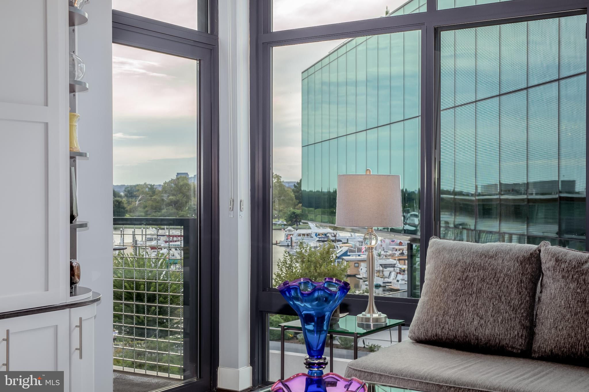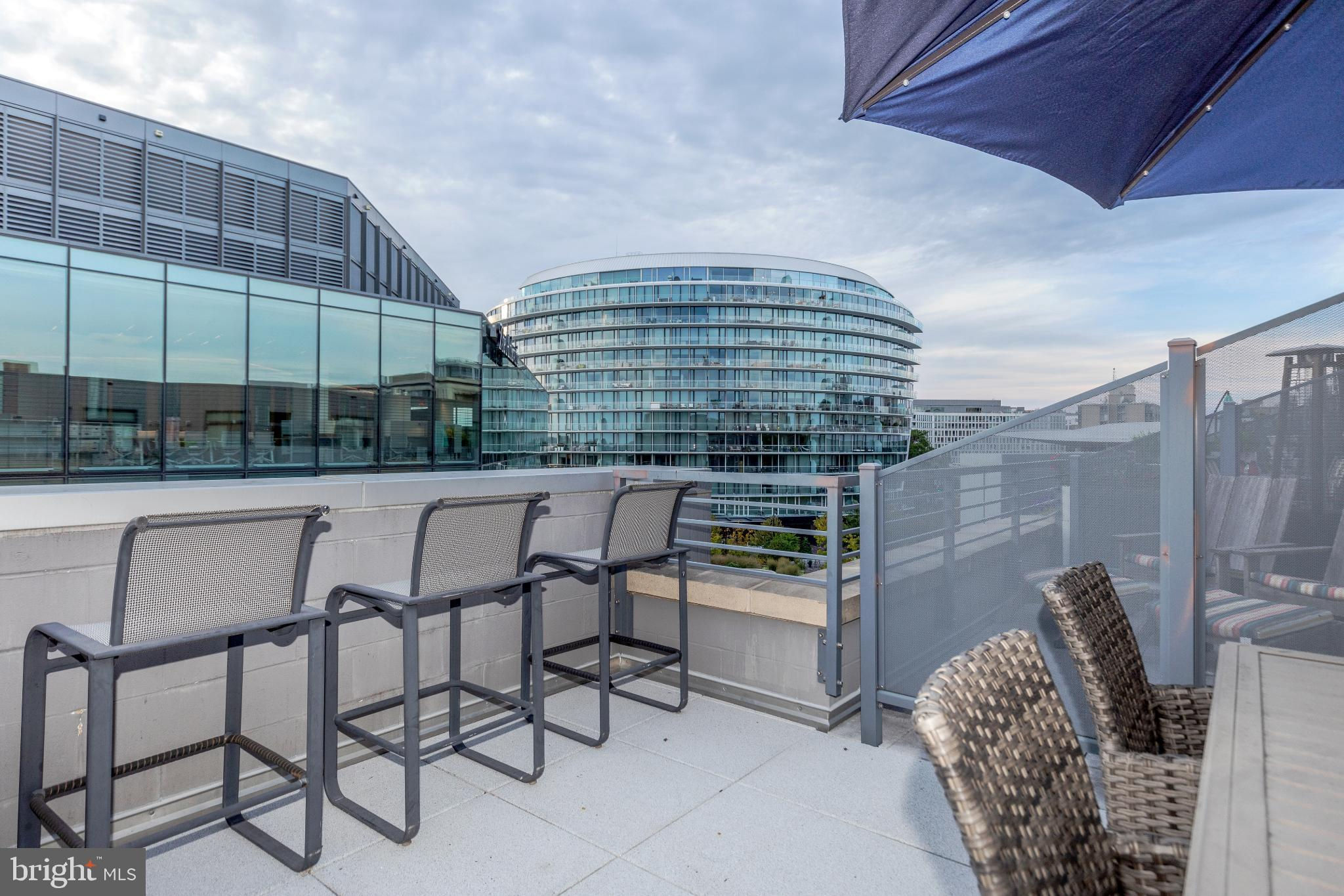 Welcome to Penthouse 403 at 525 Water, an extraordinary two-level condominium in the heart of the Southwest Waterfront. This rare residence offers high ceilings, custom upgrades, two garage parking spaces and a seamless blend of modern comfort and timeless sophistication, all just moments from the energy of The Wharf. Adding to its appeal, Penthouse 403 includes two secure garage parking spaces and an oversized storage unit, an amenity rarely available in the building and highly sought after in city living. The main level opens with ten-foot ceilings and a light-filled living and dining area anchored by a custom-built entertainment center with black granite detailing, a sleek quartzite-topped desk, and a matching full-length display shelf. The gourmet kitchen is both striking and functional, with custom oversized cabinetry and an upgraded, larger island, built-in pantry storage with pull-out shelving, white quartzite countertops, a designer full-height backsplash, and upgraded Electrolux Icon appliances. An InSinkErator instant hot water system and upgraded disposal elevate everyday living, while a private balcony extends the entertaining space outdoors. Completing this level is a spacious bedroom with adjustable closet shelving, and a built-in safe, paired with a beautifully appointed bath featuring white marble shower walls with designer accents, Porcelanosa flooring, granite surfaces, and custom cabinetry with integrated linen storage. Ascending the staircase, the upper-level features soaring eleven-foot ceilings and a dramatic primary suite. This retreat is enhanced by a custom wardrobe and shoe cabinet with granite accents, a dedicated dressing area with large mirrors and integrated lighting, and refined details such as track lighting, a ceiling fan, and exposed spiral ductwork that add a modern edge. The en-suite primary bath is finished with spa-like precision, offering white marble walls and wainscoting, water jet cut stone flooring, a granite vanity with a matching shelf, and a luxurious shower with dual shower heads, a built-in seat and shelving. Beyond the interiors, the residence offers private outdoor living with an expansive terrace designed for al fresco dining and entertaining, complete with a rare gas line for grilling or firepits. Additional thoughtful touches include a custom laundry room with a full-size Electrolux washer and ducted dryer, porcelain tile floors, adjustable shelving, and automatic lighting. Throughout the home, dimmable light fixtures, custom storage solutions, and high-end finishes reflect the attention to detail that defines this one-of-a-kind property. Perfectly positioned within 525 Water, this penthouse places you at the The Wharf’s dynamic waterfront, with premier dining, boutique shopping, entertainment venues, and tranquil green spaces just outside your door. With its expansive layout, bespoke upgrades, and private outdoor terrace, Penthouse 403 represents the pinnacle of waterfront living in Washington, DC.