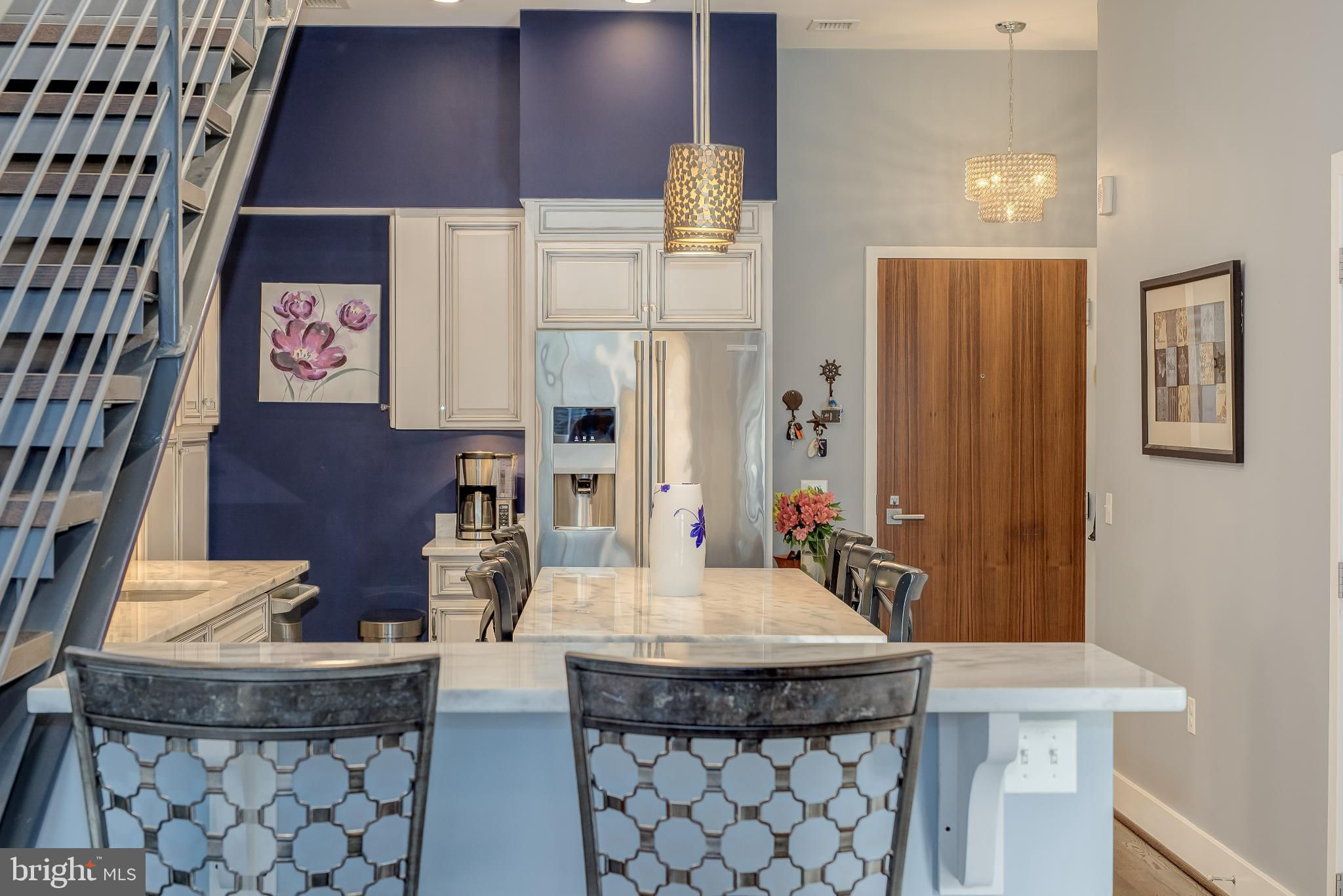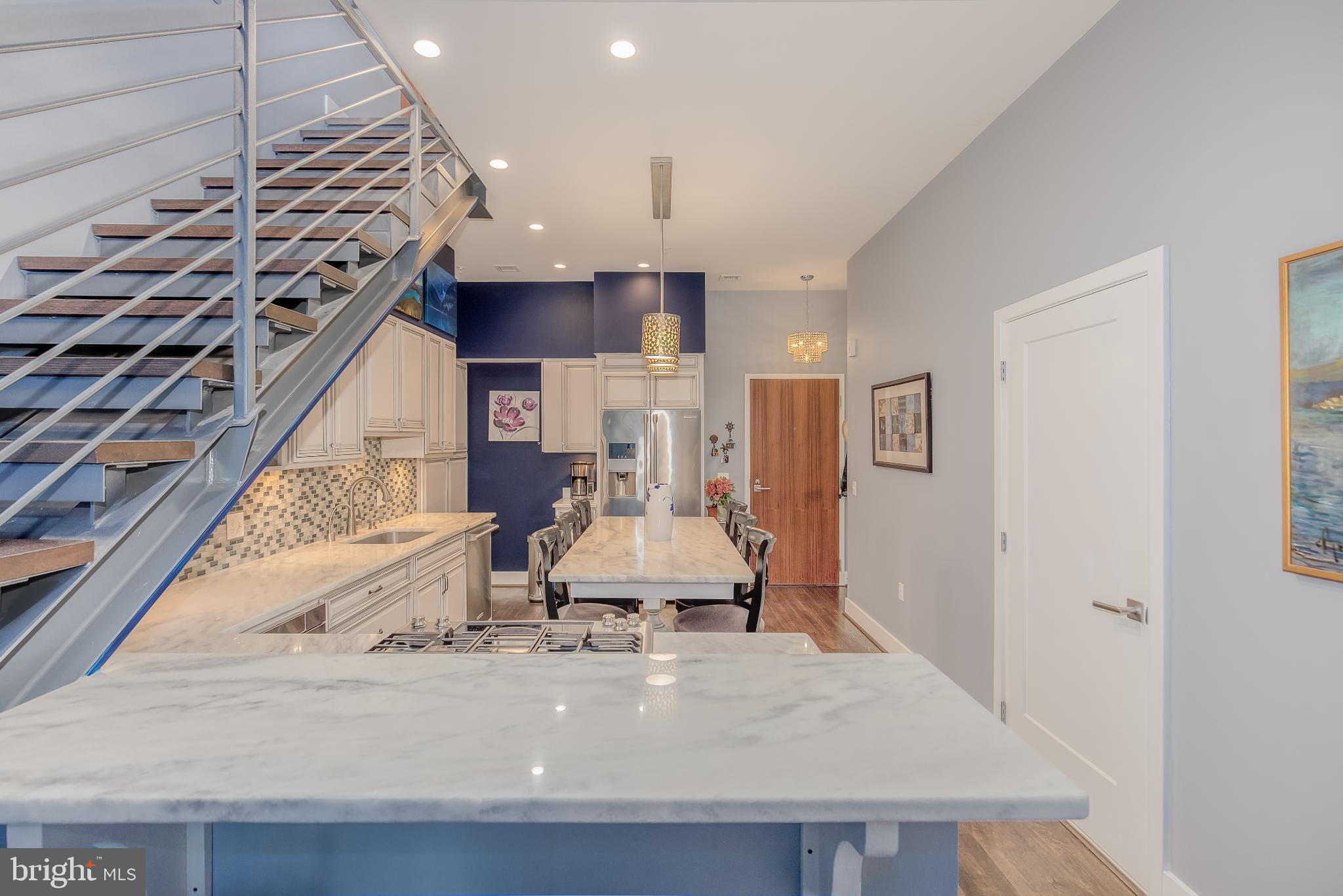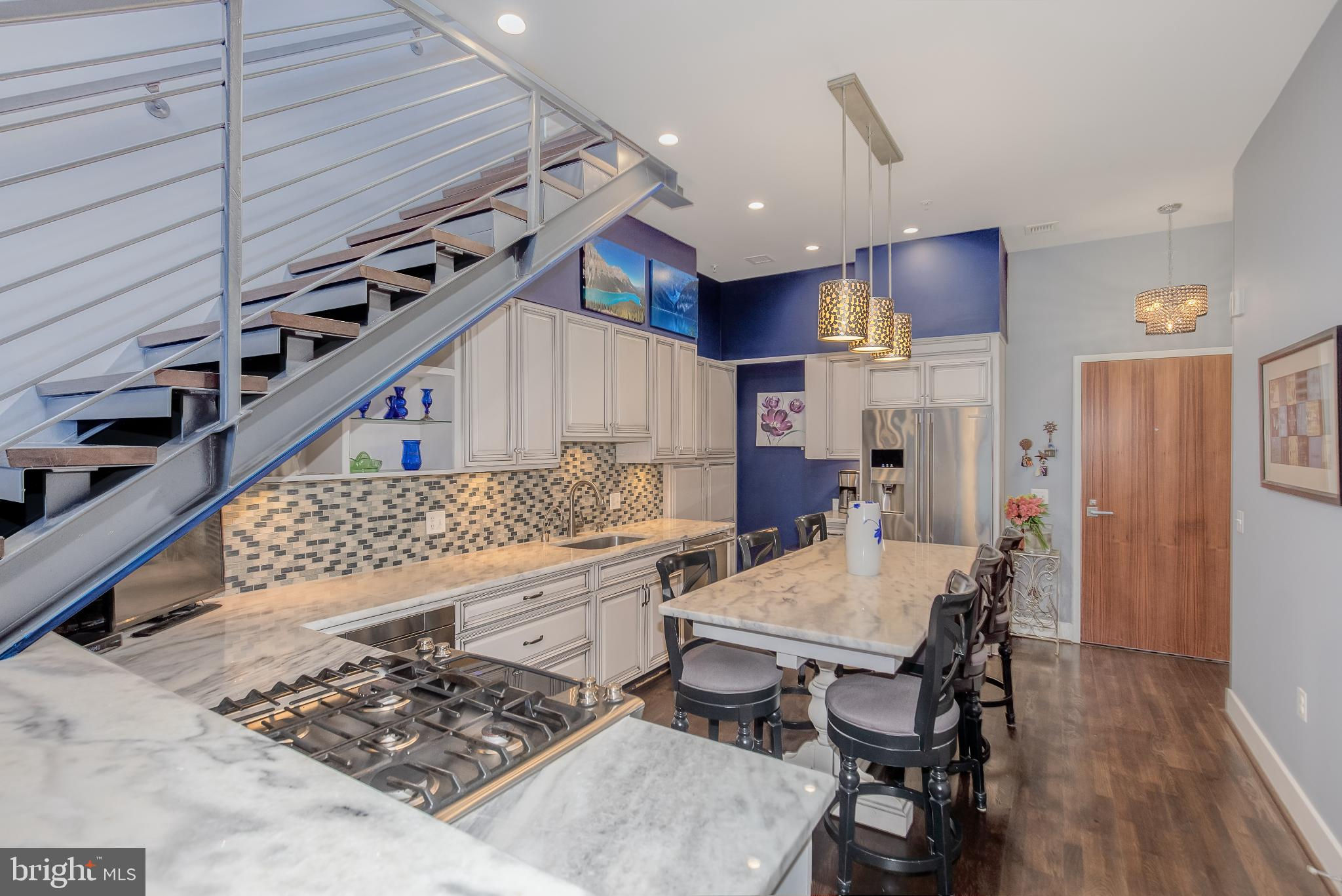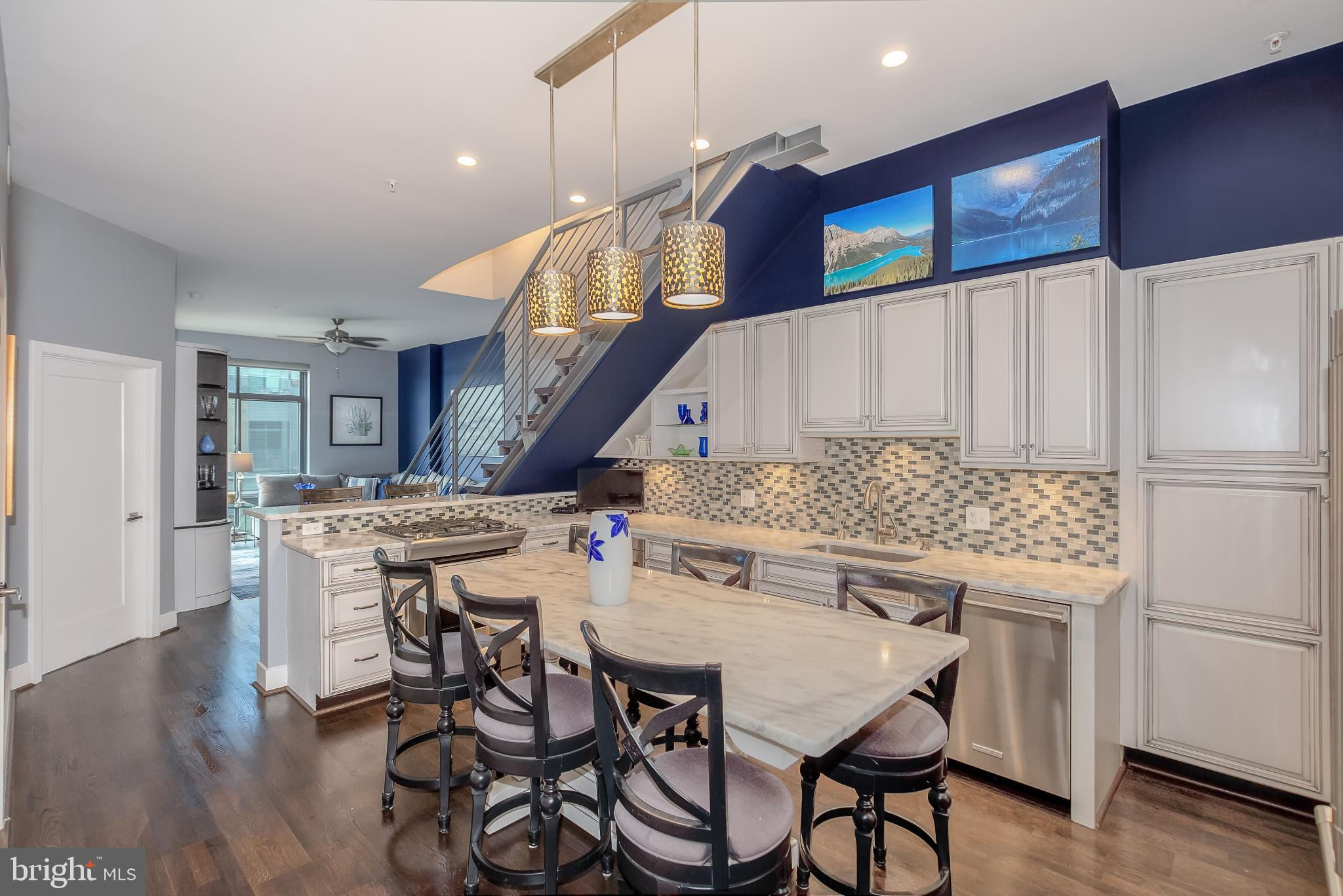 Welcome to Penthouse 403 at 525 Water, an extraordinary two-level condominium in the heart of the Southwest Waterfront. This rare residence offers high ceilings, custom upgrades, two garage parking spaces and a seamless blend of modern comfort and timeless sophistication, all just moments from the energy of The Wharf. Adding to its appeal, Penthouse 403 includes two secure garage parking spaces and an oversized storage unit, an amenity rarely available in the building and highly sought after in city living. The main level opens with ten-foot ceilings and a light-filled living and dining area anchored by a custom-built entertainment center with black granite detailing, a sleek quartzite-topped desk, and a matching full-length display shelf. The gourmet kitchen is both striking and functional, with custom oversized cabinetry and an upgraded, larger island, built-in pantry storage with pull-out shelving, white quartzite countertops, a designer full-height backsplash, and upgraded Electrolux Icon appliances. An InSinkErator instant hot water system and upgraded disposal elevate everyday living, while a private balcony extends the entertaining space outdoors. Completing this level is a spacious bedroom with adjustable closet shelving, and a built-in safe, paired with a beautifully appointed bath featuring white marble shower walls with designer accents, Porcelanosa flooring, granite surfaces, and custom cabinetry with integrated linen storage. Ascending the staircase, the upper-level features soaring eleven-foot ceilings and a dramatic primary suite. This retreat is enhanced by a custom wardrobe and shoe cabinet with granite accents, a dedicated dressing area with large mirrors and integrated lighting, and refined details such as track lighting, a ceiling fan, and exposed spiral ductwork that add a modern edge. The en-suite primary bath is finished with spa-like precision, offering white marble walls and wainscoting, water jet cut stone flooring, a granite vanity with a matching shelf, and a luxurious shower with dual shower heads, a built-in seat and shelving. Beyond the interiors, the residence offers private outdoor living with an expansive terrace designed for al fresco dining and entertaining, complete with a rare gas line for grilling or firepits. Additional thoughtful touches include a custom laundry room with a full-size Electrolux washer and ducted dryer, porcelain tile floors, adjustable shelving, and automatic lighting. Throughout the home, dimmable light fixtures, custom storage solutions, and high-end finishes reflect the attention to detail that defines this one-of-a-kind property. Perfectly positioned within 525 Water, this penthouse places you at the The Wharf’s dynamic waterfront, with premier dining, boutique shopping, entertainment venues, and tranquil green spaces just outside your door. With its expansive layout, bespoke upgrades, and private outdoor terrace, Penthouse 403 represents the pinnacle of waterfront living in Washington, DC.