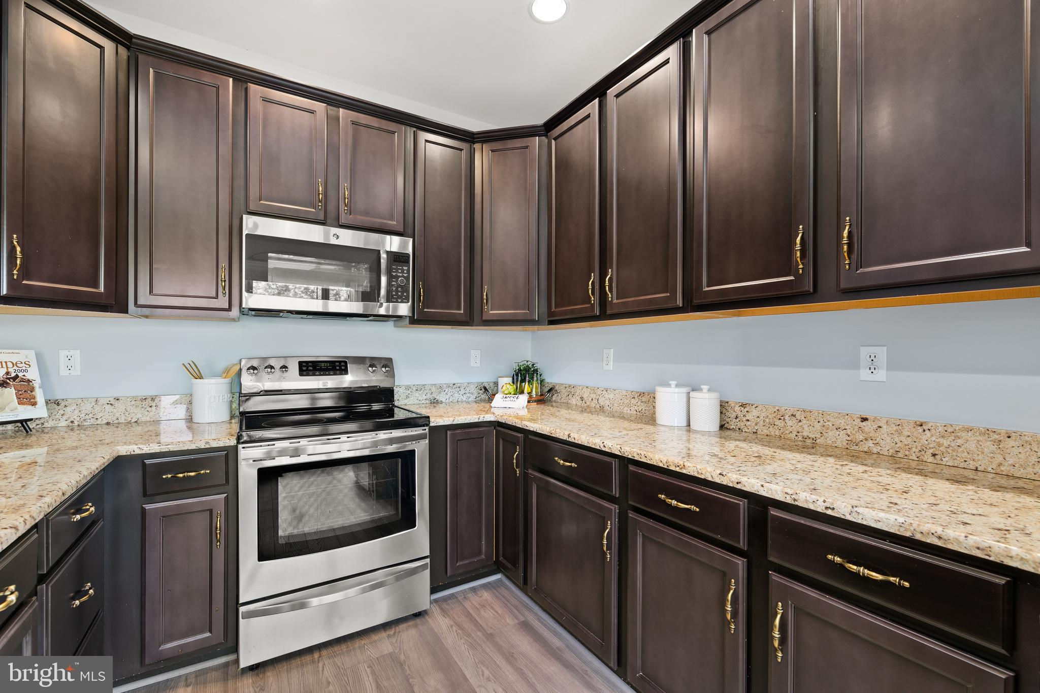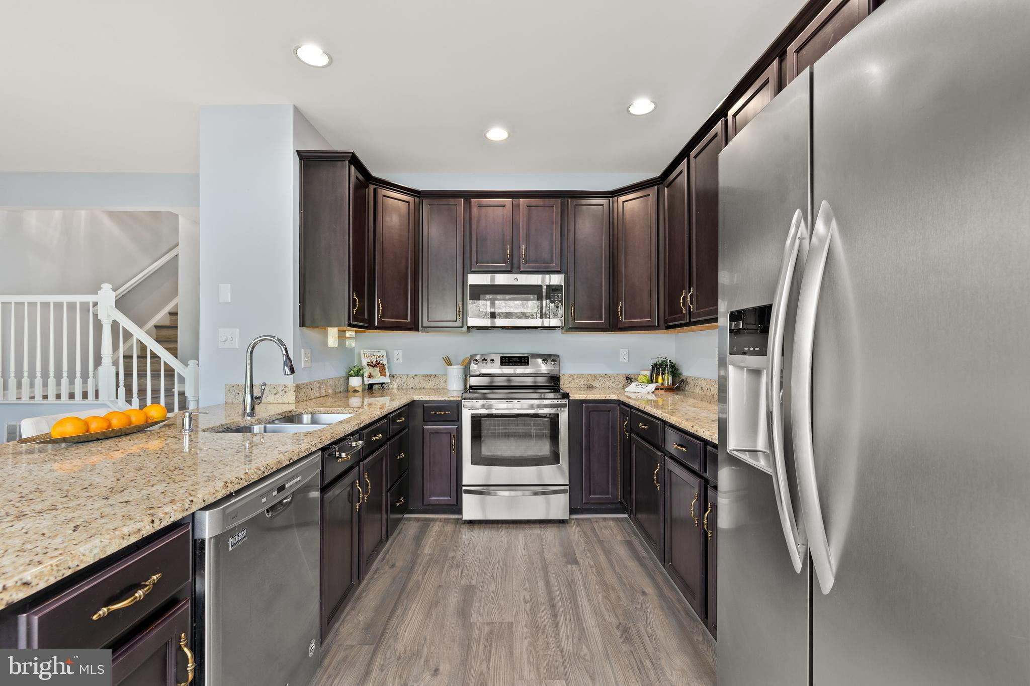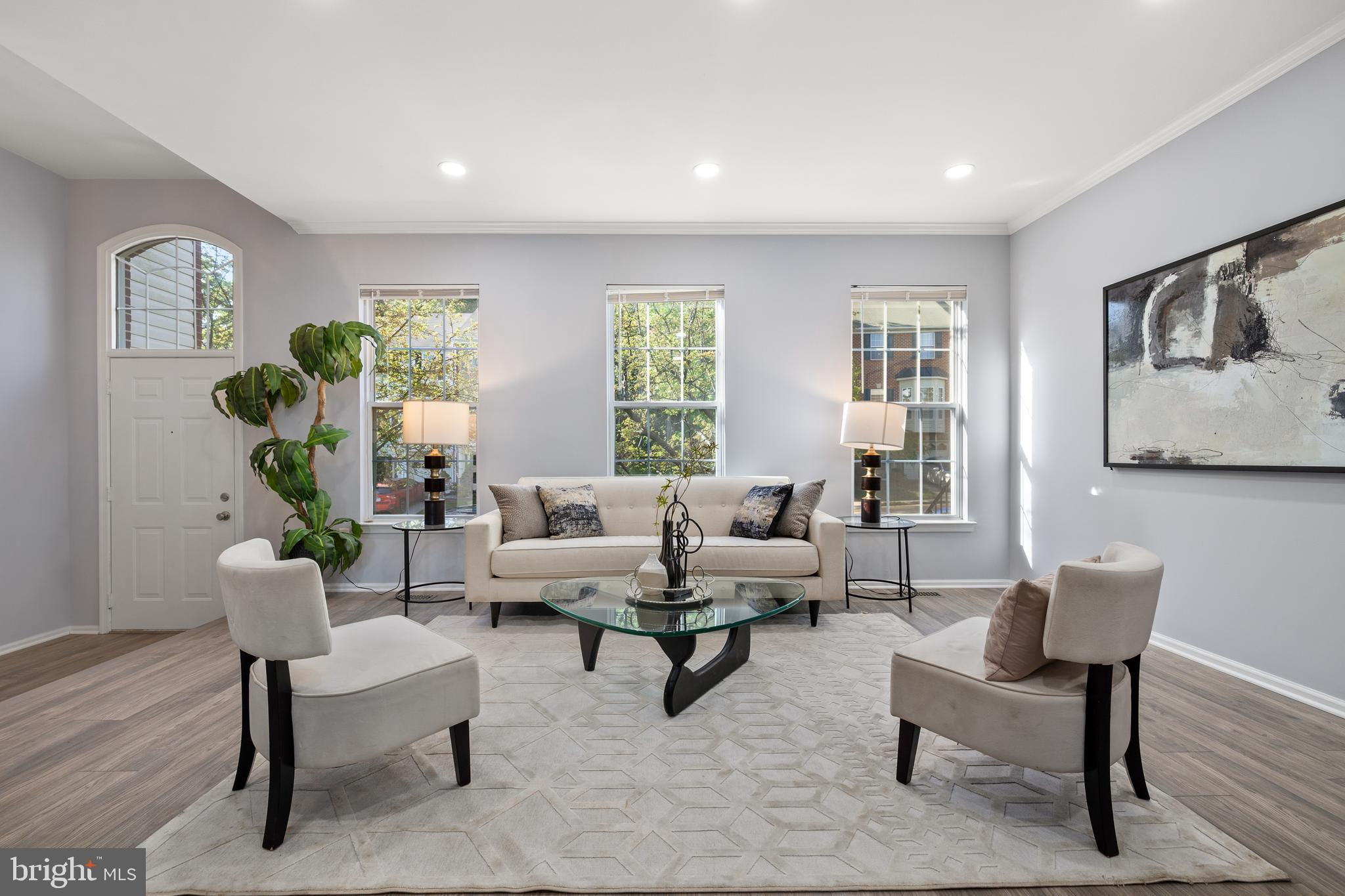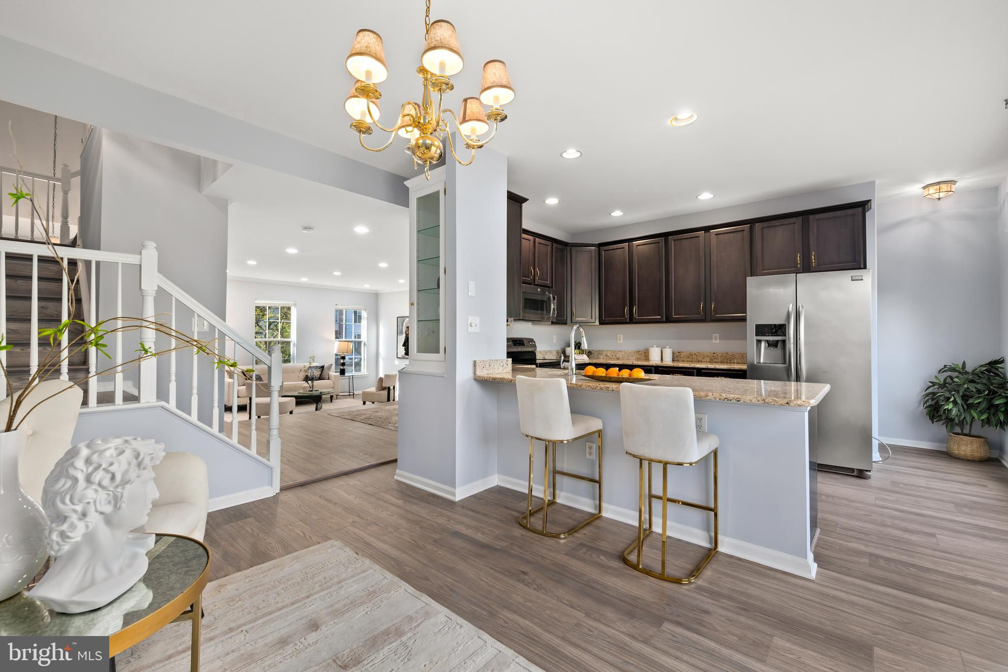 Dramatic, open floor plan with sunken living room greets you! New Luxury Vinyl floor throughout the house, new paint, the main level including a formal dining room accented with a chair rail. The eat-in kitchen has dining space as well as a breakfast bar, granite counters and stainless steel appliances. With 42 inch cabinets, there is plentiful storage. The master bedroom boasts soaring ceilings for a striking effect. En suite master bath includes a soaking tub, separate shower and double sinks. Sizeable 2nd and 3rd upper bedrooms share a hall bath. The 4th bedroom and 3rd full bath are on the lower level. A huge recreation room with a cozy fireplace walks out to a brick paved patio and a Trex deck! The previous owner put thousands into that deck and it's one of very few in the area that never needs to be replaced. Minutes to metro, Rtes. 395 and 495 for an easy commute. Enjoy Kingstown amenities, shops, theatres & restaurants.
