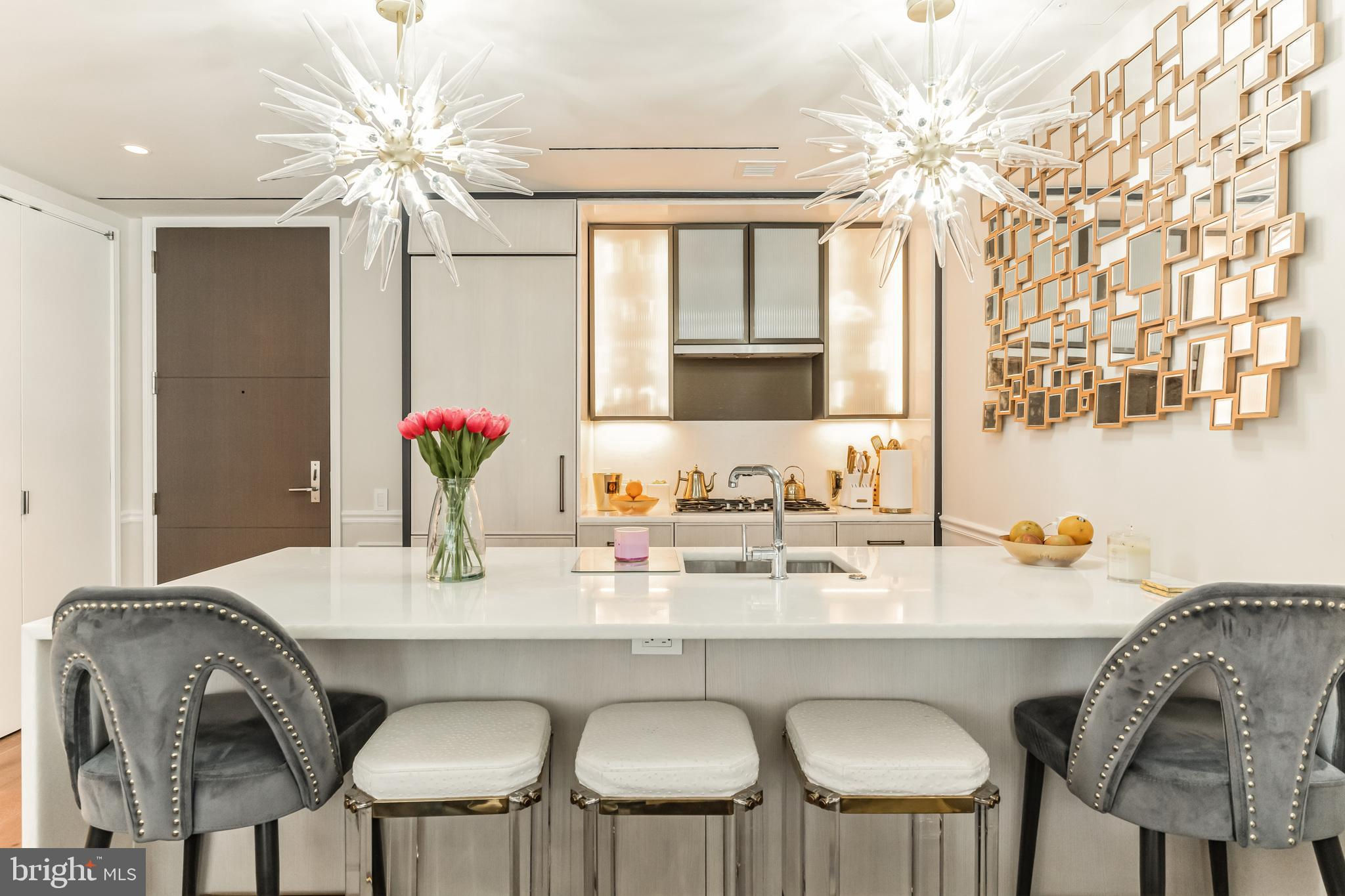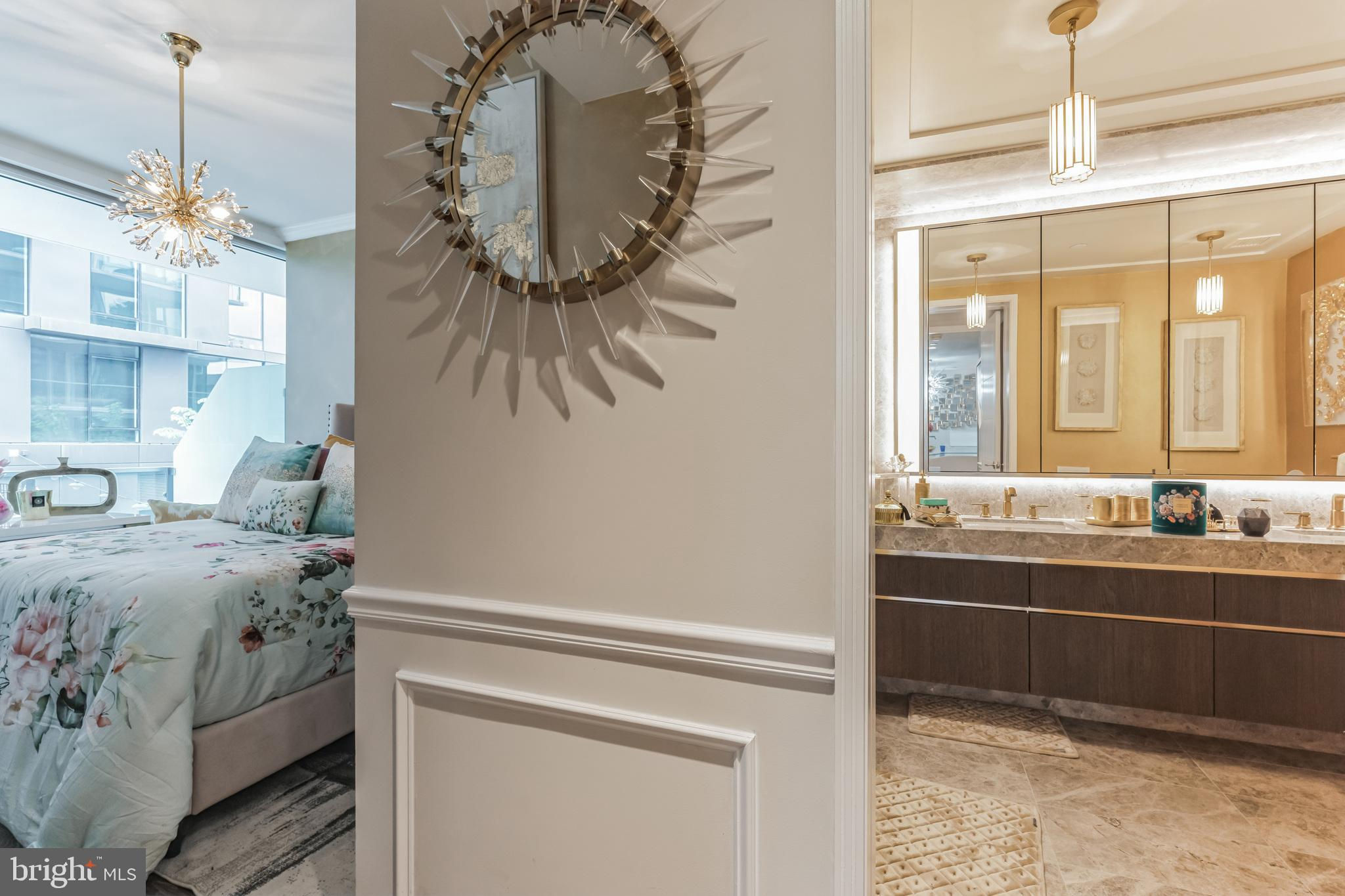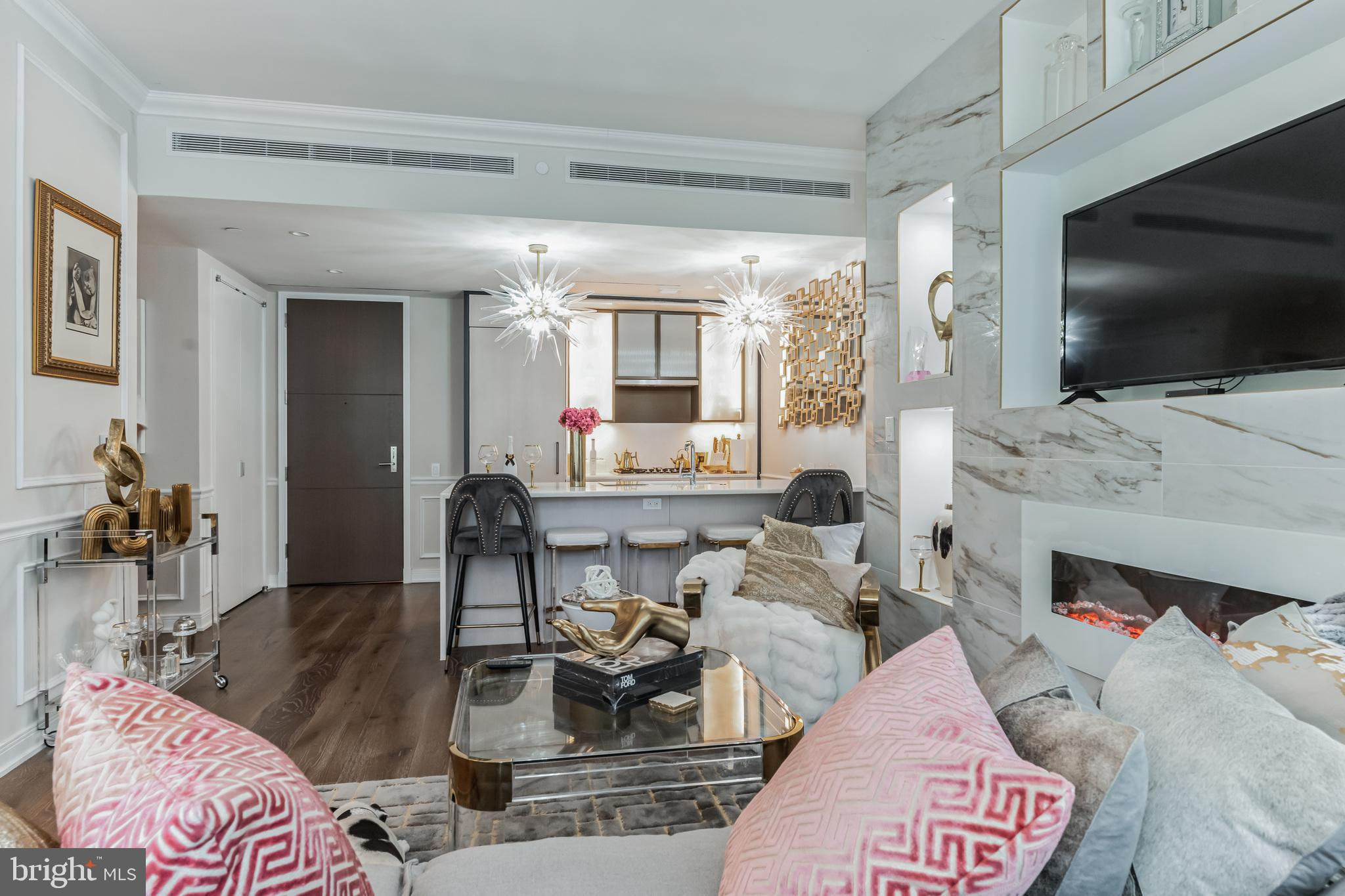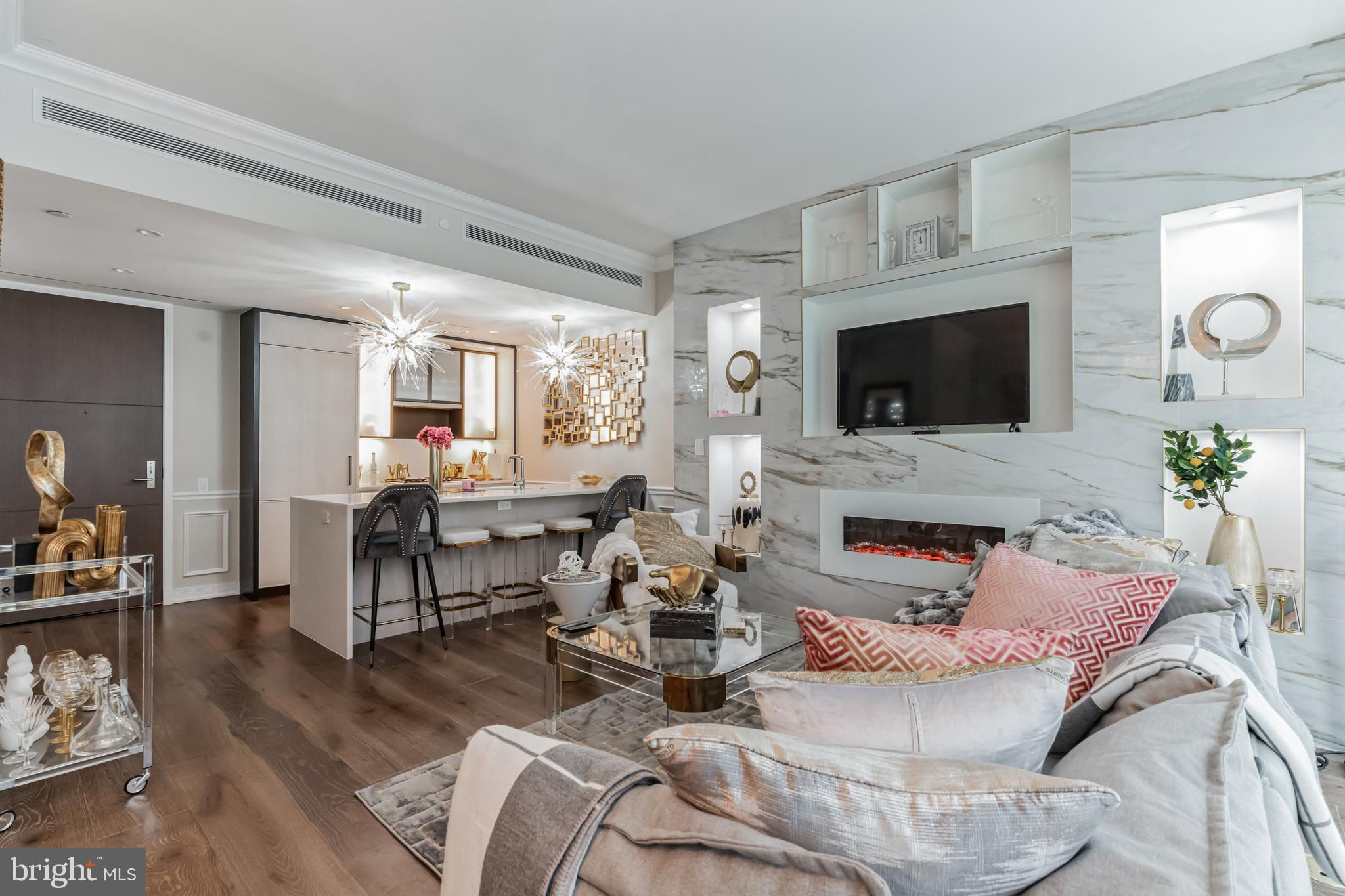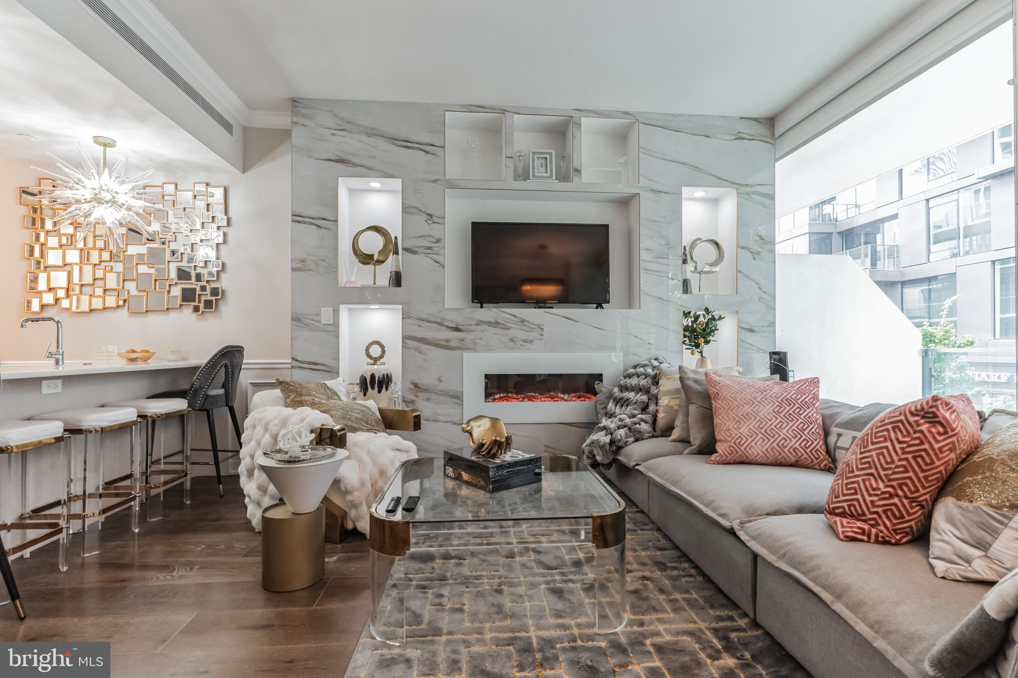 Presenting an exquisite one-bedroom, one-bathroom residence at Amaris, where meticulous design meets unparalleled sophistication, and the art of waterfront living is redefined. Crafted by a renowned NYC interior designer, this home is a testament to luxury and attention to detail, featuring special custom molding that adds an air of elegance and uniqueness to the space. The centerpiece, a marble fireplace, is adorned with carefully designed boxes, creating a focal point of both warmth and style. The gourmet kitchen, a masterpiece of functionality and style, boasts custom Italian cabinetry by Stevali, elegantly complemented by discreet under-cabinet lighting, and is equipped with state-of-the-art Thermador and Bosch appliances. Anchoring this culinary haven is a honed marble island, inviting both casual breakfasts and grand evening soirees. Step outside to the expansive balcony and embrace the serene views of The Green, a 1.5-acre oasis crafted by the esteemed landscape architect Michael Van Valkenburgh. Here, a striking raw marble fountain stands as the park’s majestic focal point, offering a tranquil retreat from the city’s bustle. Amaris elevates the concept of luxury amenities to create a sanctuary of wellness and relaxation. Residents enjoy an exclusive indoor, two-lane saltwater pool, alongside a spa and sauna that seamlessly extend into a comprehensive fitness center. The connectivity of the space is further enhanced by a bridge leading to a cozy lounge and an adjoining screening room, promising moments of leisure and socialization. The outdoor waterfront terrace, featuring a grilling area, unfolds into an expansive vista, providing an immersive experience of awe-inspiring views. The architectural brilliance of Amaris, envisioned by the legendary Rafael Viñoly, with interiors by the acclaimed Thomas Juul-Hansen, guarantees an environment of sublime aesthetics and rejuvenating amenities. Positioned within The Wharf, a vibrant waterfront neighborhood, residents have unparalleled access to a rich tapestry of events, culinary delights from chef-owned restaurants, boutique shopping, and over 17.5 acres of communal green spaces. This residence, where luxury design meets the art of waterfront living, reflects a philosophy where no stone was left untouched by the designer, ensuring every inch speaks to a refined lifestyle unmatched in its elegance.