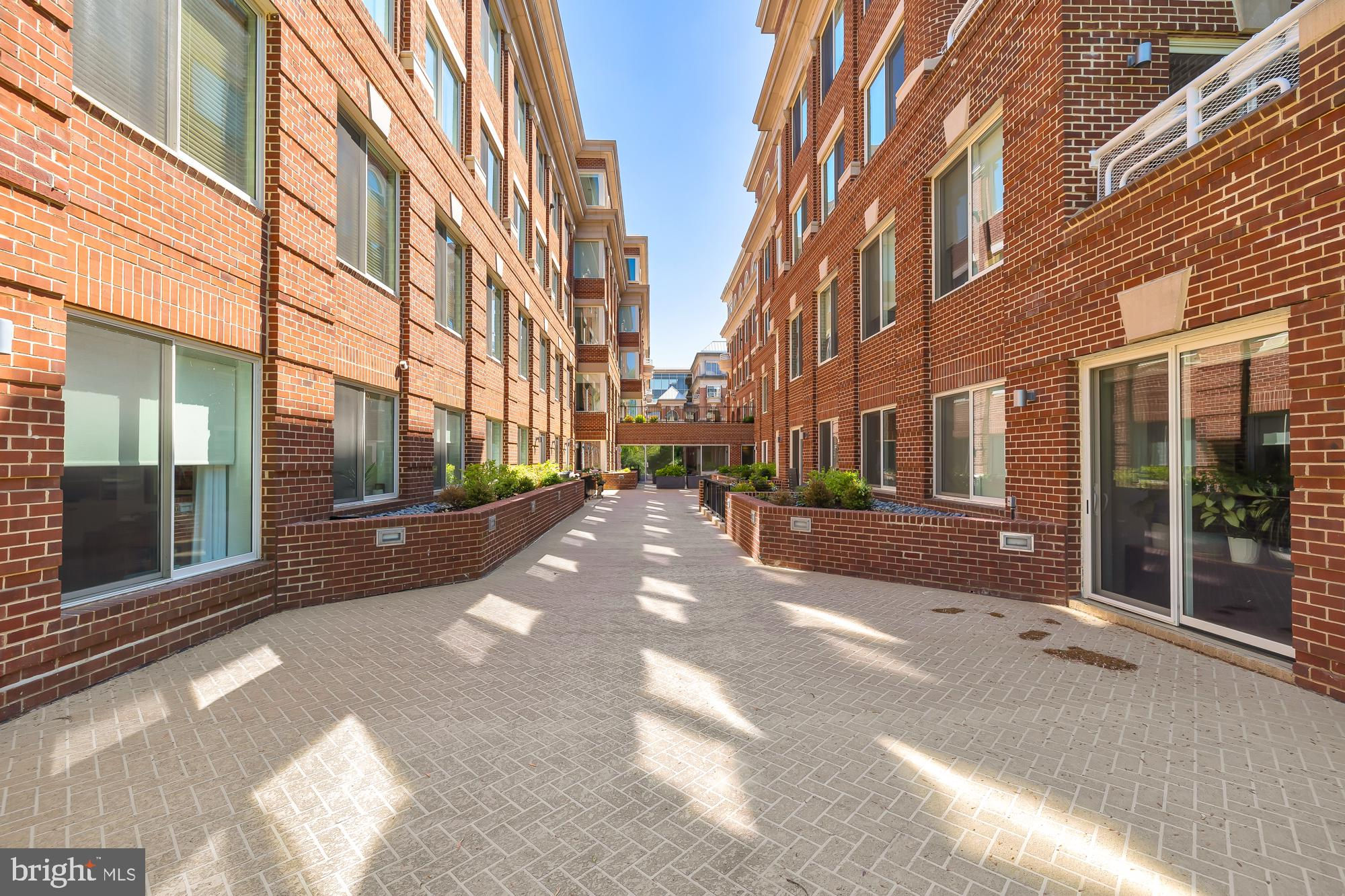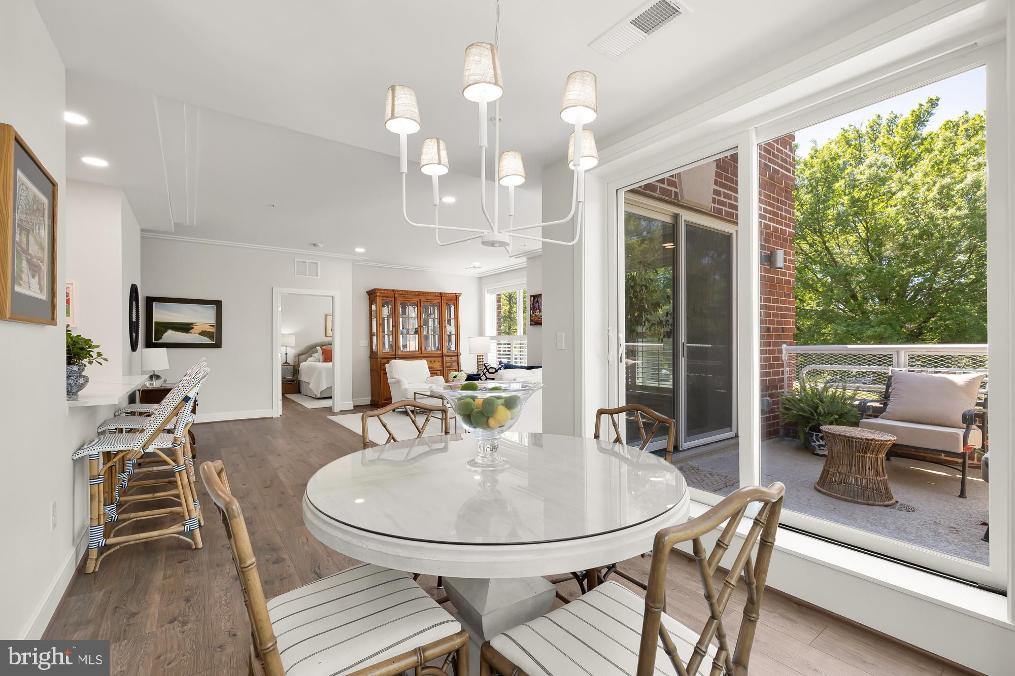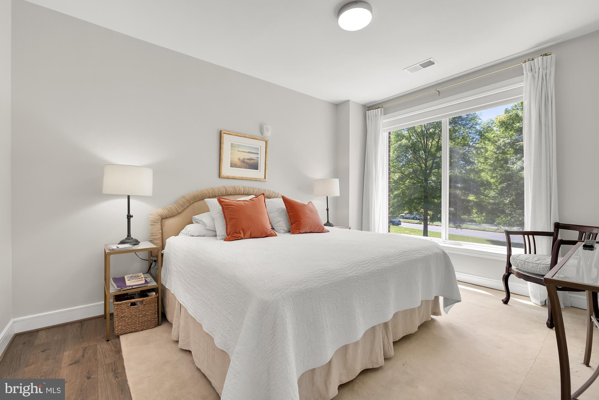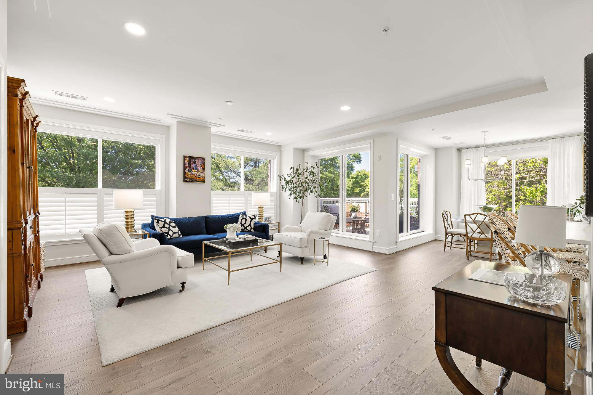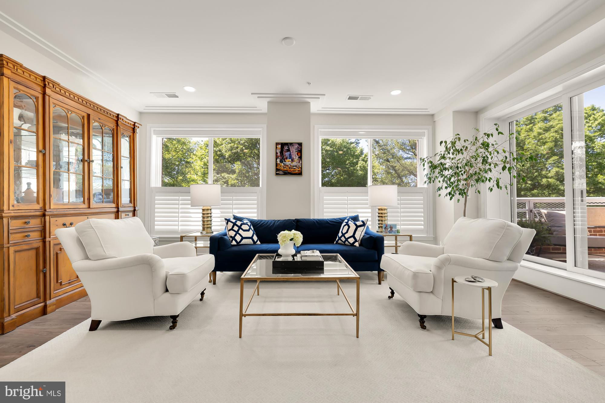 Welcome to 625 Slaters Lane, Unit 104! This is a stunning and sophisticated residence offering an elegant, modern lifestyle in the heart of Alexandria, VA. This exceptional corner unit boasts 1532 square feet of luxury living space, featuring 2 spacious bedrooms + a den and large scale windows that frame breathtaking 180-degree views of the surrounding greenery, creating a serene and picture-perfect environment. Upon entering, you are greeted by the grandeur of a proper foyer with storage. Before you access the kitchen and main living area you have the 2nd bedroom complete with an en suite to your right. The kitchen is equipped a 5 burner stove, quartz counter tops, and a large pantry with plenty of cabinet space and the perfect breakfast bar accessed from the dining area. The living space is absolutely breathtaking and offers abundant light and space which are perfect for both entertaining or just relaxing. The Primary suite has everything you need to recharge and relax. Walk in closet, En suite, with his and her quartz vanities. The den or additional rec room offers many options, including a TV room, Workout room, Office Space or additional flex space. Residents of this mid rise building enjoy access to an array of upscale amenities, including a full-time concierge, a gym, yoga studio, and a resident's lounge. The common media/recreation room and club house provide additional spaces for relaxation and entertainment. For added convenience, private storage is included, and laundry facilities are available in every unit. This home is truly a haven for those seeking a modern and sophisticated lifestyle, with panoramic views and a sense of tranquility that is unmatched.