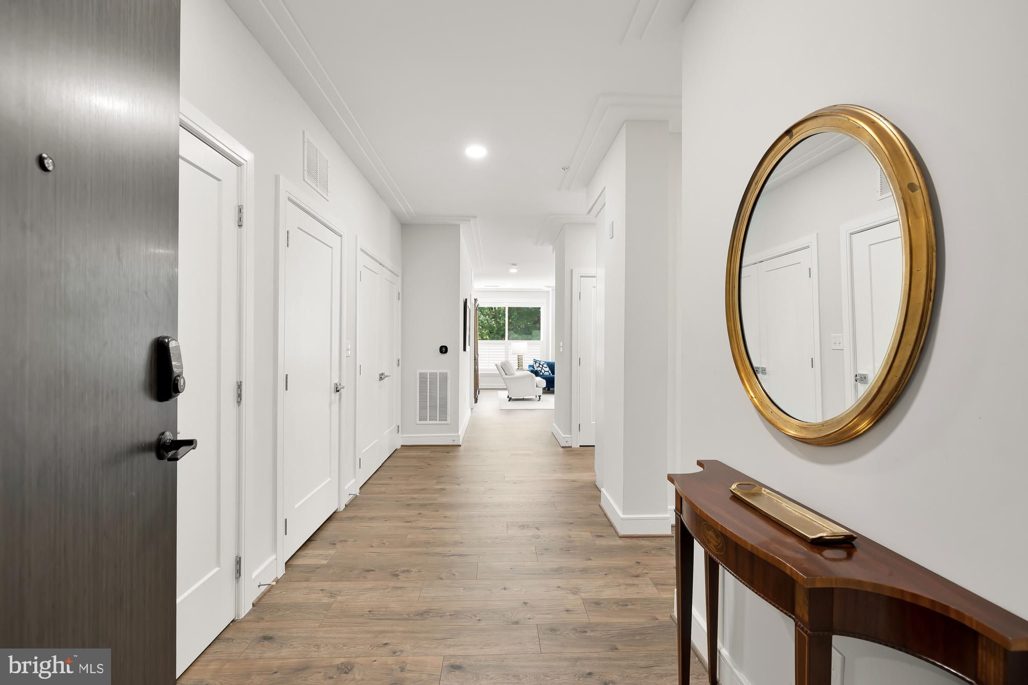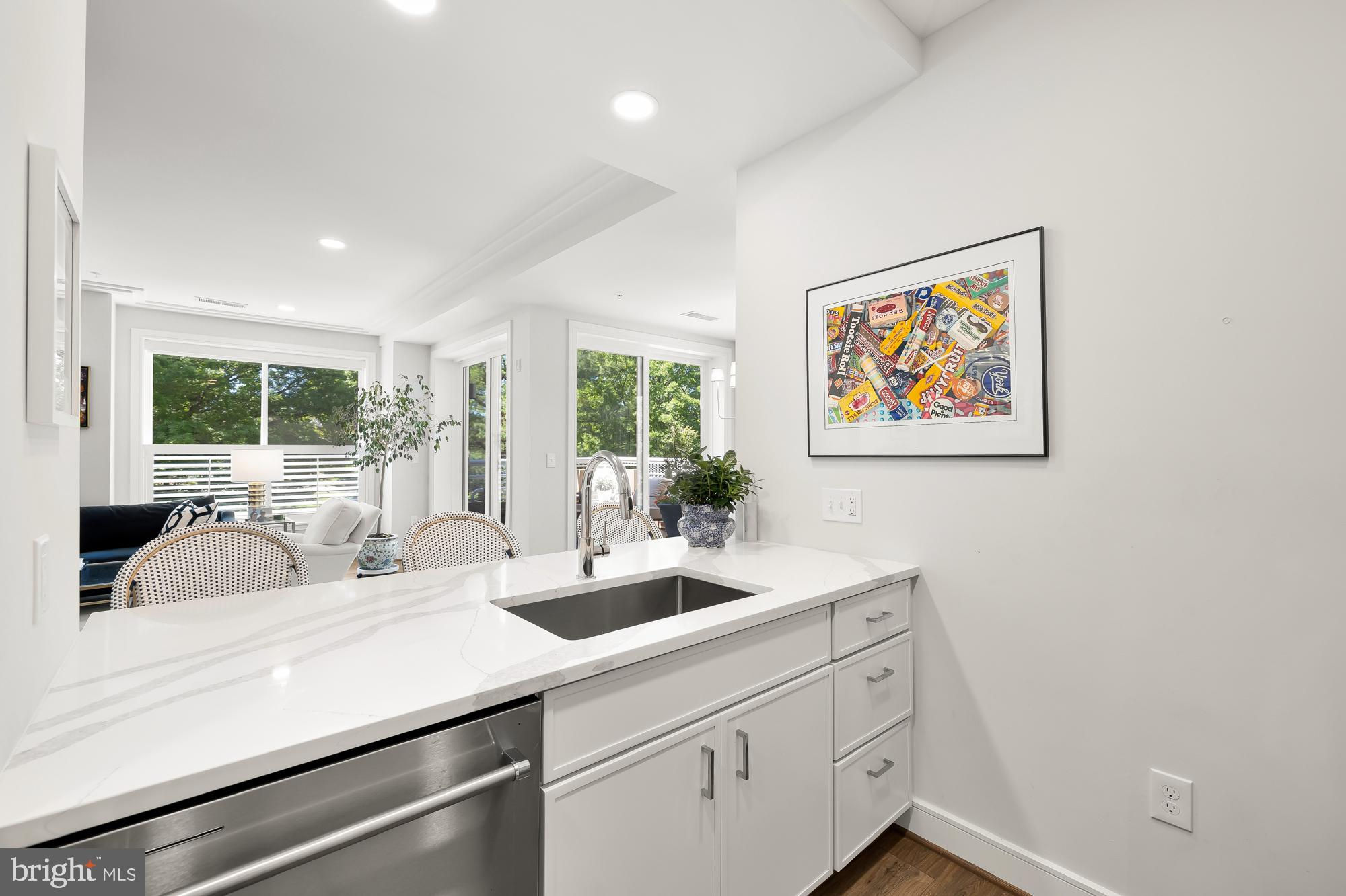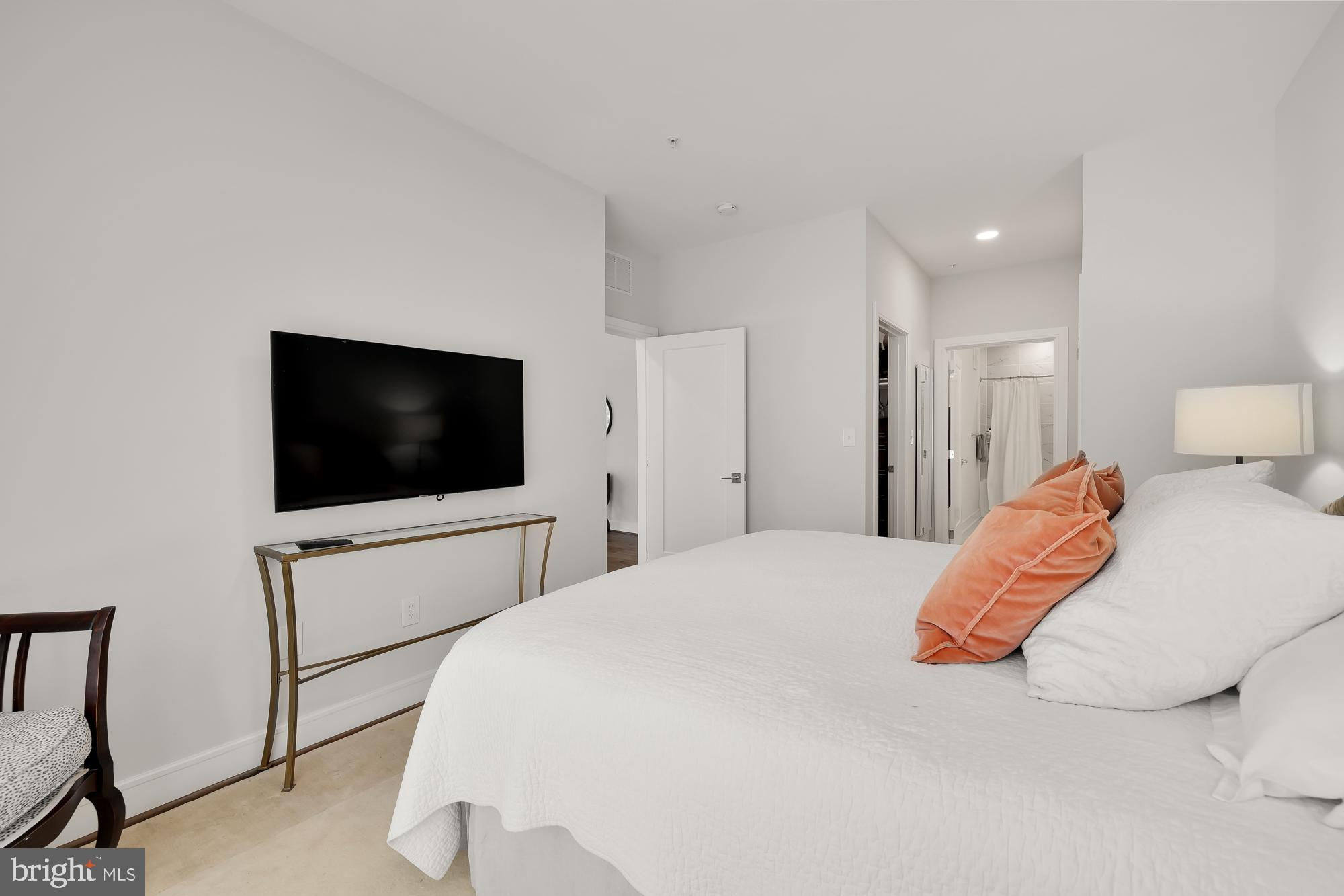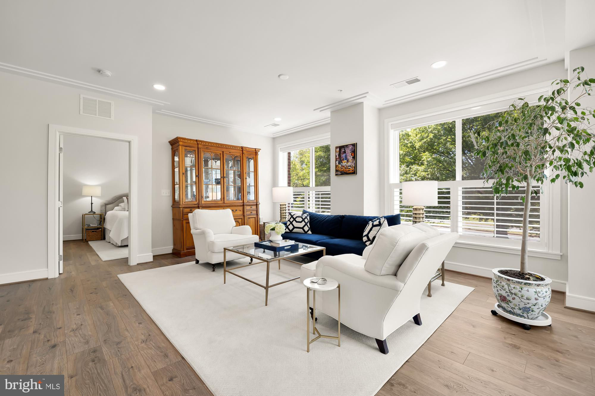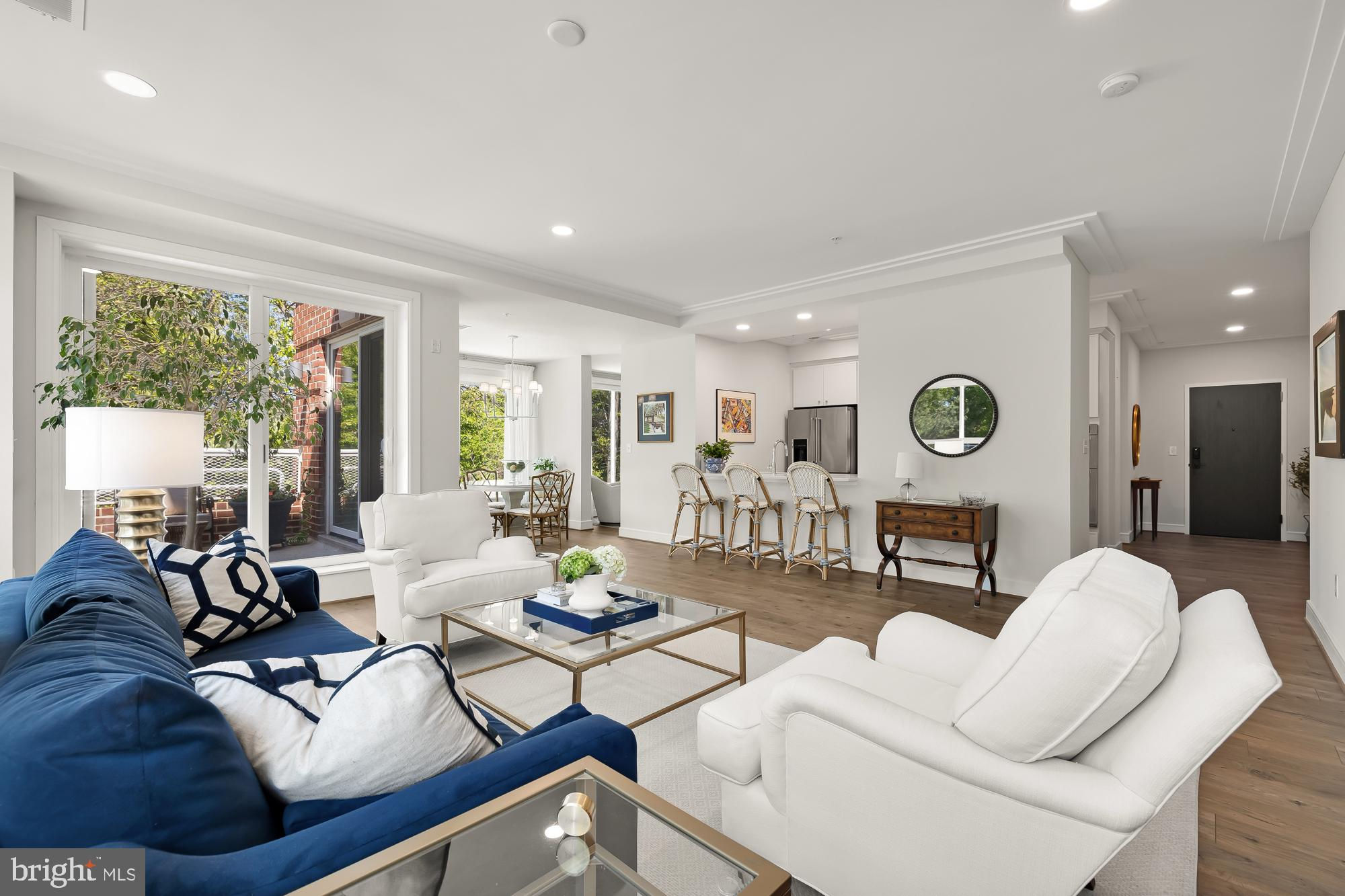 Welcome to 625 Slaters Lane, Unit 104! This is a stunning and sophisticated residence offering an elegant, modern lifestyle in the heart of Alexandria, VA. This exceptional corner unit boasts 1532 square feet of luxury living space, featuring 2 spacious bedrooms + a den and large scale windows that frame breathtaking 180-degree views of the surrounding greenery, creating a serene and picture-perfect environment. Upon entering, you are greeted by the grandeur of a proper foyer with storage. Before you access the kitchen and main living area you have the 2nd bedroom complete with an en suite to your right. The kitchen is equipped a 5 burner stove, quartz counter tops, and a large pantry with plenty of cabinet space and the perfect breakfast bar accessed from the dining area. The living space is absolutely breathtaking and offers abundant light and space which are perfect for both entertaining or just relaxing. The Primary suite has everything you need to recharge and relax. Walk in closet, En suite, with his and her quartz vanities. The den or additional rec room offers many options, including a TV room, Workout room, Office Space or additional flex space. Residents of this mid rise building enjoy access to an array of upscale amenities, including a full-time concierge, a gym, yoga studio, and a resident's lounge. The common media/recreation room and club house provide additional spaces for relaxation and entertainment. For added convenience, private storage is included, and laundry facilities are available in every unit. This home is truly a haven for those seeking a modern and sophisticated lifestyle, with panoramic views and a sense of tranquility that is unmatched.