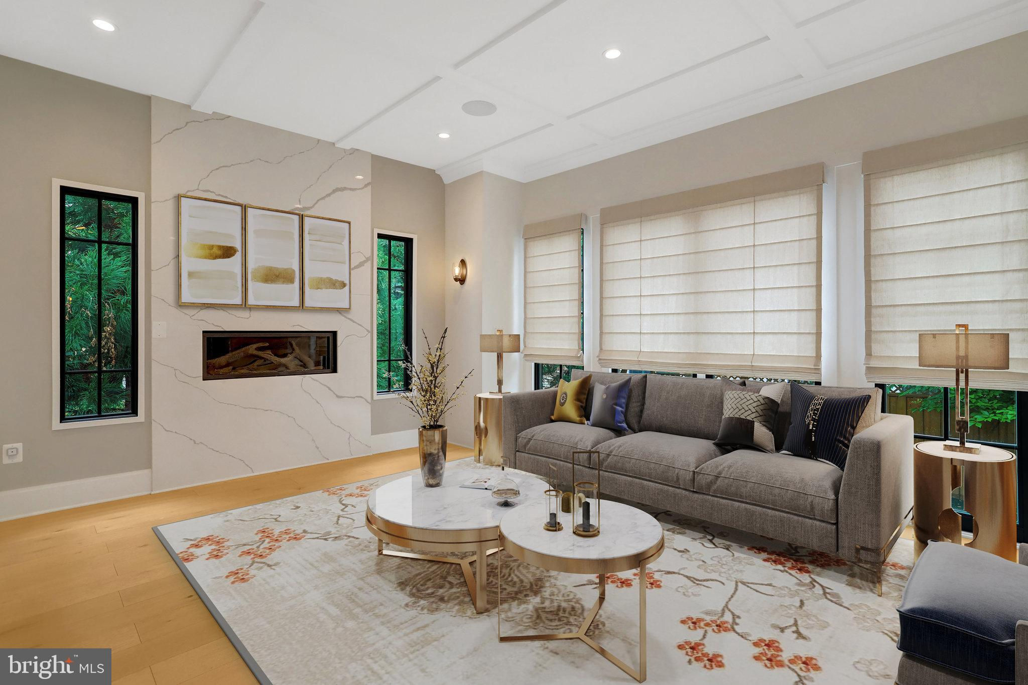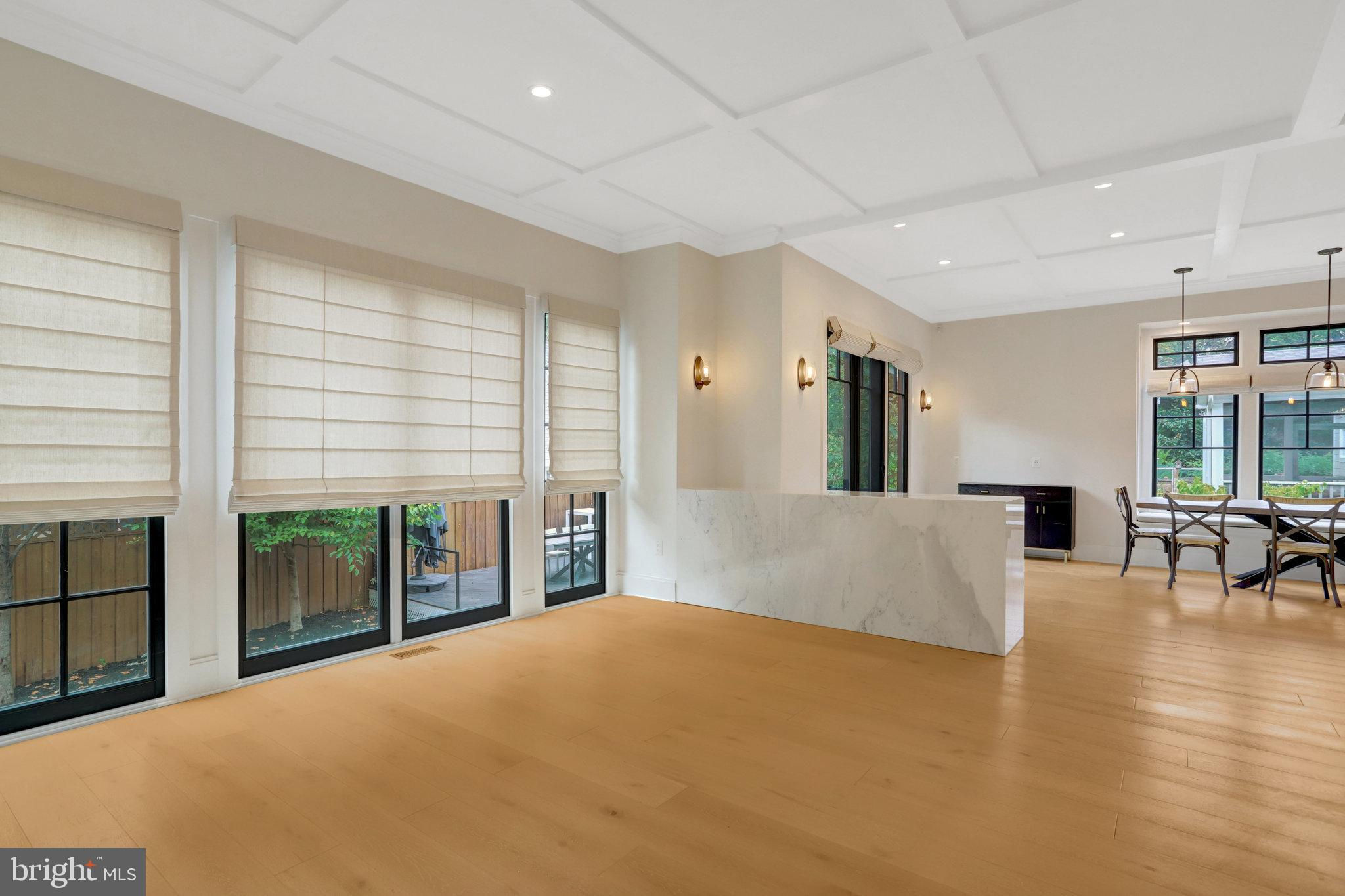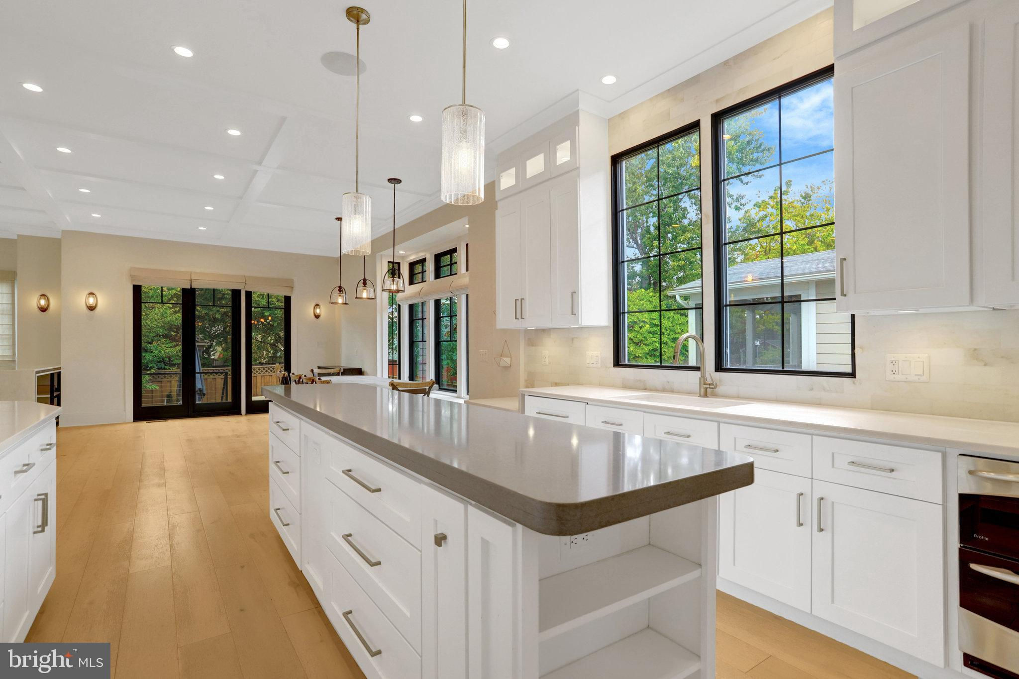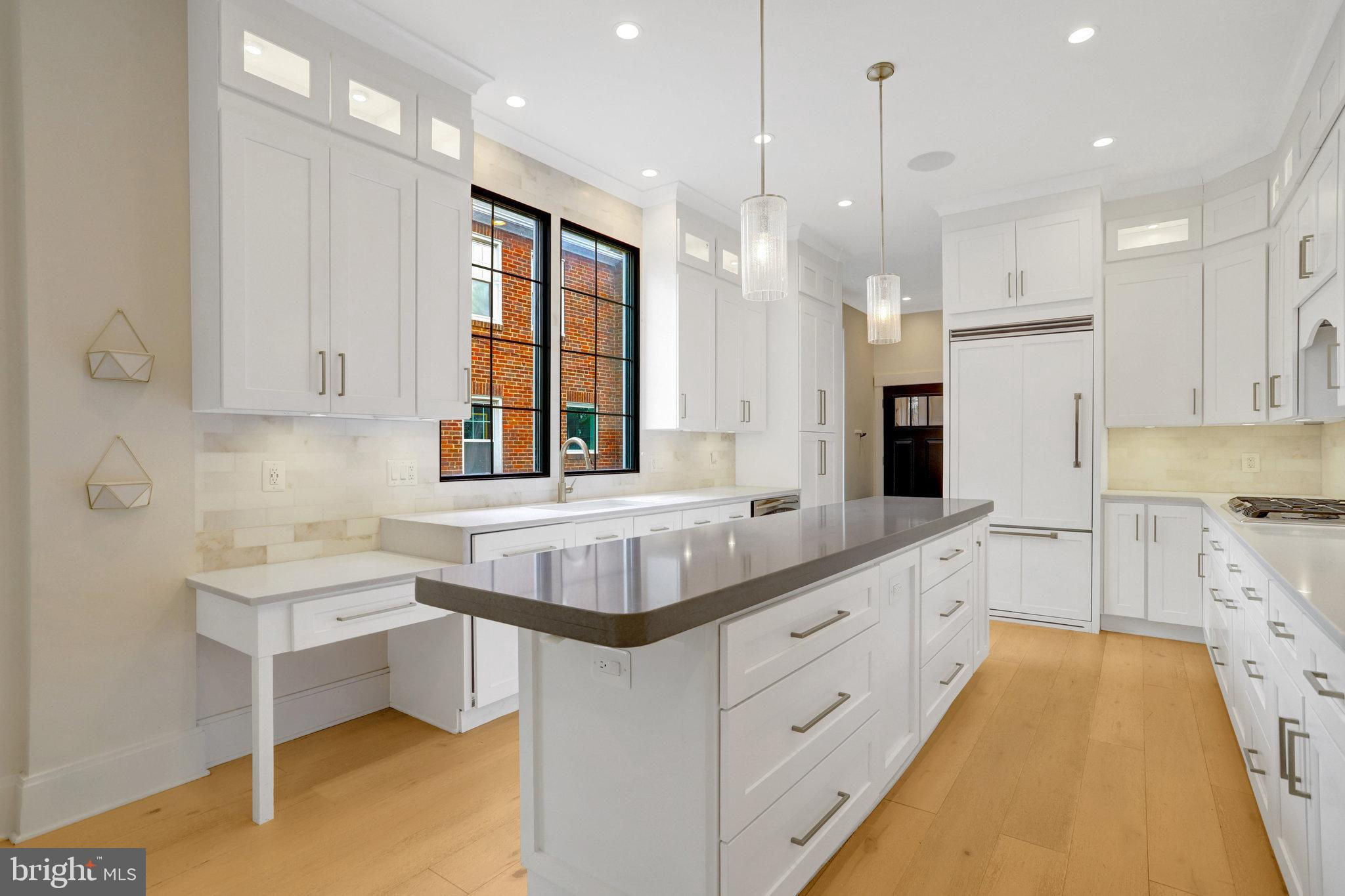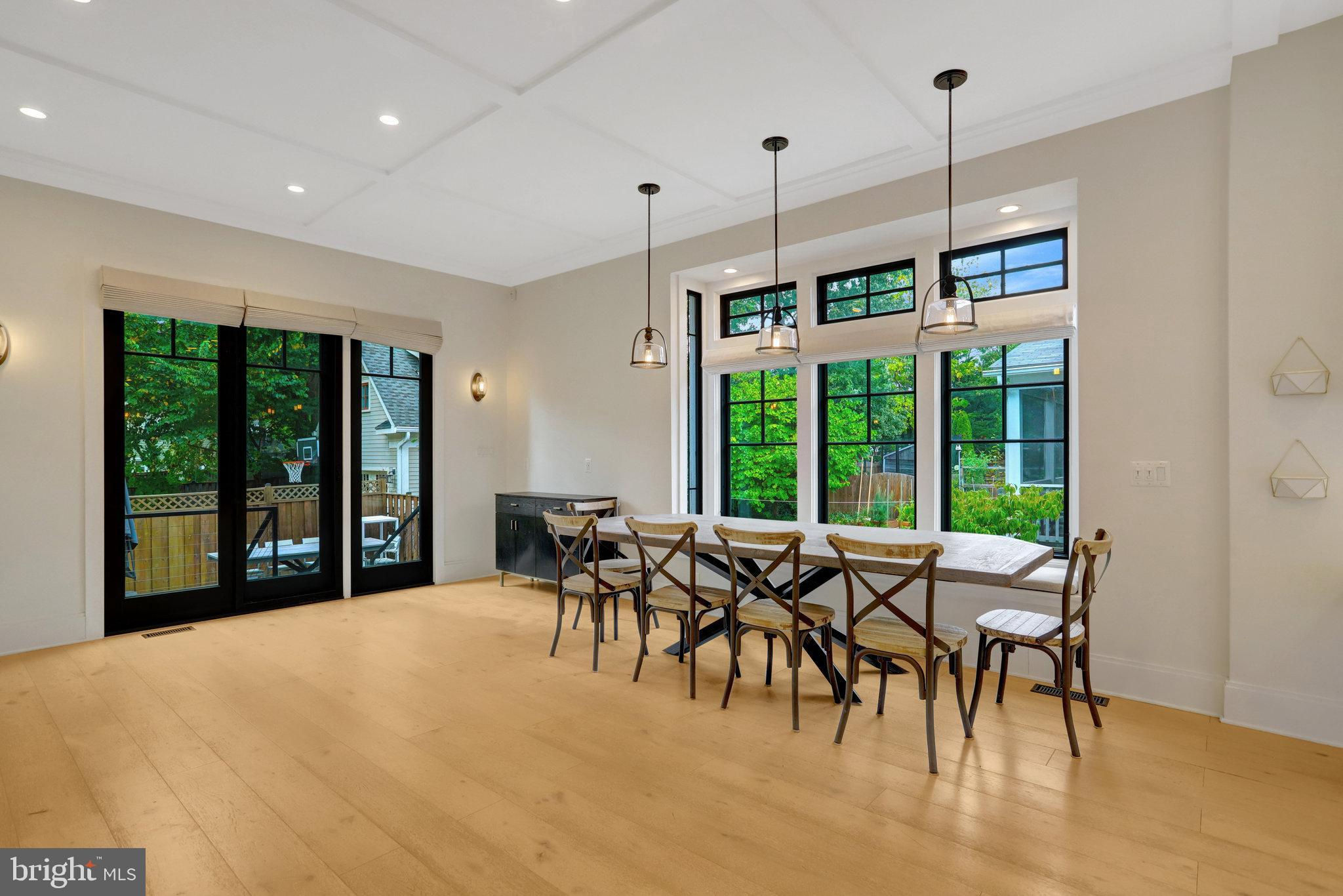 Located just 3 blocks from the Metro and across from Zitkala-Sa Park, this custom-built home offers over 5,000 square feet of beautifully designed living space. The open, contemporary floor plan feels inviting and bright, featuring 10-foot ceilings and wide-plank, hand-scraped light hardwood floors throughout the main and upper levels. The gourmet kitchen, finished in timeless white tones, enhances the home’s airy feel and flows seamlessly into the eat-in area with a built-in window seat and custom dining table that seats twelve. The family room centers around a striking custom marble fireplace, providing a comfortable space for relaxation and entertaining. A dining alcove, private study, mudroom with custom built-ins, and powder room complete the main level. Upstairs, the luxurious primary suite impresses with a cathedral ceiling, custom walk-in closet, and a stunning ensuite bath featuring a soaking tub, glass-enclosed shower, dual vanity, dedicated makeup counter, and private water closet. The upper level also includes two spacious bedrooms with a shared bath, a fourth bedroom with ensuite, and a conveniently located laundry room. The lower level offers a fifth bedroom, full bath, fully outfitted gym with mirrored wall and glass door, and a large recreation room featuring a built-in wine wall and wet bar with microwave and storage. Double doors lead to a walk-up exit and the fenced rear yard. Set on a .15-acre lot, the outdoor space includes a raised composite deck and a step-down to a flat, usable yard—perfect for entertaining or play.