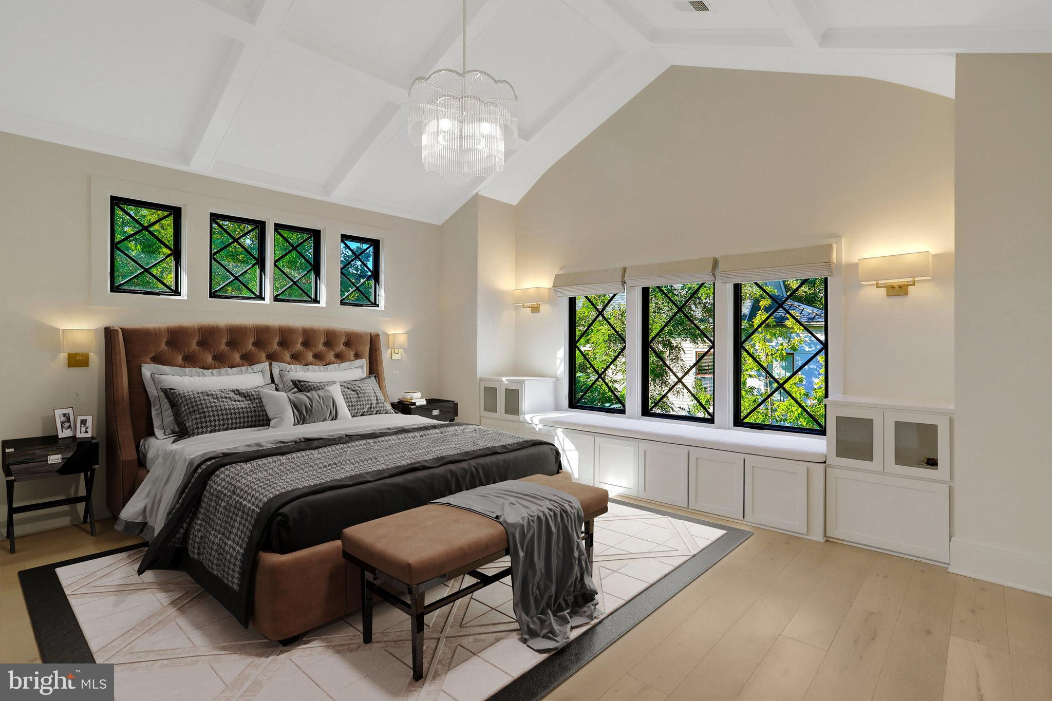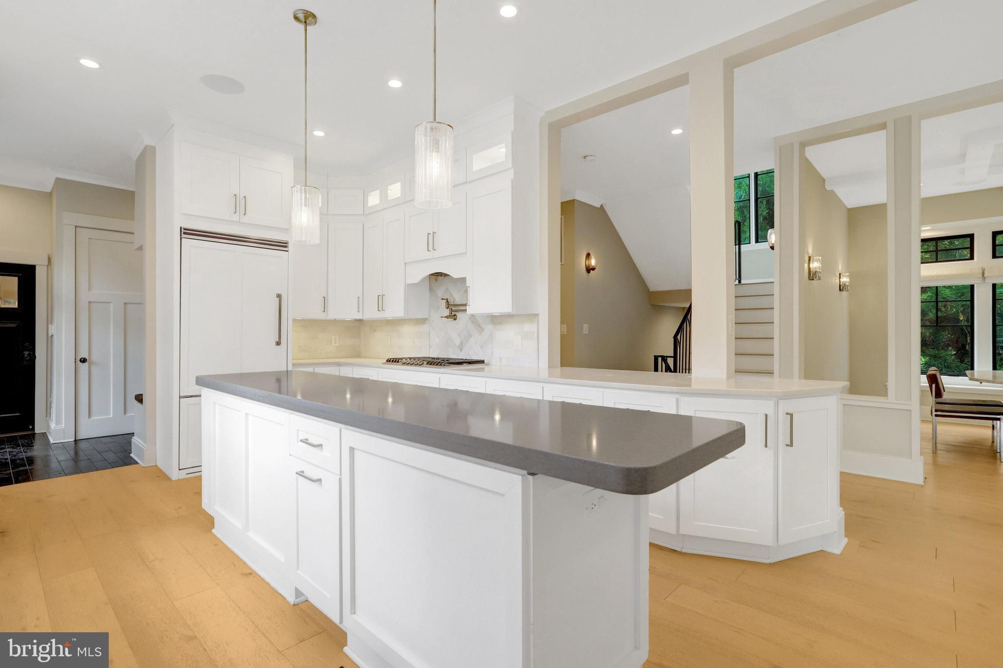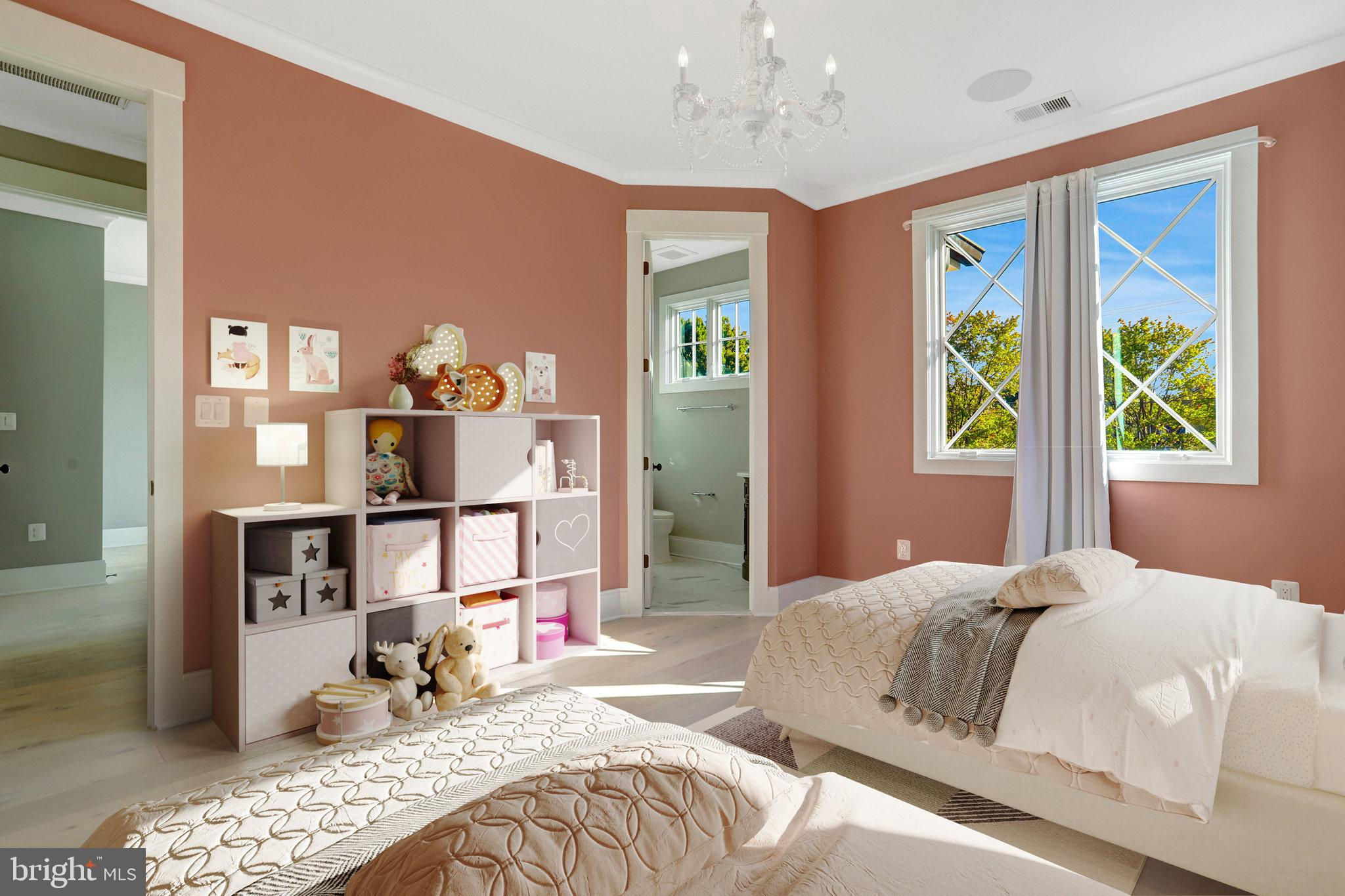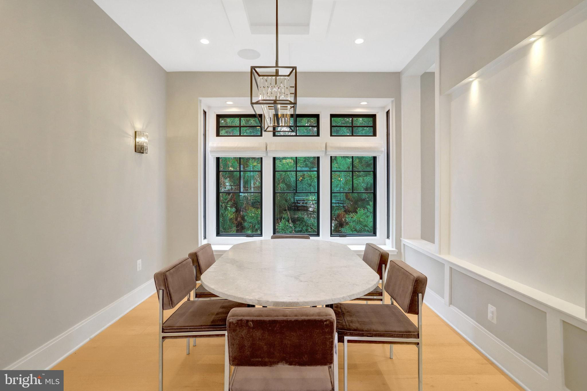 Located just 3 blocks from the Metro and across from Zitkala-Sa Park, this custom-built home offers over 5,000 square feet of beautifully designed living space. The open, contemporary floor plan feels inviting and bright, featuring 10-foot ceilings and wide-plank, hand-scraped light hardwood floors throughout the main and upper levels. The gourmet kitchen, finished in timeless white tones, enhances the home’s airy feel and flows seamlessly into the eat-in area with a built-in window seat and custom dining table that seats twelve. The family room centers around a striking custom marble fireplace, providing a comfortable space for relaxation and entertaining. A dining alcove, private study, mudroom with custom built-ins, and powder room complete the main level. Upstairs, the luxurious primary suite impresses with a cathedral ceiling, custom walk-in closet, and a stunning ensuite bath featuring a soaking tub, glass-enclosed shower, dual vanity, dedicated makeup counter, and private water closet. The upper level also includes two spacious bedrooms with a shared bath, a fourth bedroom with ensuite, and a conveniently located laundry room. The lower level offers a fifth bedroom, full bath, fully outfitted gym with mirrored wall and glass door, and a large recreation room featuring a built-in wine wall and wet bar with microwave and storage. Double doors lead to a walk-up exit and the fenced rear yard. Set on a .15-acre lot, the outdoor space includes a raised composite deck and a step-down to a flat, usable yard—perfect for entertaining or play.