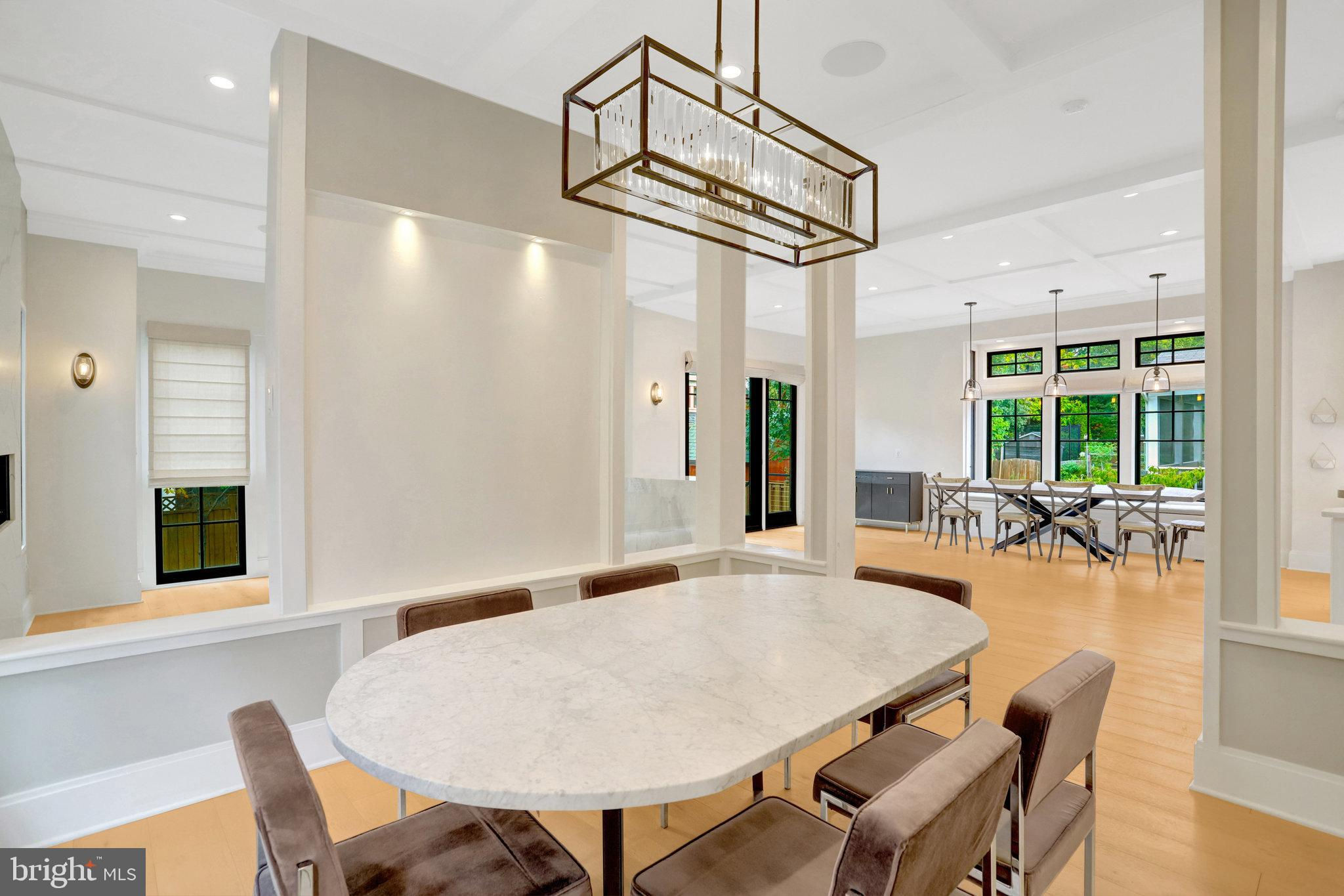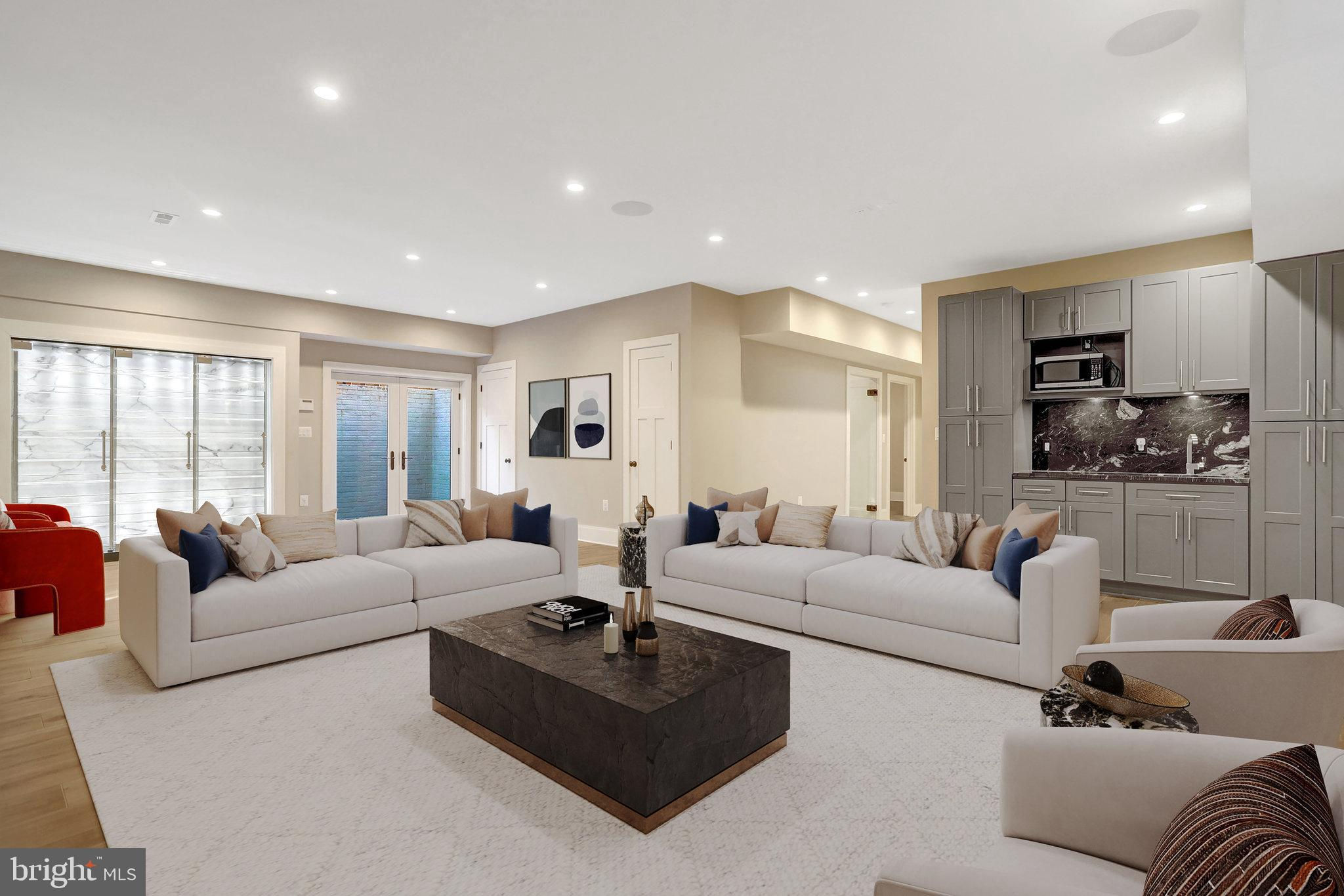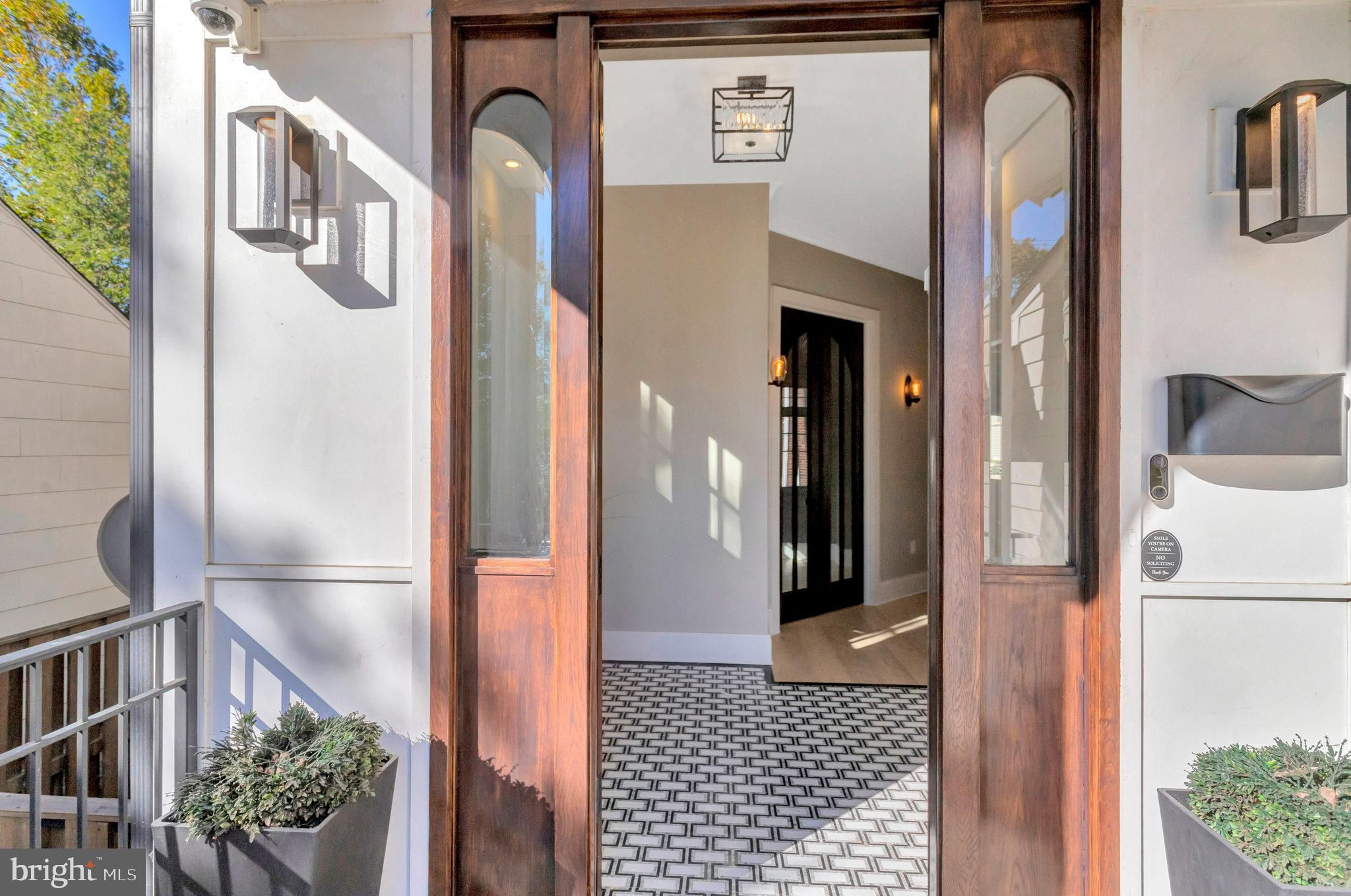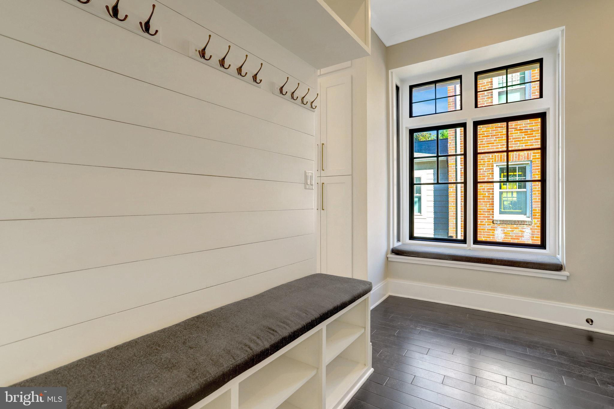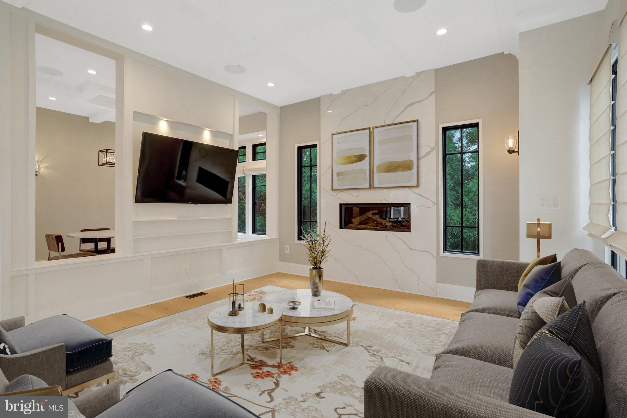Located just 3 blocks from the Metro and across from Zitkala-Sa Park, this custom-built home offers over 5,000 square feet of beautifully designed living space. The open, contemporary floor plan feels inviting and bright, featuring 10-foot ceilings and wide-plank, hand-scraped light hardwood floors throughout the main and upper levels. The gourmet kitchen, finished in timeless white tones, enhances the home’s airy feel and flows seamlessly into the eat-in area with a built-in window seat and custom dining table that seats twelve. The family room centers around a striking custom marble fireplace, providing a comfortable space for relaxation and entertaining. A dining alcove, private study, mudroom with custom built-ins, and powder room complete the main level. Upstairs, the luxurious primary suite impresses with a cathedral ceiling, custom walk-in closet, and a stunning ensuite bath featuring a soaking tub, glass-enclosed shower, dual vanity, dedicated makeup counter, and private water closet. The upper level also includes two spacious bedrooms with a shared bath, a fourth bedroom with ensuite, and a conveniently located laundry room. The lower level offers a fifth bedroom, full bath, fully outfitted gym with mirrored wall and glass door, and a large recreation room featuring a built-in wine wall and wet bar with microwave and storage. Double doors lead to a walk-up exit and the fenced rear yard. Set on a .15-acre lot, the outdoor space includes a raised composite deck and a step-down to a flat, usable yard—perfect for entertaining or play.