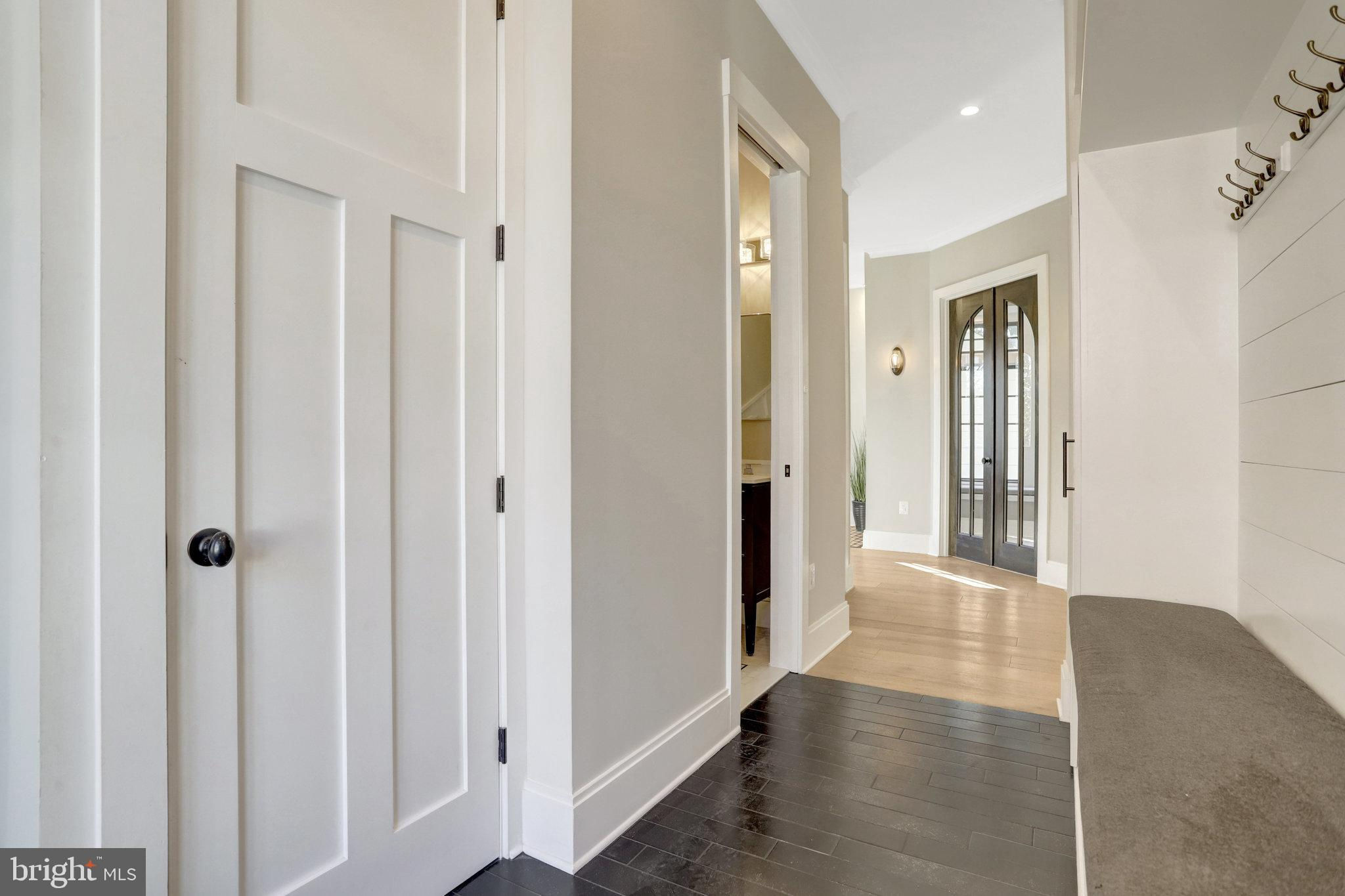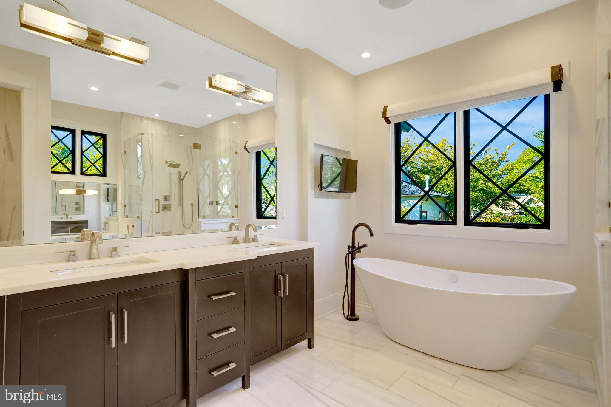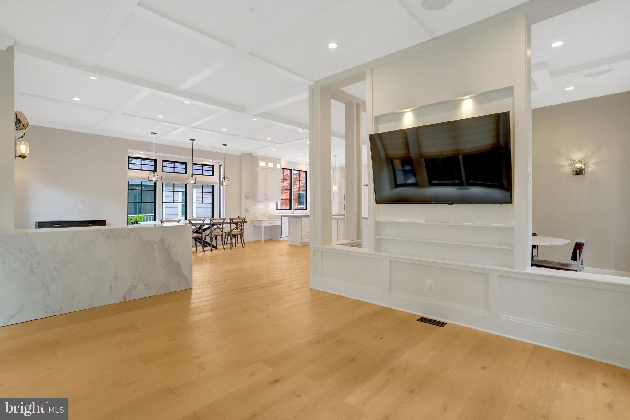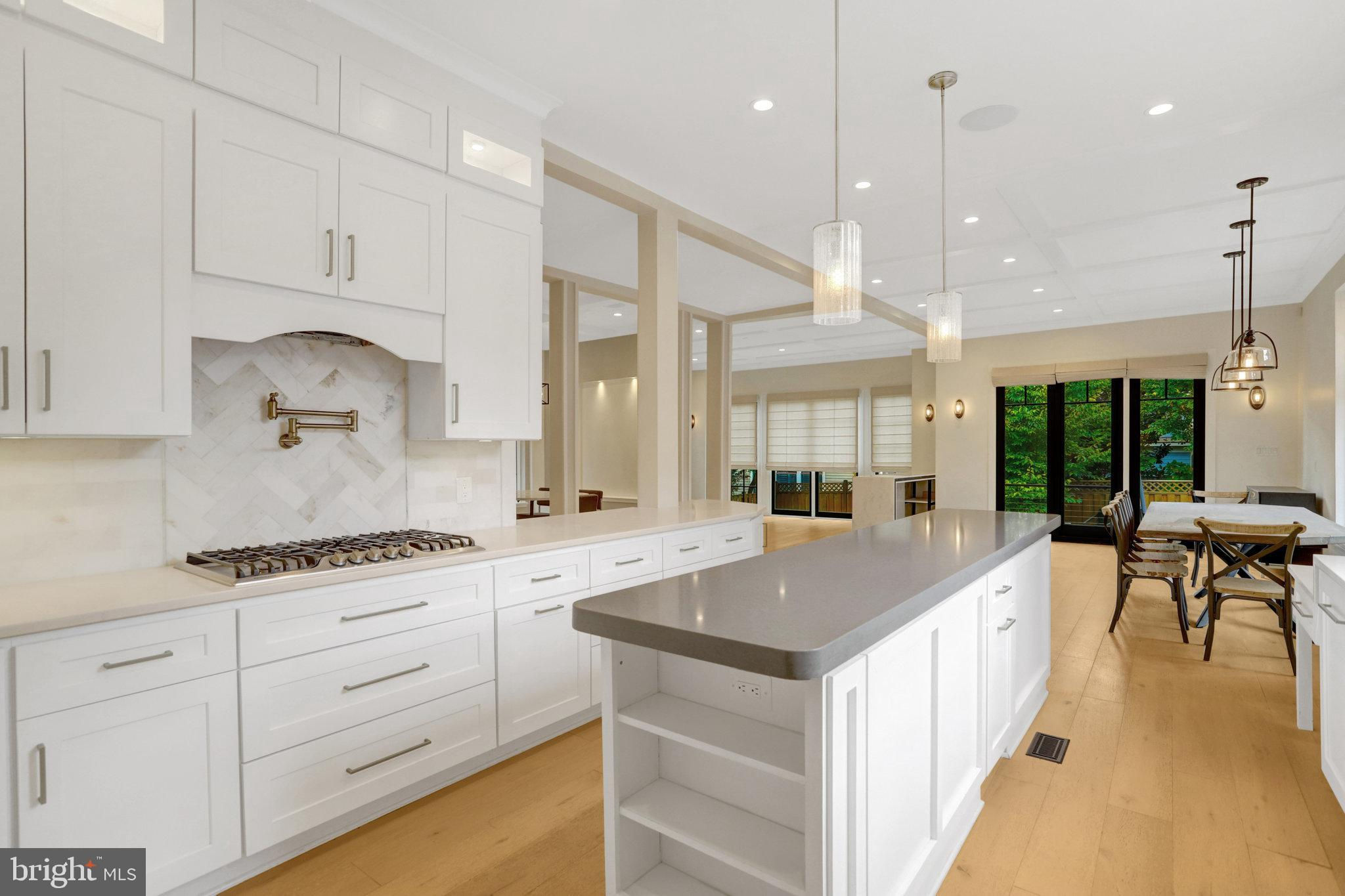 Located just 3 blocks from the Metro and across from Zitkala-Sa Park, this custom-built home offers over 5,000 square feet of beautifully designed living space. The open, contemporary floor plan feels inviting and bright, featuring 10-foot ceilings and wide-plank, hand-scraped light hardwood floors throughout the main and upper levels. The gourmet kitchen, finished in timeless white tones, enhances the home’s airy feel and flows seamlessly into the eat-in area with a built-in window seat and custom dining table that seats twelve. The family room centers around a striking custom marble fireplace, providing a comfortable space for relaxation and entertaining. A dining alcove, private study, mudroom with custom built-ins, and powder room complete the main level. Upstairs, the luxurious primary suite impresses with a cathedral ceiling, custom walk-in closet, and a stunning ensuite bath featuring a soaking tub, glass-enclosed shower, dual vanity, dedicated makeup counter, and private water closet. The upper level also includes two spacious bedrooms with a shared bath, a fourth bedroom with ensuite, and a conveniently located laundry room. The lower level offers a fifth bedroom, full bath, fully outfitted gym with mirrored wall and glass door, and a large recreation room featuring a built-in wine wall and wet bar with microwave and storage. Double doors lead to a walk-up exit and the fenced rear yard. Set on a .15-acre lot, the outdoor space includes a raised composite deck and a step-down to a flat, usable yard—perfect for entertaining or play.