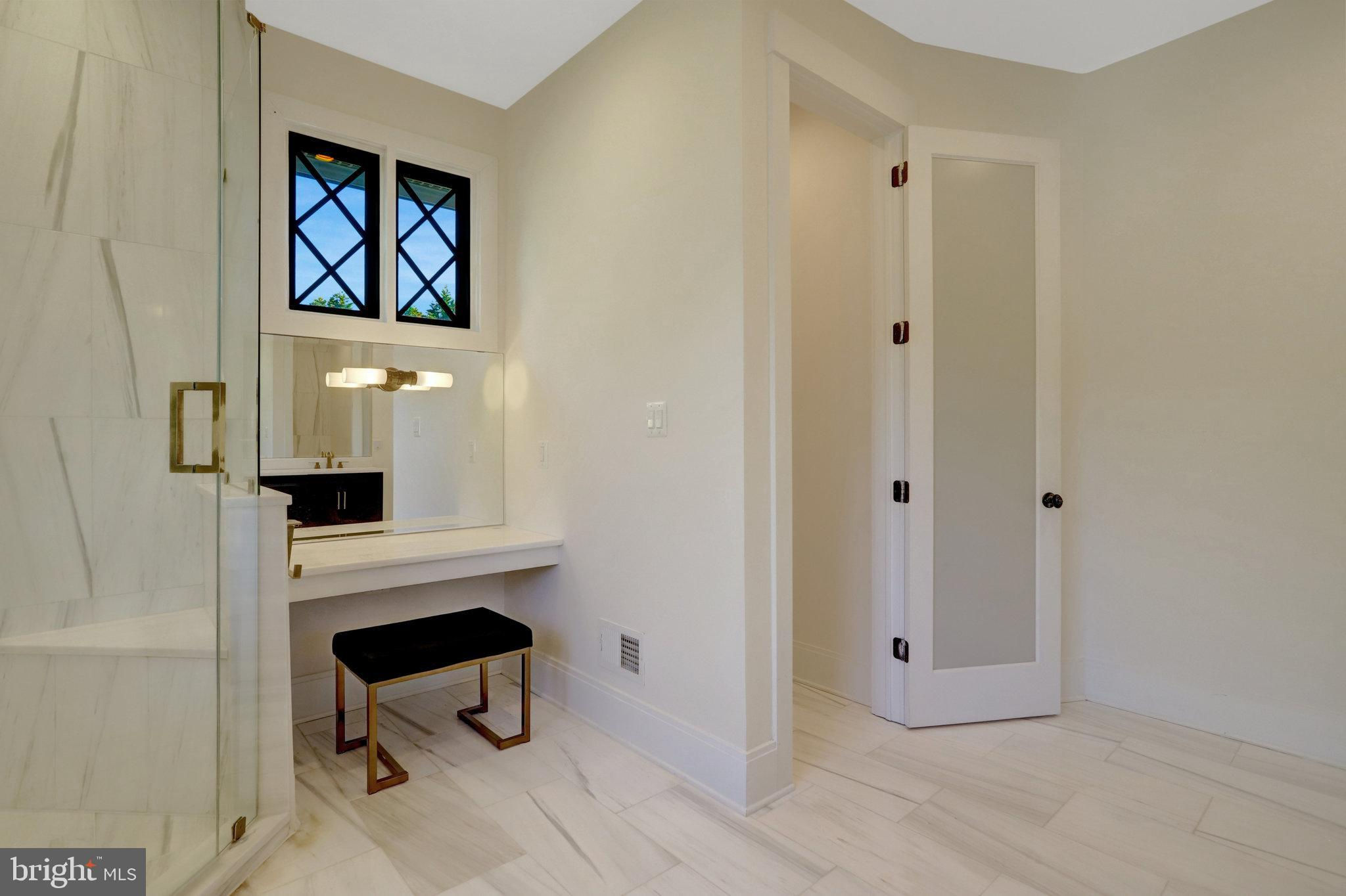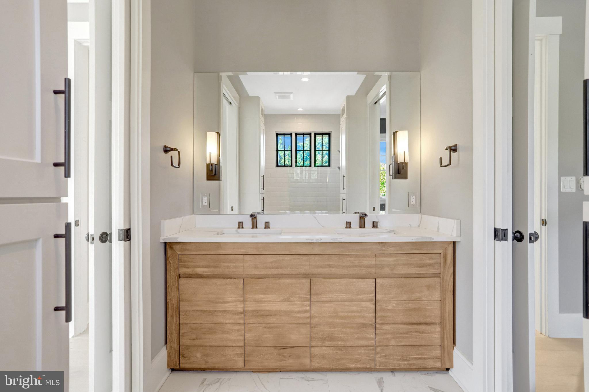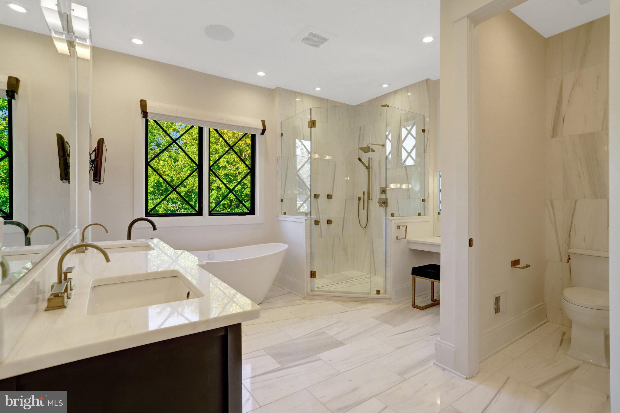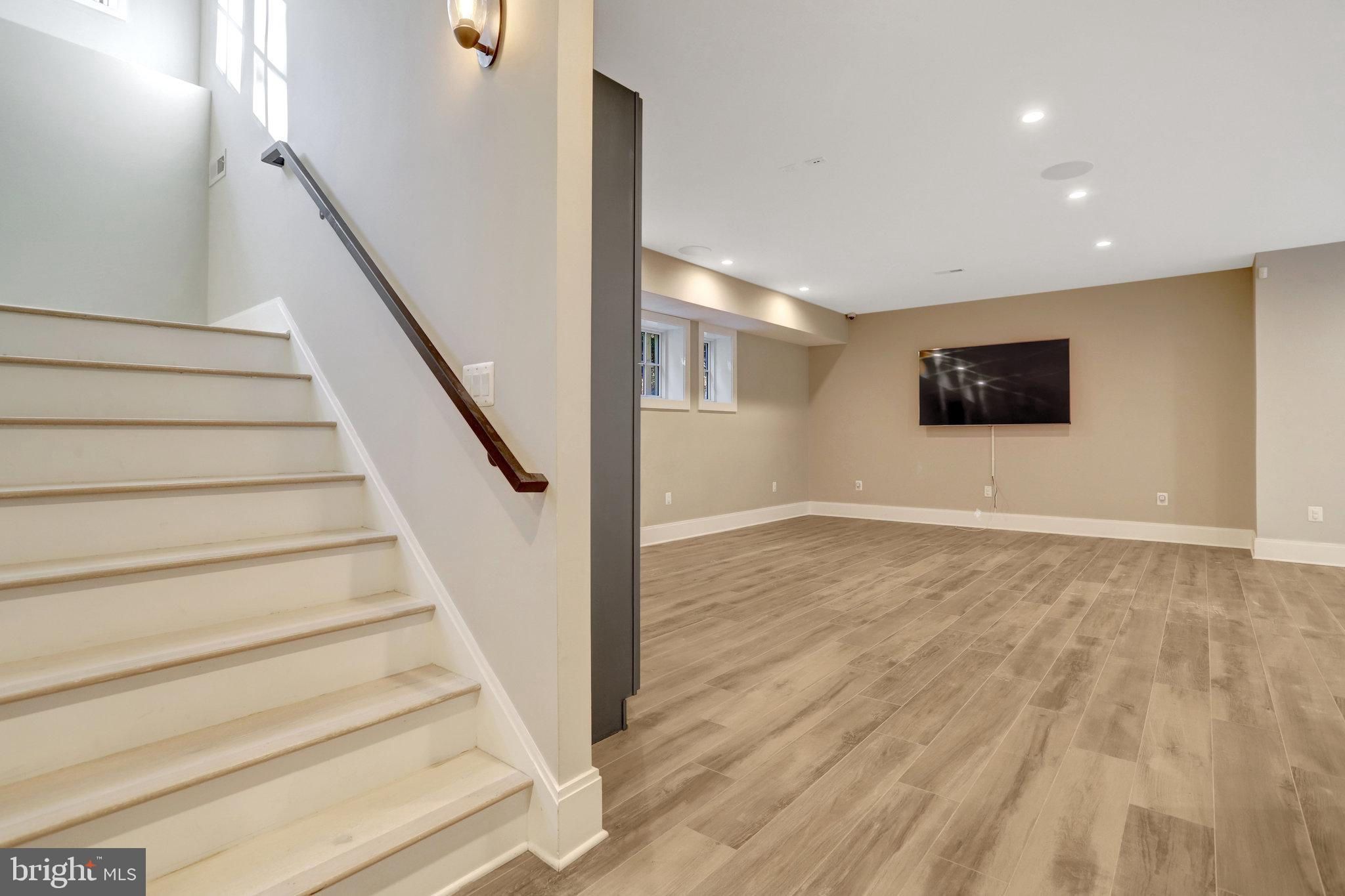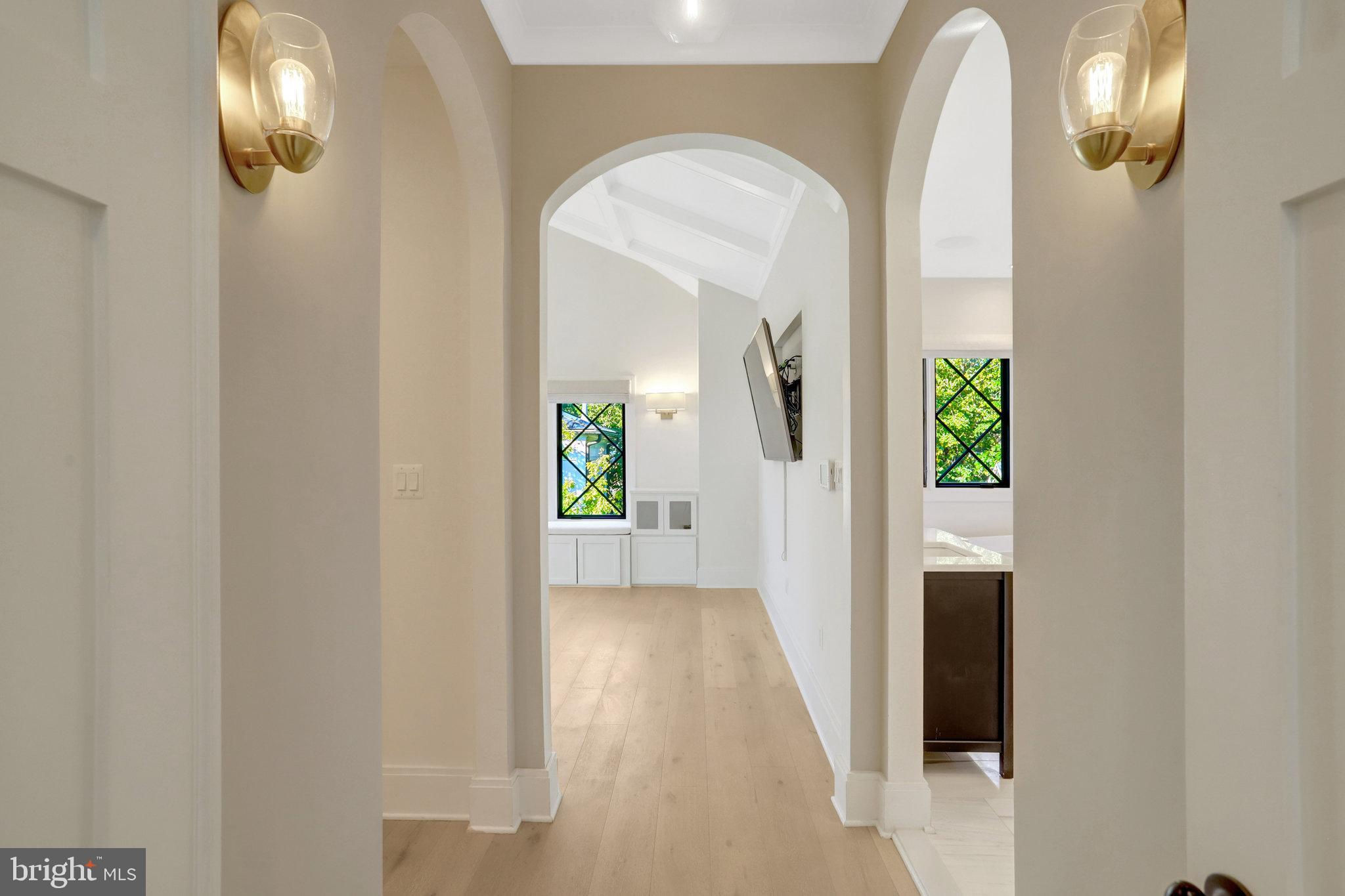 Located just 3 blocks from the Metro and across from Zitkala-Sa Park, this custom-built home offers over 5,000 square feet of beautifully designed living space. The open, contemporary floor plan feels inviting and bright, featuring 10-foot ceilings and wide-plank, hand-scraped light hardwood floors throughout the main and upper levels. The gourmet kitchen, finished in timeless white tones, enhances the home’s airy feel and flows seamlessly into the eat-in area with a built-in window seat and custom dining table that seats twelve. The family room centers around a striking custom marble fireplace, providing a comfortable space for relaxation and entertaining. A dining alcove, private study, mudroom with custom built-ins, and powder room complete the main level. Upstairs, the luxurious primary suite impresses with a cathedral ceiling, custom walk-in closet, and a stunning ensuite bath featuring a soaking tub, glass-enclosed shower, dual vanity, dedicated makeup counter, and private water closet. The upper level also includes two spacious bedrooms with a shared bath, a fourth bedroom with ensuite, and a conveniently located laundry room. The lower level offers a fifth bedroom, full bath, fully outfitted gym with mirrored wall and glass door, and a large recreation room featuring a built-in wine wall and wet bar with microwave and storage. Double doors lead to a walk-up exit and the fenced rear yard. Set on a .15-acre lot, the outdoor space includes a raised composite deck and a step-down to a flat, usable yard—perfect for entertaining or play.