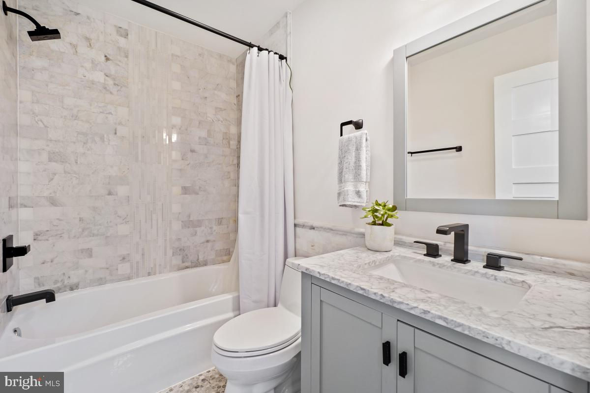 Nestled in the heart of the charming Petworth neighborhood, this stunning 4-bedroom, 3.5-bathroom rowhouse seamlessly blends timeless character with modern luxury, the result of a meticulous, full-scale renovation by renowned builder, Dilan Homes. From the moment you arrive, the home captivates with its welcoming curb appeal. A deep, gracious front porch offers the perfect spot to sit with morning coffee or chat with neighbors, setting the tone for the inviting warmth you’ll find throughout. Step inside to discover an expansive, light-filled interior highlighted by wide-plank floors, high ceilings, and thoughtful design details. Custom Hunter Douglas window treatments, installed throughout the home, provide both elegance and functionality while enhancing each room’s natural light. The open-concept main floor provides an effortless flow between living, dining, and entertaining spaces. A convenient powder room is thoughtfully placed on this level for guests. The spacious living room is perfect for both casual relaxation and formal gatherings, while the dining area easily accommodates large dinner parties. The centerpiece of the main level is the chef’s kitchen, designed for both beauty and functionality. Gleaming stainless steel appliances, white, shaker cabinetry with brass hardware, and exquisite calacatta marble countertops — carried seamlessly across the waterfall peninsula with bar seating — create a showstopping space that will delight home cooks and entertainers alike. From here, a patio door opens to an inviting deck and patio beyond, extending the living space outdoors and offering a private retreat for al fresco dining or evening cocktails. Upstairs, the primary suite feels like a private sanctuary. Soaring ceiling height and expansive windows bathe the room in natural light and the spa-inspired en-suite bathroom features marble finishes, a double vanity, and a walk-in shower with sleek glass doors — the perfect place to unwind after a long day. Two additional, generously proportioned bedrooms with ample closet space share a beautifully appointed second full bath, making this level both functional and comfortable for family, guests, or a home office. This floor is also equipped with a washer and dryer for ultimate convenience (one of two sets in the home!). The fully finished lower level offers incredible versatility with a connecting stairway as well as a private rear entrance. Designed for entertainment and relaxation, the open media room features a built-in wet bar complete with wine fridge and microwave, creating the perfect hub for movie nights, game days, or weekend gatherings. A spacious fourth bedroom and third full bathroom provide privacy and flexibility, ideal for guests, an au pair suite, or a quiet home office. This level also includes a second washer and dryer, adding practicality and ease to everyday living. Additional highlights include secure, off-street parking and energy-efficient systems throughout the home. Every element has been thoughtfully curated to maximize both style and livability. Set within one of D.C.’s most vibrant neighborhoods, this home offers not only a beautifully reimagined interior but also access to Petworth’s dynamic community. From local coffee shops and popular dining spots to parks, farmers markets, and cultural amenities, the best of urban living is just steps from your door. With its perfect combination of modern finishes, historic charm, and an ideal location, this residence embodies the pinnacle of city living — sophisticated, functional, and ready to welcome you home.