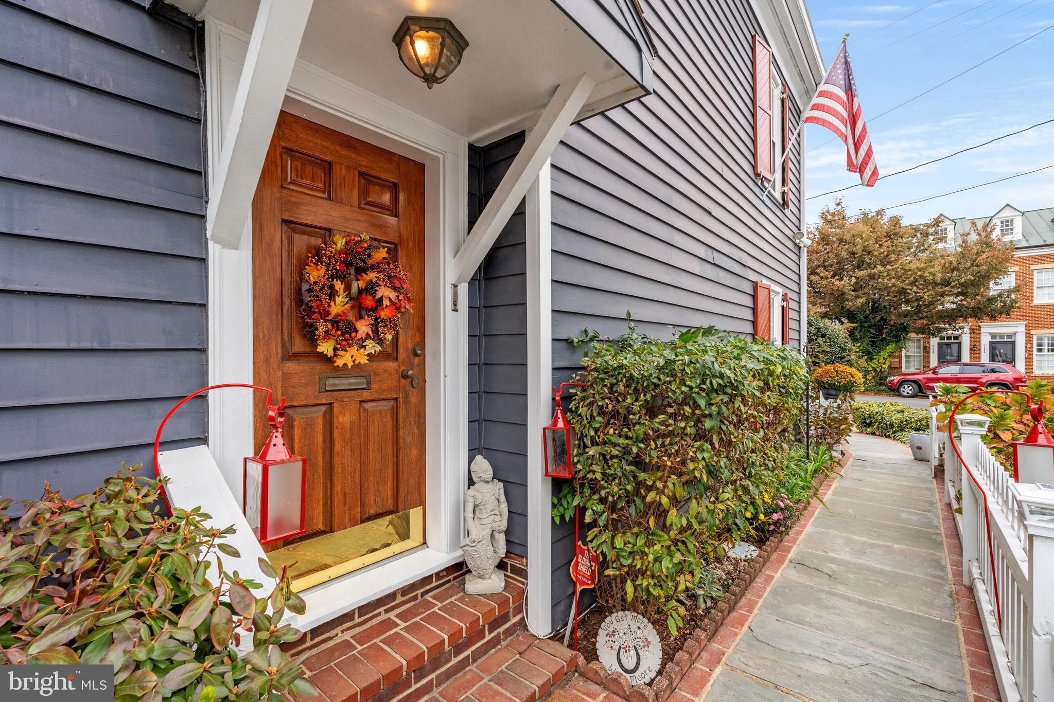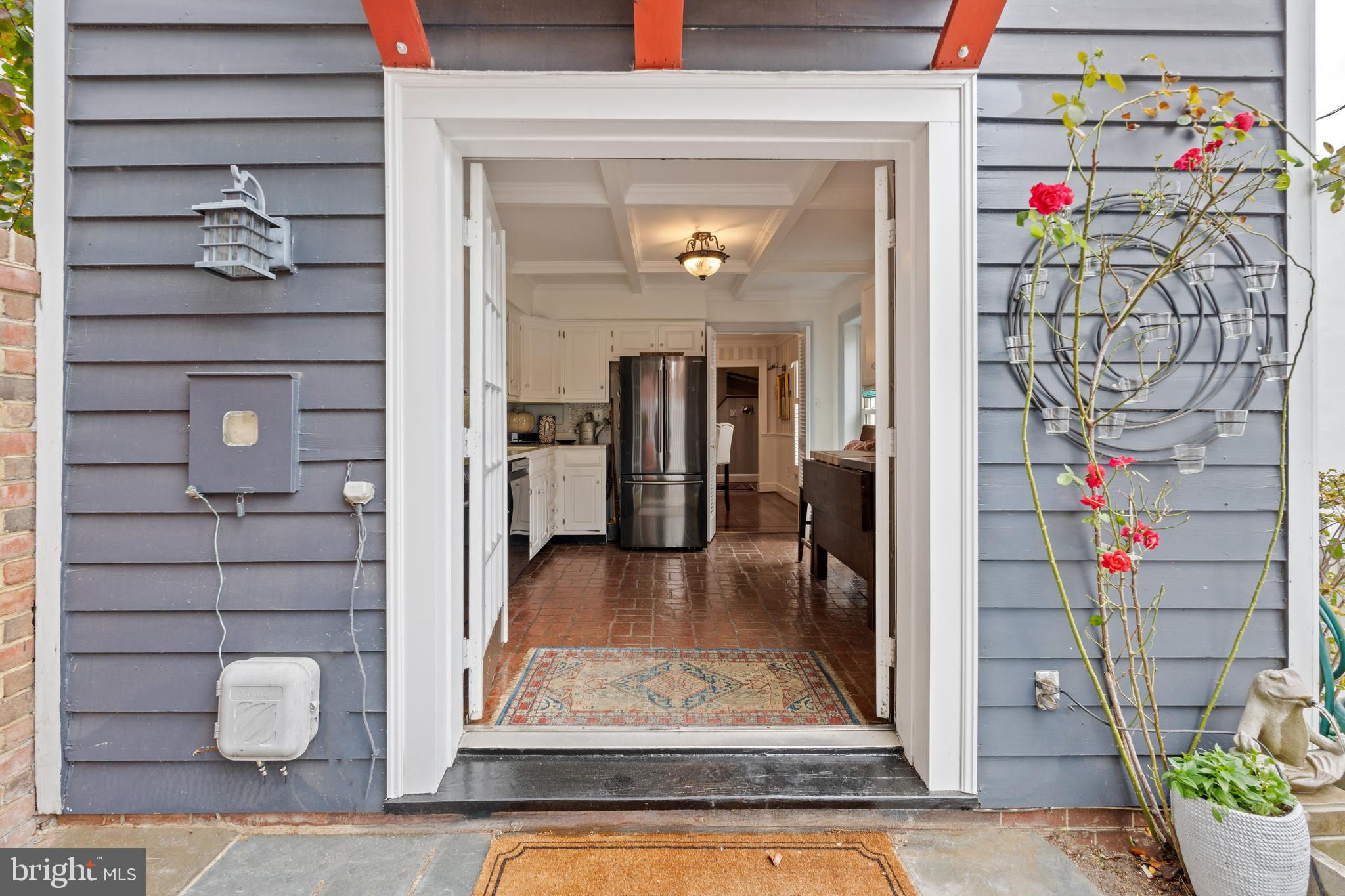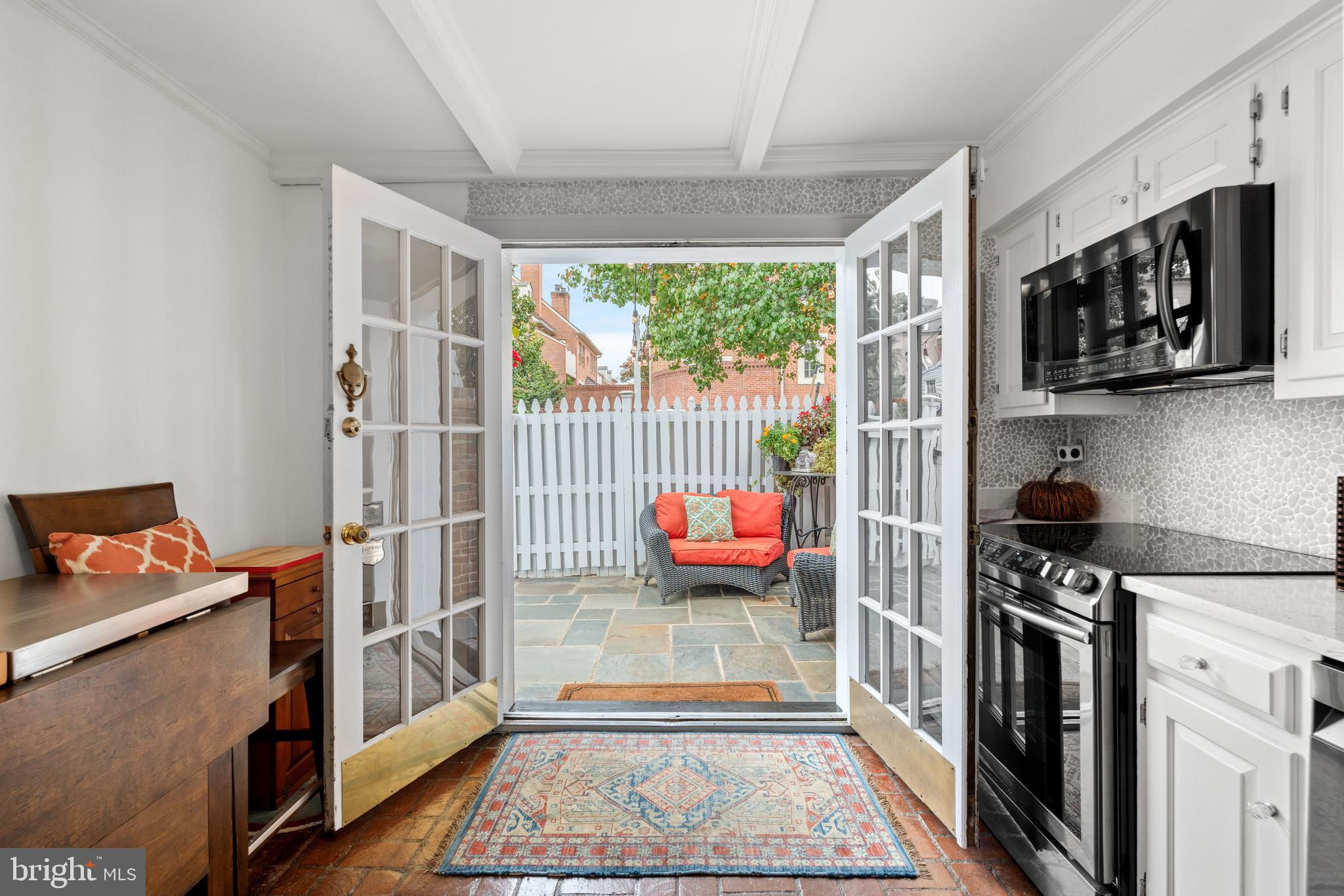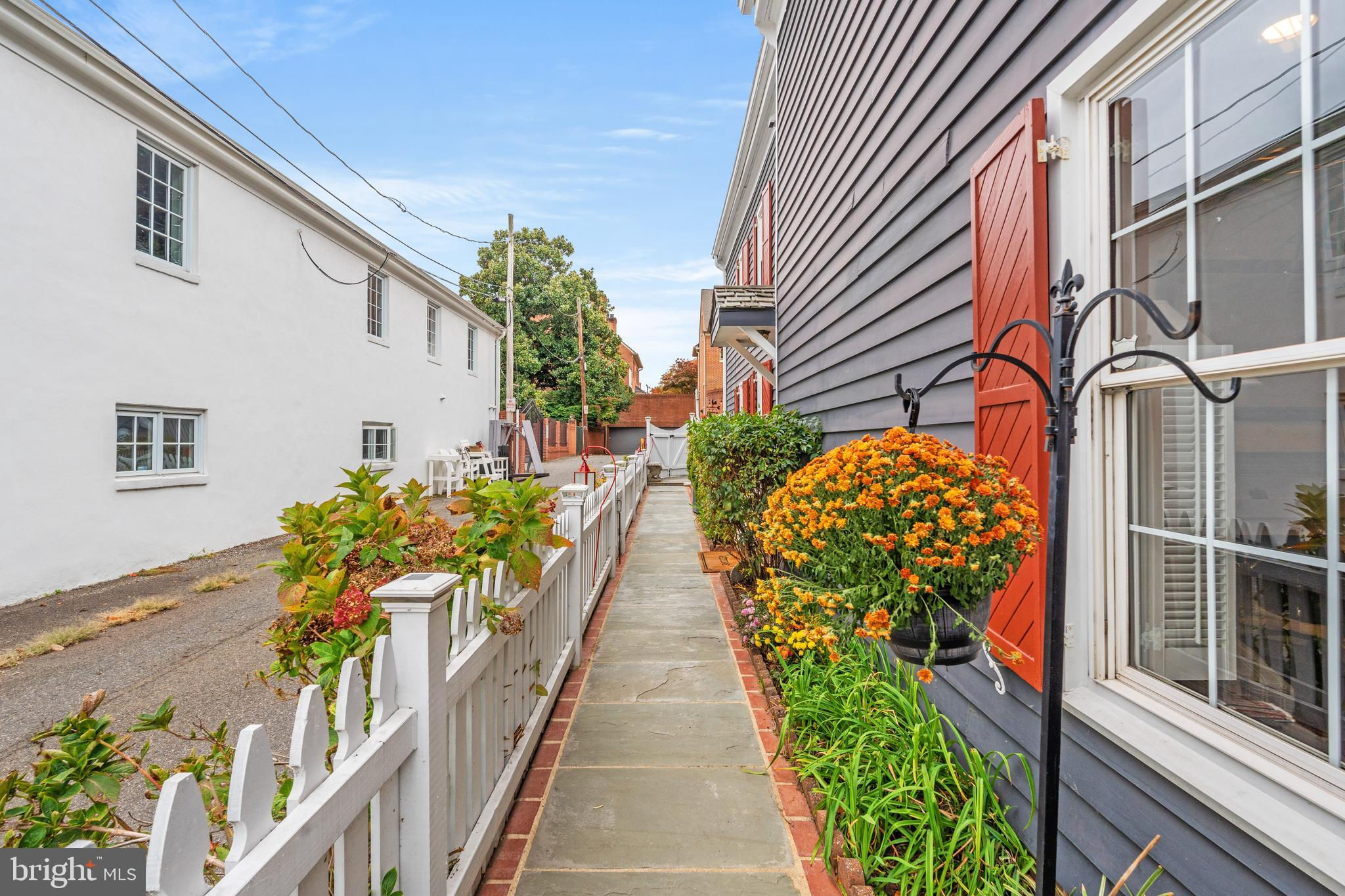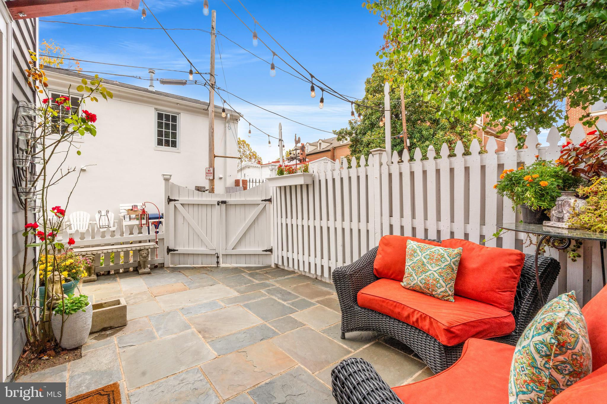 A rare opportunity in the heart of Old Town. Step through a solid wood front door with an oversized colonial-style brass lock into a dramatic three-story foyer crowned by an oversized skylight. Sun-filled rooms and classic craftsmanship set an elegant tone throughout. The living room features a 9’2” coffered ceiling, three-piece dentil crown molding, a bay window, and a wood-burning brick fireplace. Radiant-heated hardwood floors with a contrasting inlay add warmth and detail. A formal dining room showcases dentil crown, chair rail, wainscoting, and a seven-layer lacquered ceiling. The eat-in kitchen offers an antique handmade brick floor, coffered ceiling, and French doors that open to an all-season patio garden—perfect for everyday living and entertaining. Upstairs, a front bedroom enjoys a private full bath. The primary suite includes a French door to a Juliet balcony overlooking the patio, custom plantation shutters, two closets, a seven-layer lacquered ceiling, and wide-plank hardwood floors. The adjoining full bath features a double vanity set in an antique-style cabinet. A bedroom-level laundry closet provides side-by-side washer/dryer convenience. The top floor is a showstopper: a third bedroom/loft with cathedral ceiling, hardwood floors, and windows on all sides, plus a Nantucket-style full bath with shower, classic wainscoting, and storage tucked into the eaves. Outside, enjoy perennial gardens on the front, side, and rear—fully gated for privacy. Entry is via a private alley to two paved off-street parking spaces. A true “home for all seasons,” designed for comfortable living and effortless entertaining.