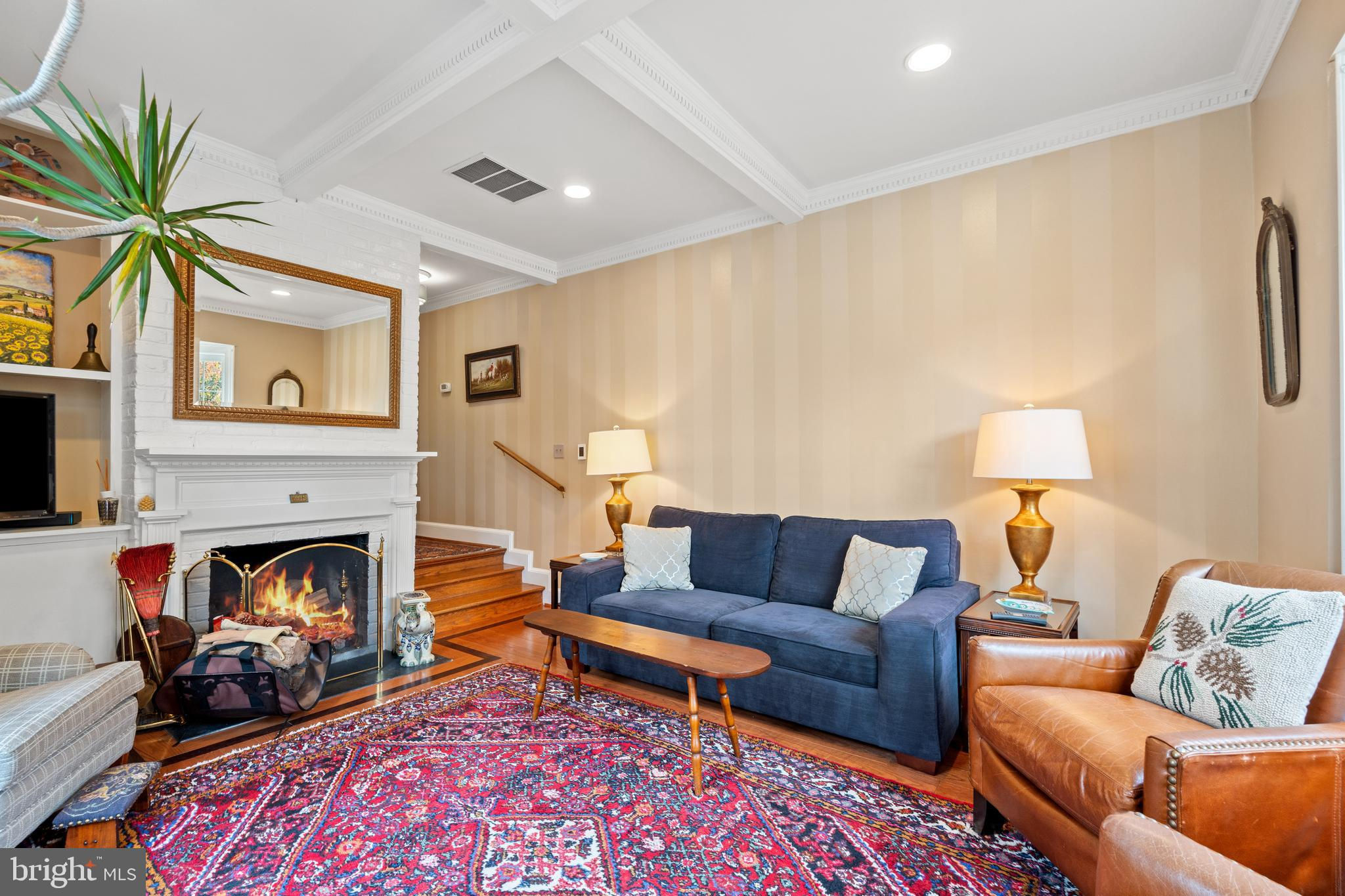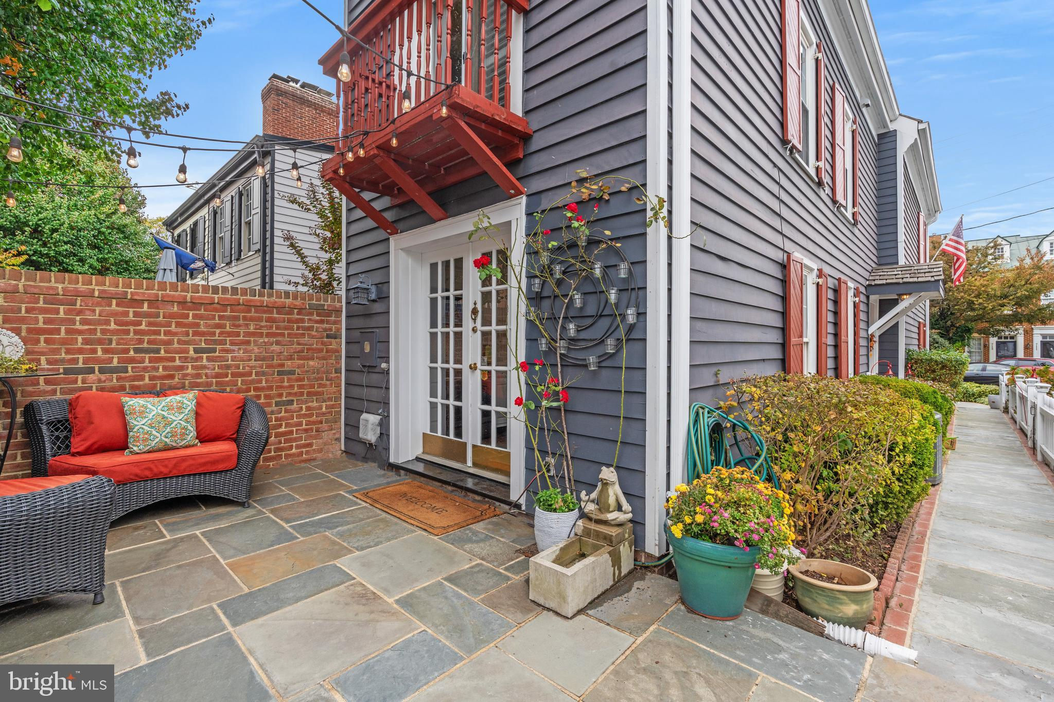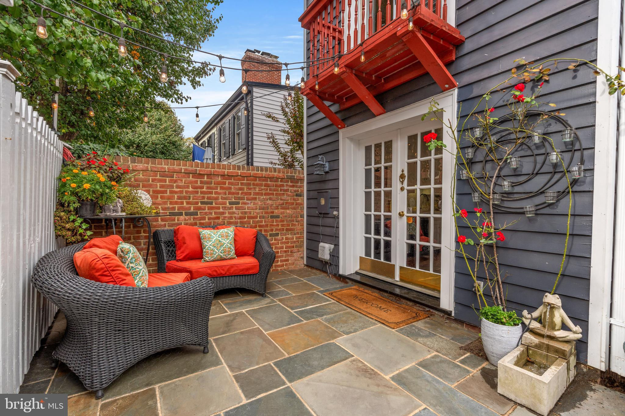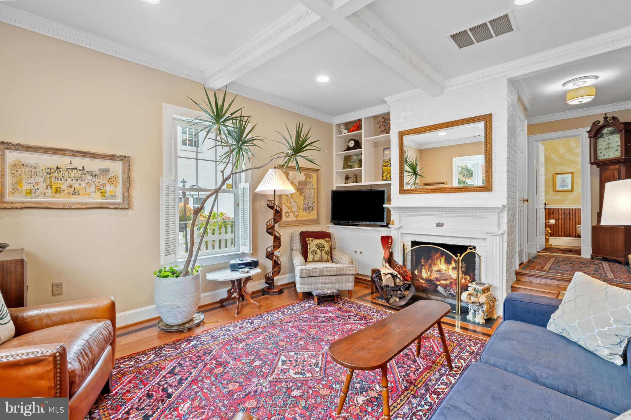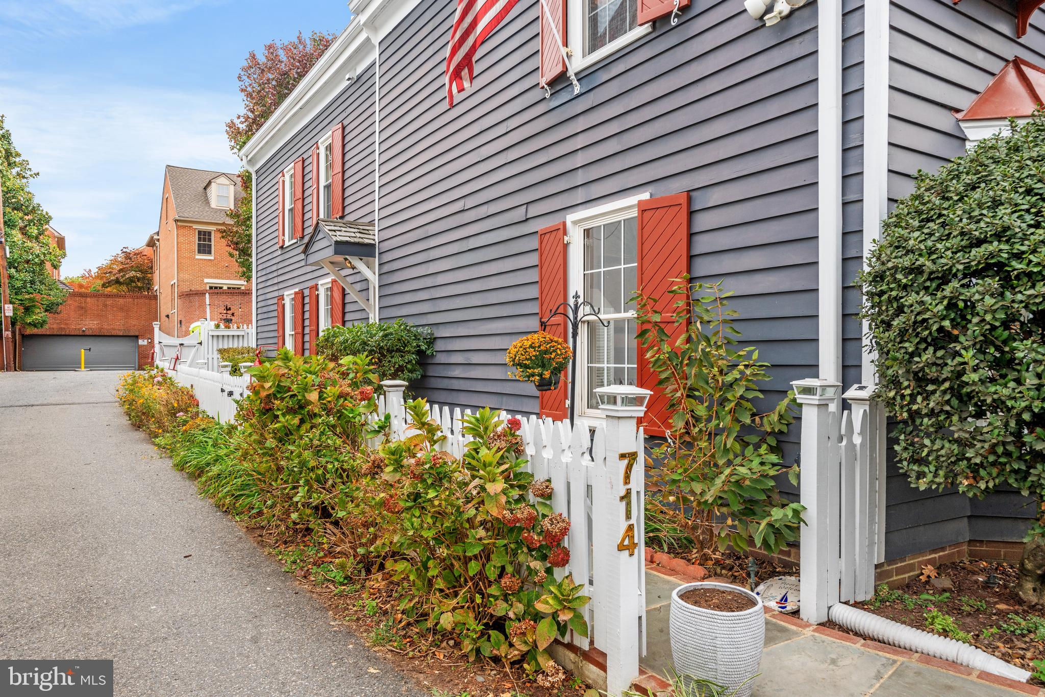 A rare opportunity in the heart of Old Town. Step through a solid wood front door with an oversized colonial-style brass lock into a dramatic three-story foyer crowned by an oversized skylight. Sun-filled rooms and classic craftsmanship set an elegant tone throughout. The living room features a 9’2” coffered ceiling, three-piece dentil crown molding, a bay window, and a wood-burning brick fireplace. Radiant-heated hardwood floors with a contrasting inlay add warmth and detail. A formal dining room showcases dentil crown, chair rail, wainscoting, and a seven-layer lacquered ceiling. The eat-in kitchen offers an antique handmade brick floor, coffered ceiling, and French doors that open to an all-season patio garden—perfect for everyday living and entertaining. Upstairs, a front bedroom enjoys a private full bath. The primary suite includes a French door to a Juliet balcony overlooking the patio, custom plantation shutters, two closets, a seven-layer lacquered ceiling, and wide-plank hardwood floors. The adjoining full bath features a double vanity set in an antique-style cabinet. A bedroom-level laundry closet provides side-by-side washer/dryer convenience. The top floor is a showstopper: a third bedroom/loft with cathedral ceiling, hardwood floors, and windows on all sides, plus a Nantucket-style full bath with shower, classic wainscoting, and storage tucked into the eaves. Outside, enjoy perennial gardens on the front, side, and rear—fully gated for privacy. Entry is via a private alley to two paved off-street parking spaces. A true “home for all seasons,” designed for comfortable living and effortless entertaining.