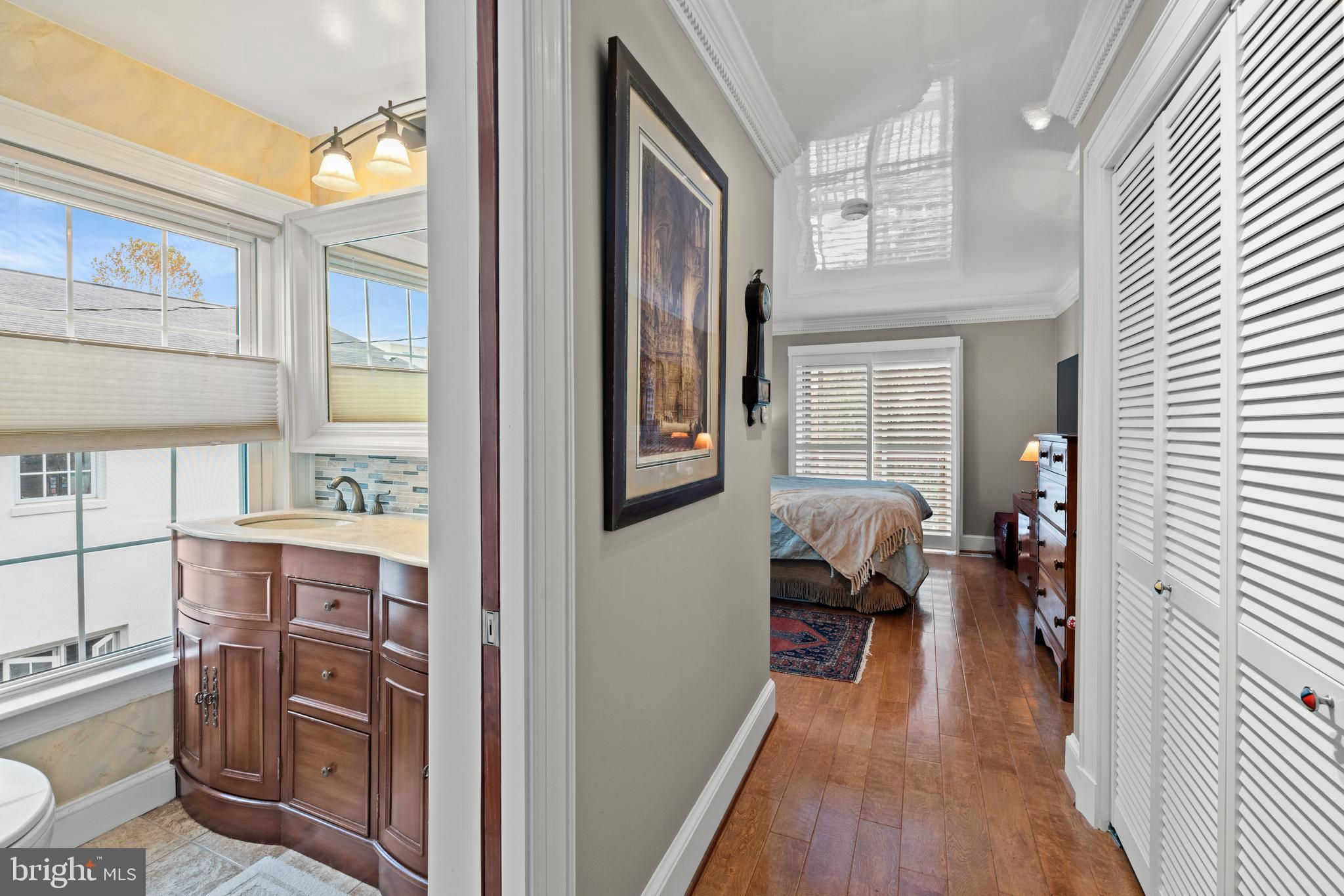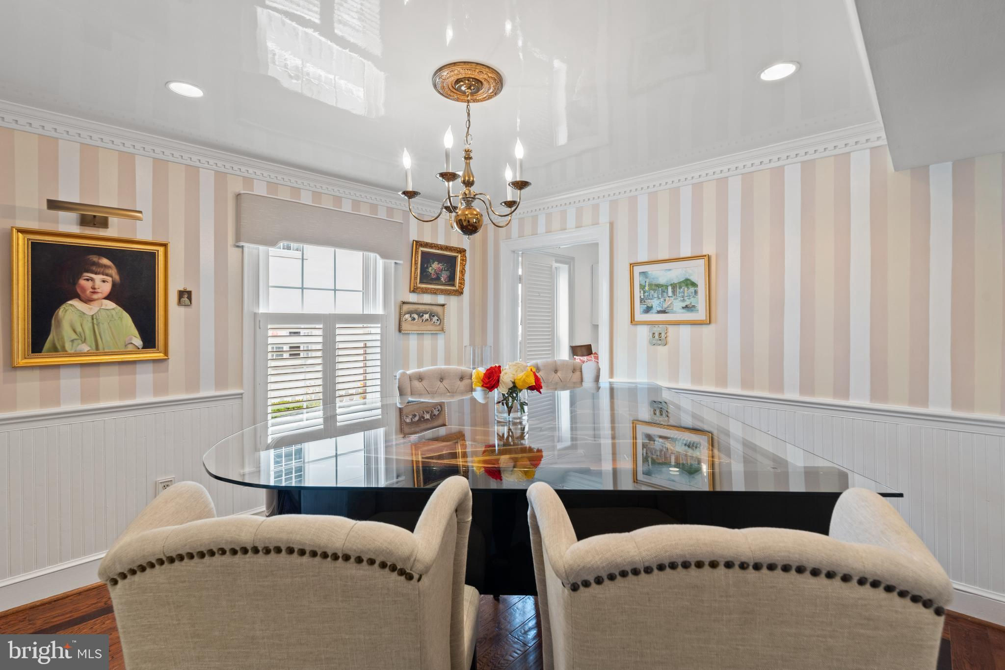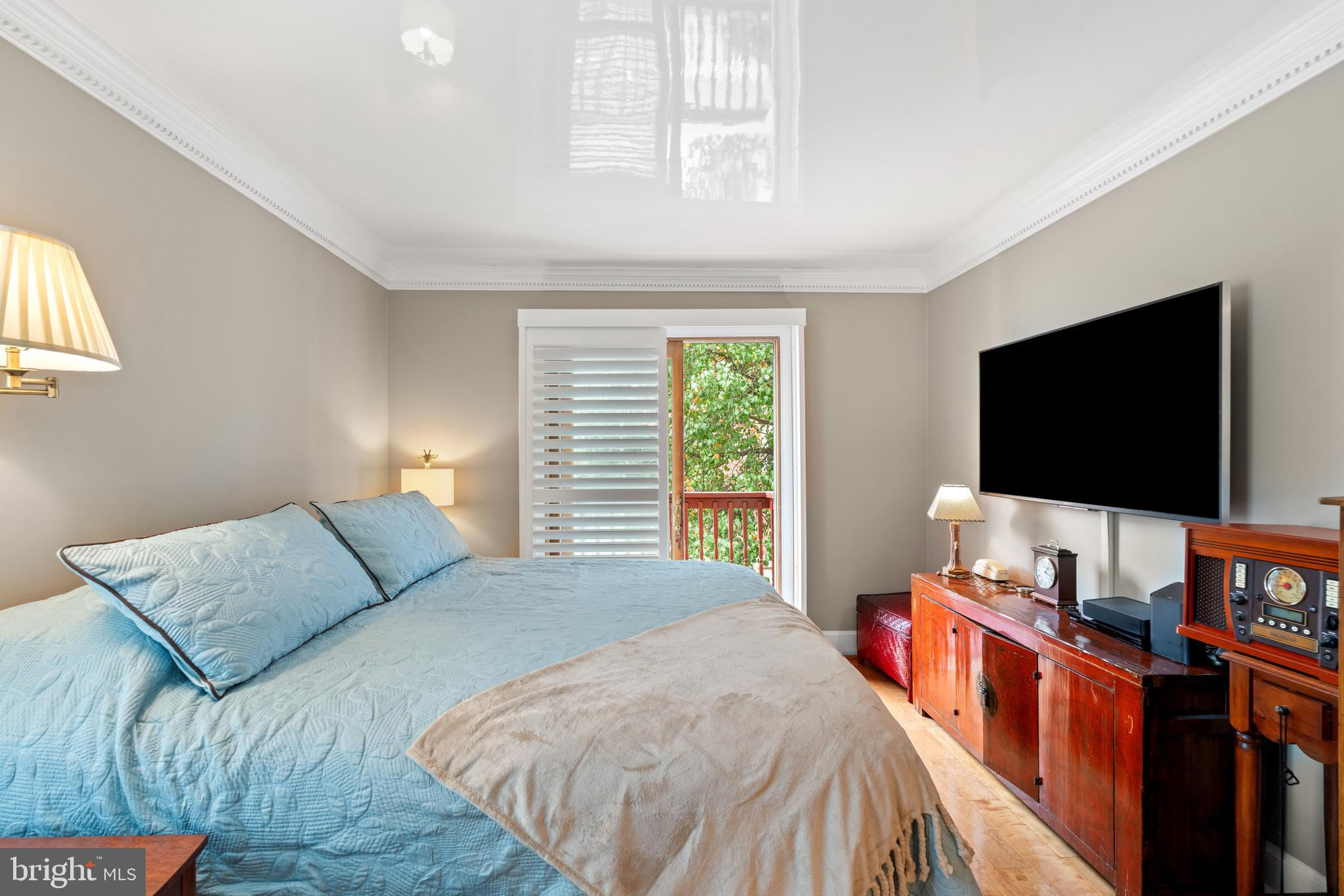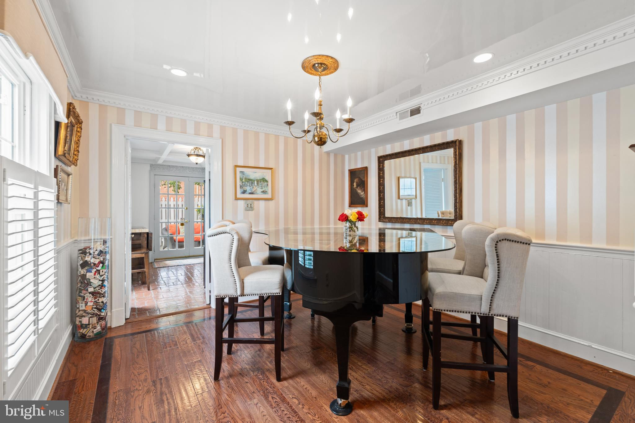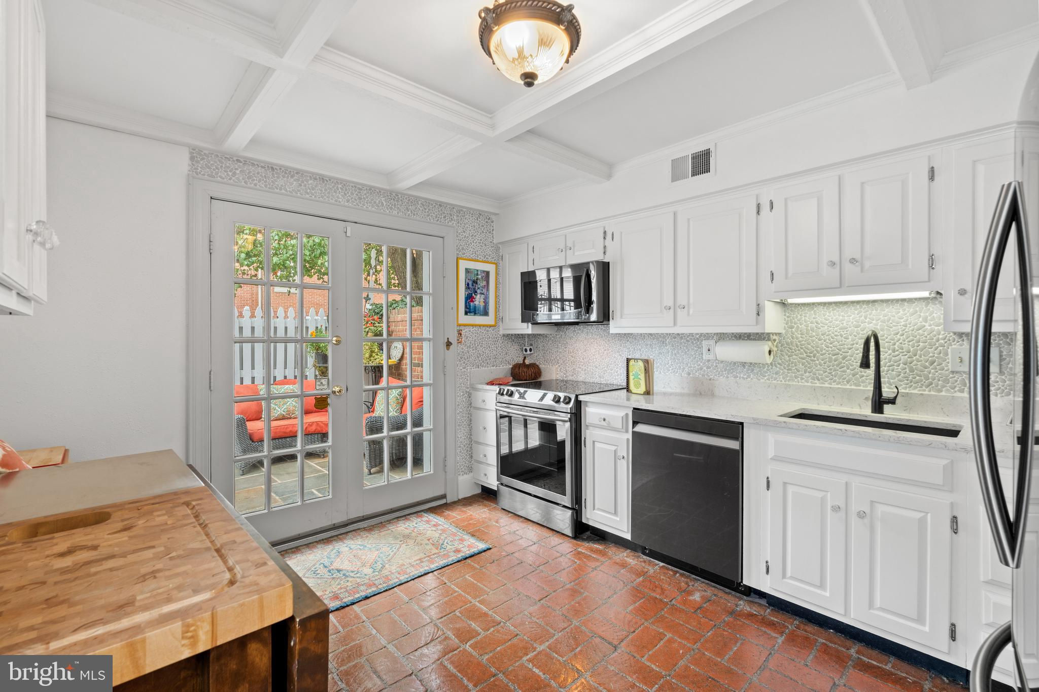 A rare opportunity in the heart of Old Town. Step through a solid wood front door with an oversized colonial-style brass lock into a dramatic three-story foyer crowned by an oversized skylight. Sun-filled rooms and classic craftsmanship set an elegant tone throughout. The living room features a 9’2” coffered ceiling, three-piece dentil crown molding, a bay window, and a wood-burning brick fireplace. Radiant-heated hardwood floors with a contrasting inlay add warmth and detail. A formal dining room showcases dentil crown, chair rail, wainscoting, and a seven-layer lacquered ceiling. The eat-in kitchen offers an antique handmade brick floor, coffered ceiling, and French doors that open to an all-season patio garden—perfect for everyday living and entertaining. Upstairs, a front bedroom enjoys a private full bath. The primary suite includes a French door to a Juliet balcony overlooking the patio, custom plantation shutters, two closets, a seven-layer lacquered ceiling, and wide-plank hardwood floors. The adjoining full bath features a double vanity set in an antique-style cabinet. A bedroom-level laundry closet provides side-by-side washer/dryer convenience. The top floor is a showstopper: a third bedroom/loft with cathedral ceiling, hardwood floors, and windows on all sides, plus a Nantucket-style full bath with shower, classic wainscoting, and storage tucked into the eaves. Outside, enjoy perennial gardens on the front, side, and rear—fully gated for privacy. Entry is via a private alley to two paved off-street parking spaces. A true “home for all seasons,” designed for comfortable living and effortless entertaining.