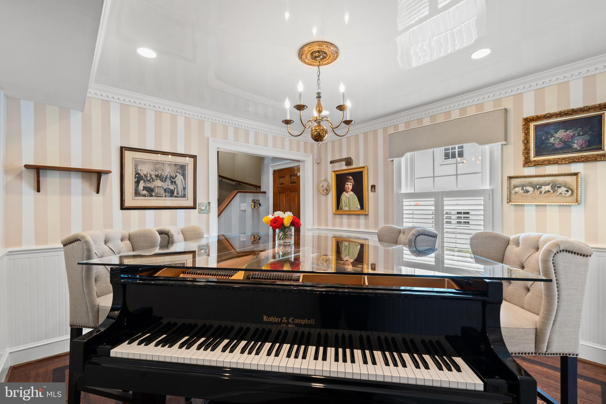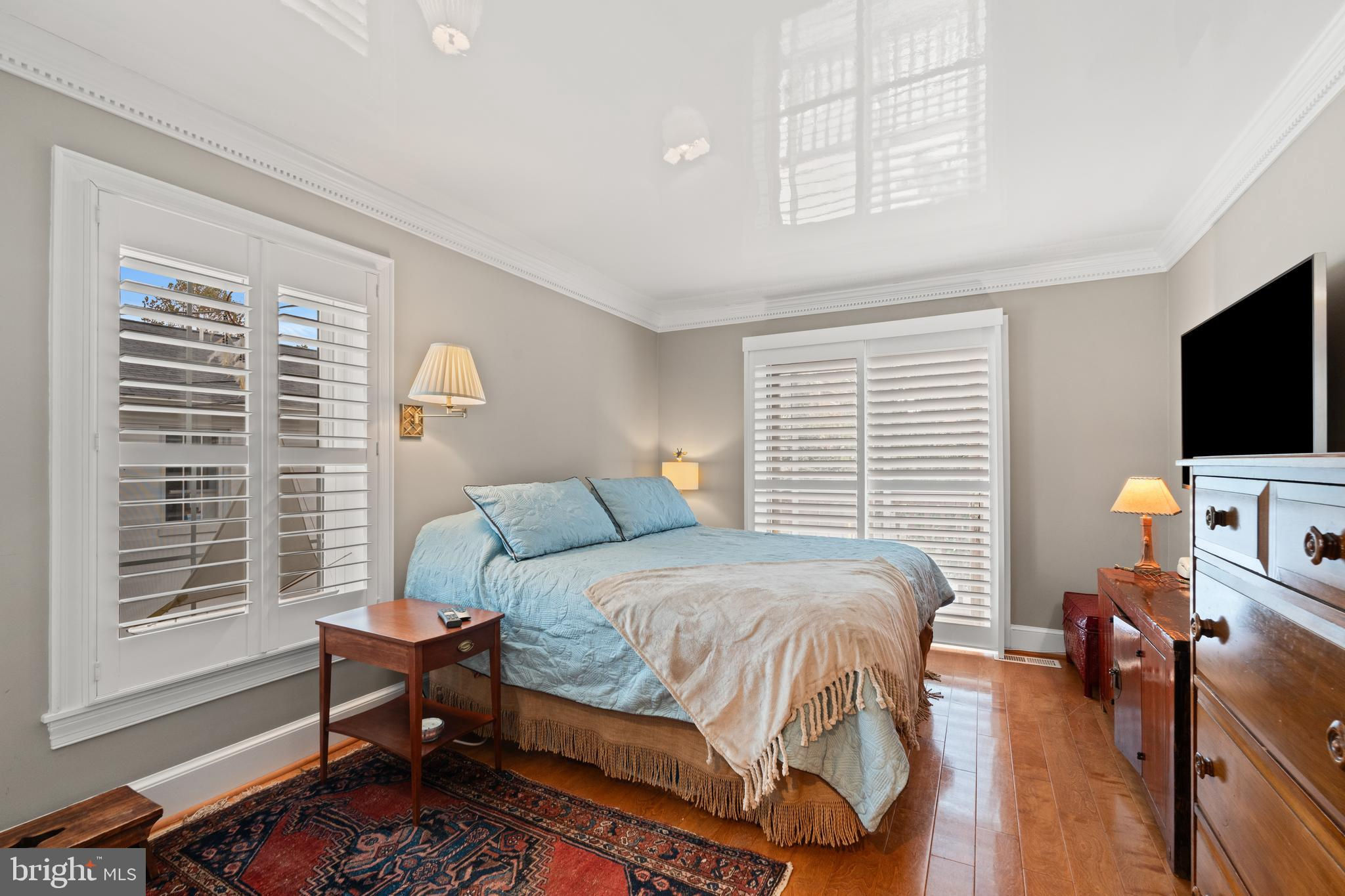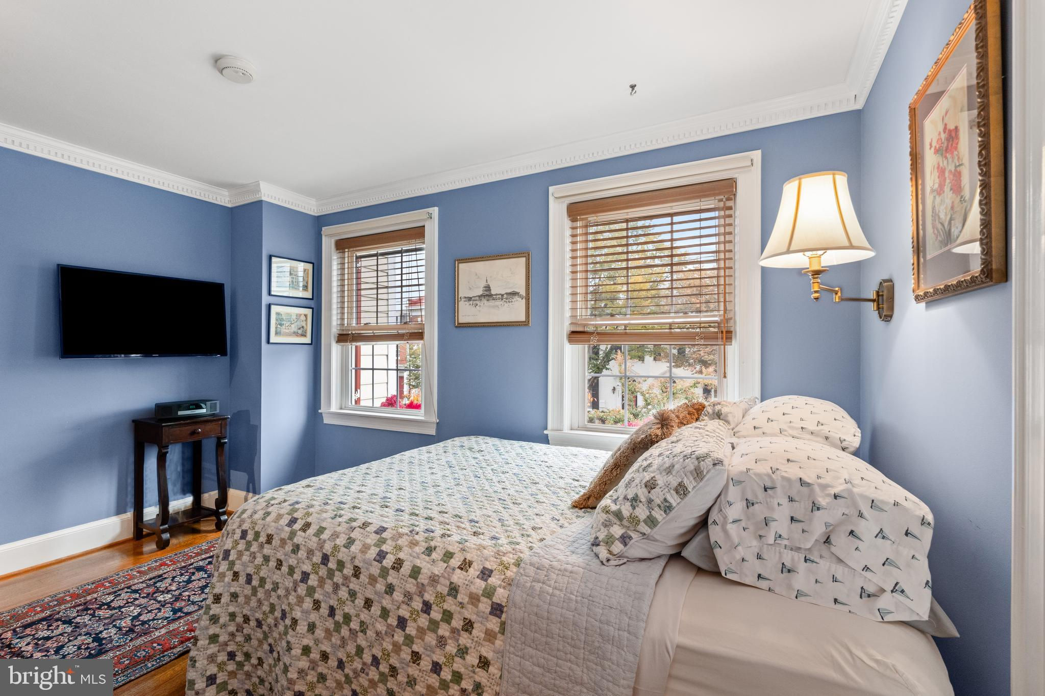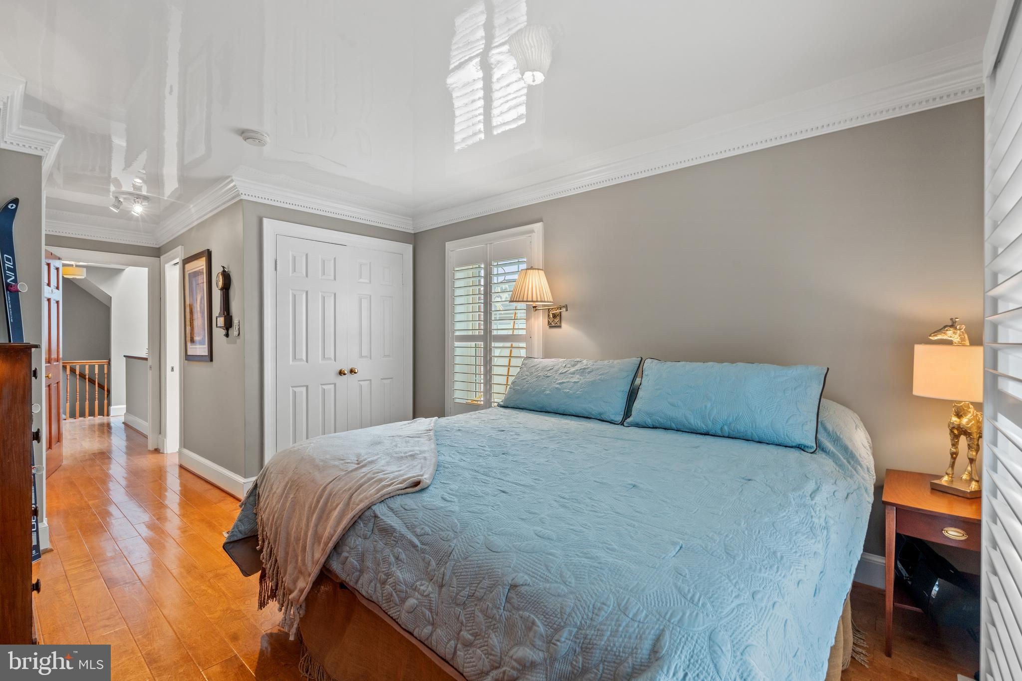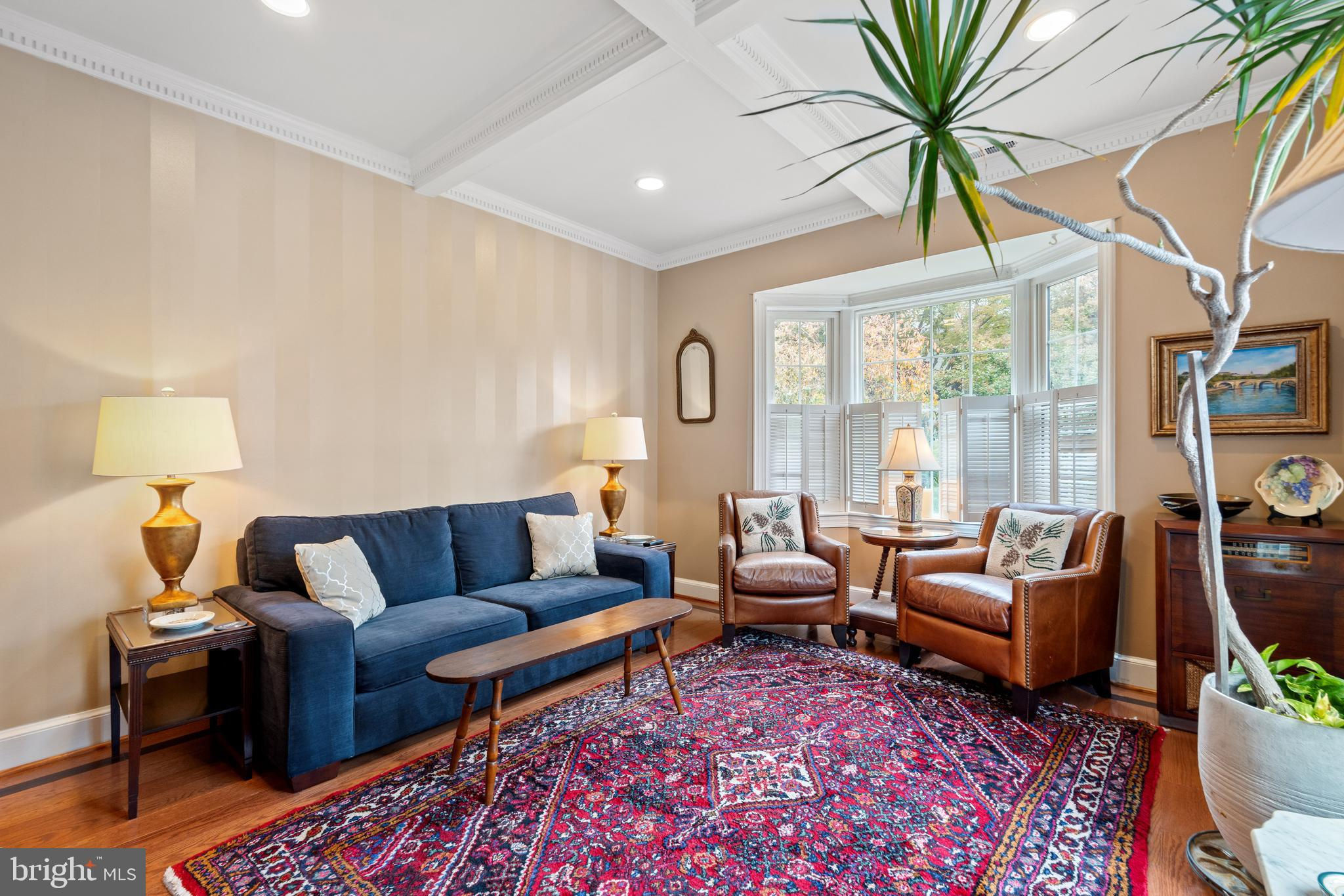 A rare opportunity in the heart of Old Town. Step through a solid wood front door with an oversized colonial-style brass lock into a dramatic three-story foyer crowned by an oversized skylight. Sun-filled rooms and classic craftsmanship set an elegant tone throughout. The living room features a 9’2” coffered ceiling, three-piece dentil crown molding, a bay window, and a wood-burning brick fireplace. Radiant-heated hardwood floors with a contrasting inlay add warmth and detail. A formal dining room showcases dentil crown, chair rail, wainscoting, and a seven-layer lacquered ceiling. The eat-in kitchen offers an antique handmade brick floor, coffered ceiling, and French doors that open to an all-season patio garden—perfect for everyday living and entertaining. Upstairs, a front bedroom enjoys a private full bath. The primary suite includes a French door to a Juliet balcony overlooking the patio, custom plantation shutters, two closets, a seven-layer lacquered ceiling, and wide-plank hardwood floors. The adjoining full bath features a double vanity set in an antique-style cabinet. A bedroom-level laundry closet provides side-by-side washer/dryer convenience. The top floor is a showstopper: a third bedroom/loft with cathedral ceiling, hardwood floors, and windows on all sides, plus a Nantucket-style full bath with shower, classic wainscoting, and storage tucked into the eaves. Outside, enjoy perennial gardens on the front, side, and rear—fully gated for privacy. Entry is via a private alley to two paved off-street parking spaces. A true “home for all seasons,” designed for comfortable living and effortless entertaining.