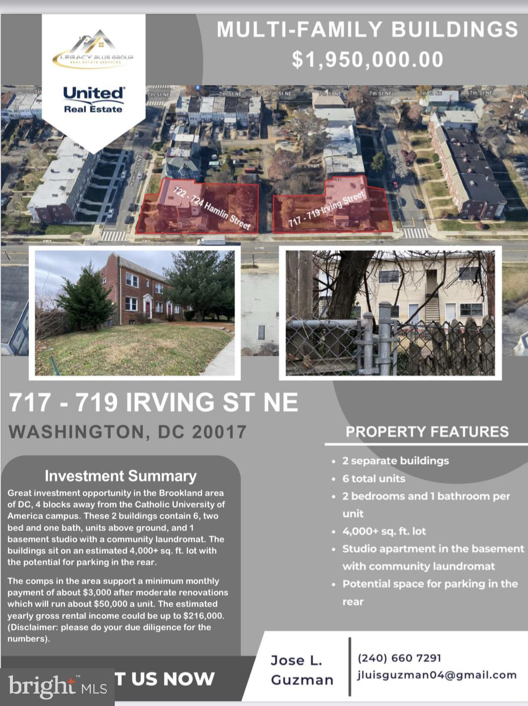 TOPA FREE-Great opportunity for an investor/developer! These 2 multi-family apartment buildings are being sold as a set with a total of 6 units with 2BR in each unit and a separate apartment in the basement. They are part of a 4 building multi-family project that can be purchased in a package. The sister buildings are 722-724 Hamlin ST NE ( MLS# DCDC2124956)situated on back-to-back corner lots with an alley in between. The buildings have been owned and managed by one family for over 40 years and have been vacant for over two years (TOPA FREE). The buildings are well maintained but need updating. Located near 2 metro stations, the Catholic University of America, and some of DC's best dining and breweries in the Monroe Market shopping center. The buildings are vacant with no TOPA to deal with. Please don't use the bathrooms as the buildings are winterized. Please do your due diligence concerning these properties
