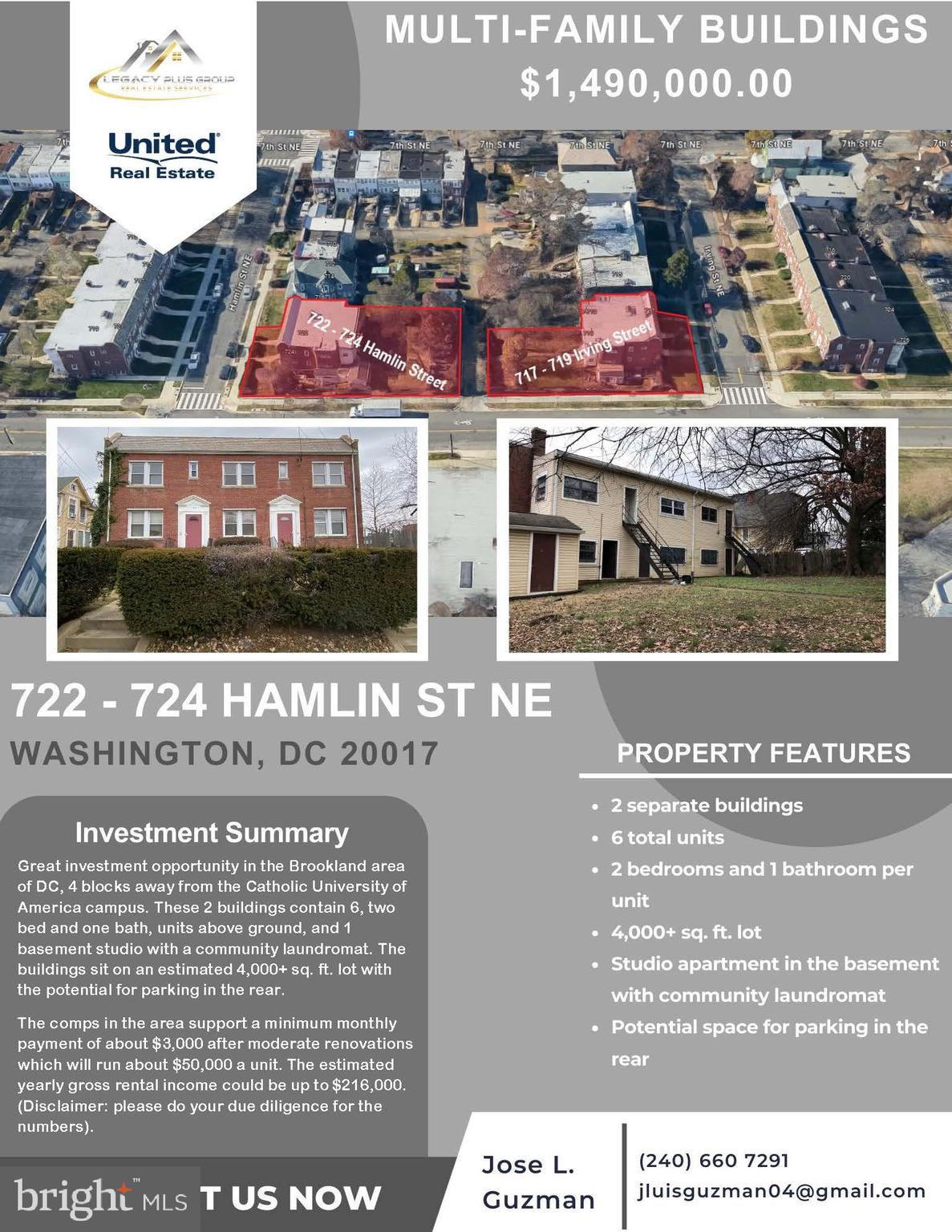 TOPA FREE-Great opportunity for an investor/developer! These 2 multi-family apartment buildings are being sold as a set with a total of 6 units with 2BR in each unit and a separate apartment in the basement. They are part of a 4 building multi-family project that can be purchased as a package. The sister buildings are 717-719 Irving NE (also for sale MLS # )and DCDC2150232)they are situated on back-to-back corner lots with an alley in between. The buildings have been owned and managed by one family for over 40 years and have been vacant for over two years ( TOPA FREE). The buildings are well maintained but need updating. Located near 2 metro stations, the Catholic University of America, and some of DC's best dining and breweries in the Monroe Market shopping center. The buildings are vacant with no TOPA to deal with. Please don't use the bathrooms in the building as they are winterized. Please do your due diligence concerning these properties.