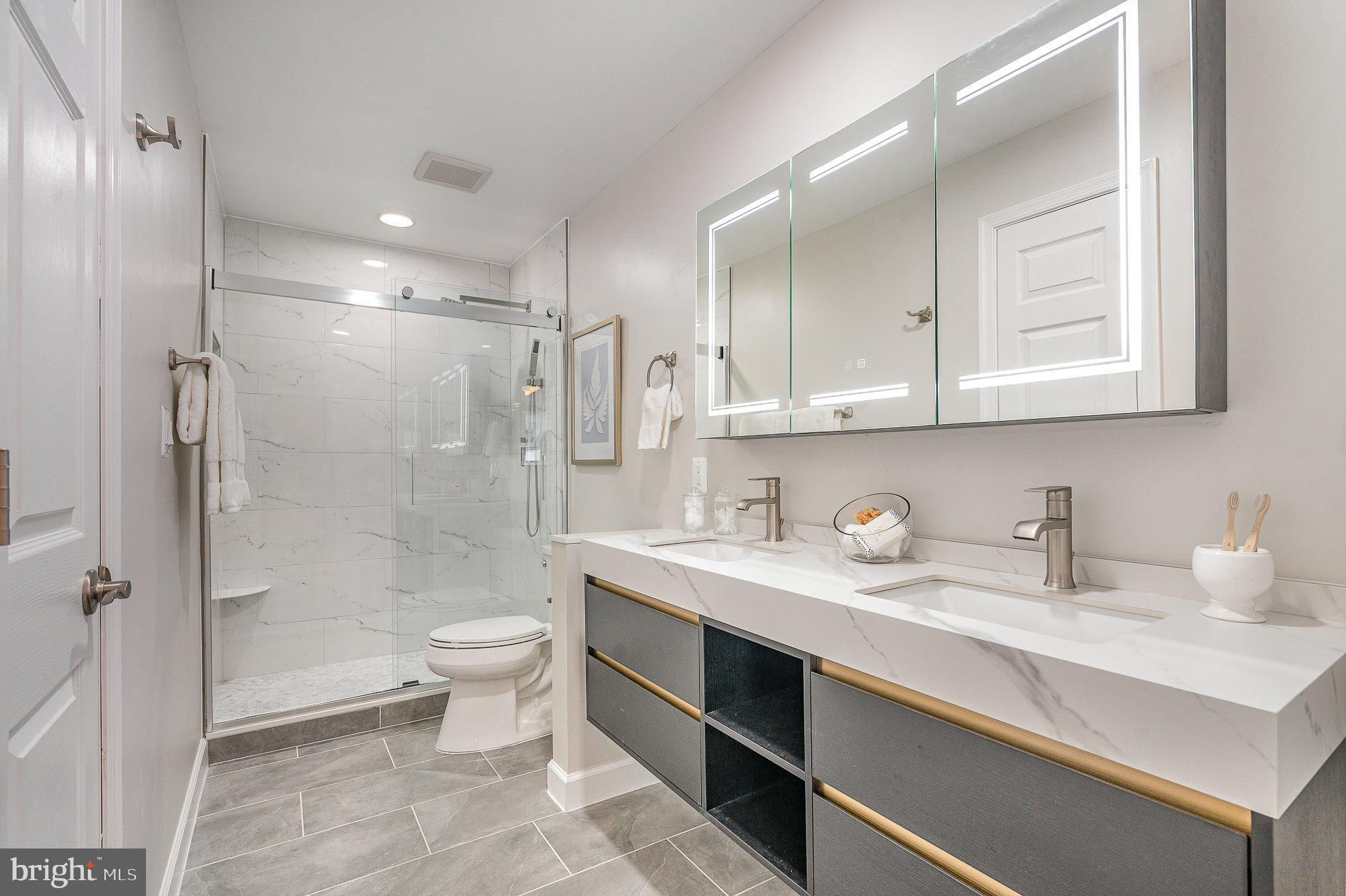 Stunning, fully renovated 2-bedroom, 2-bath luxury condo—every inch rebuilt and reimagined with over $90,000 in modern upgrades. Perfectly positioned off I-395 in the heart of Alexandria and minutes from the future Inova Alexandria Hospital at Landmark, this home delivers the sophistication, convenience, and quality today’s buyers demand. And thanks to the slower market, this one-of-a-kind renovation is still available—ready for the buyer who appreciates exceptional craftsmanship. Step inside to discover a completely transformed interior featuring all-new drywall, fresh designer paint (Sherwin-Williams Drift of Mist), and water-resistant luxury vinyl plank flooring throughout. A brand-new electrical system—including panel, wiring, tamper-resistant outlets, recessed LED lighting, and integrated 10-year smoke detectors—ensures peace of mind and modern efficiency. Three new ceiling fans, updated fixtures, and thoughtfully placed lighting elevate every room. Gourmet Kitchen — A True Showpiece, beautifully expanded to double the workspace, this chef-inspired kitchen features: - Premium Wolf soft-close cabinetry with lazy Susan - Sleek quartz countertops - Villa Artisan Nickel ceramic tile backsplash - Kohler stainless steel sink & faucet - Full suite of Frigidaire stainless steel appliances, including counter-depth fridge with ice maker - New chandelier and matching pendant lighting for refined style Spa-Like Bathrooms - Every element has been upgraded with luxury in mind. - Guest Bath: -- New Kohler soaking tub -- Porcelain tile surround -- Marble-top vanity with Kohler faucet -- Lighted medicine cabinet - Primary Bath: -- Walk-in shower with rainfall system and glass enclosure -- Porcelain tile throughout -- Marble-top dual vanity with Kohler faucets -- Lighted medicine cabinet -- Linen closet -- Added pocket door for enhanced space and flow Additional Notable Upgrades - Newly created laundry center with LG stacked washer/dryer - Closet Evolution custom systems in both bedroom closets - Fabric vertical blinds in living area; Bali top-down/bottom-up shades in bedrooms - Above-fireplace TV provisions with in-wall HDMI and power - Cable jacks in living room and both bedrooms - New Honeywell programmable thermostat This older community offers Resort-Style Amenities - Shuttle service to Van Dorn Metro - Club room, fitness center, two pools, tennis & volleyball courts - Picnic area, on-site daycare, and Amazon Hub in the lobby - Programmed future community upgrades - Condo fee includes all utilities!! Unmatched Location - Just minutes to I-395, Old Town Alexandria, Washington, DC, and future Landmark redevelopment. - Walk Score 77 — Very Walkable - Transit Score 54 — Good Transit - Bike Score 53 — Bikeable Special Financing: Buyers may qualify for the Pentagon Federal Credit Union VIB program, offering no loan-related closing costs and highly competitive rates.