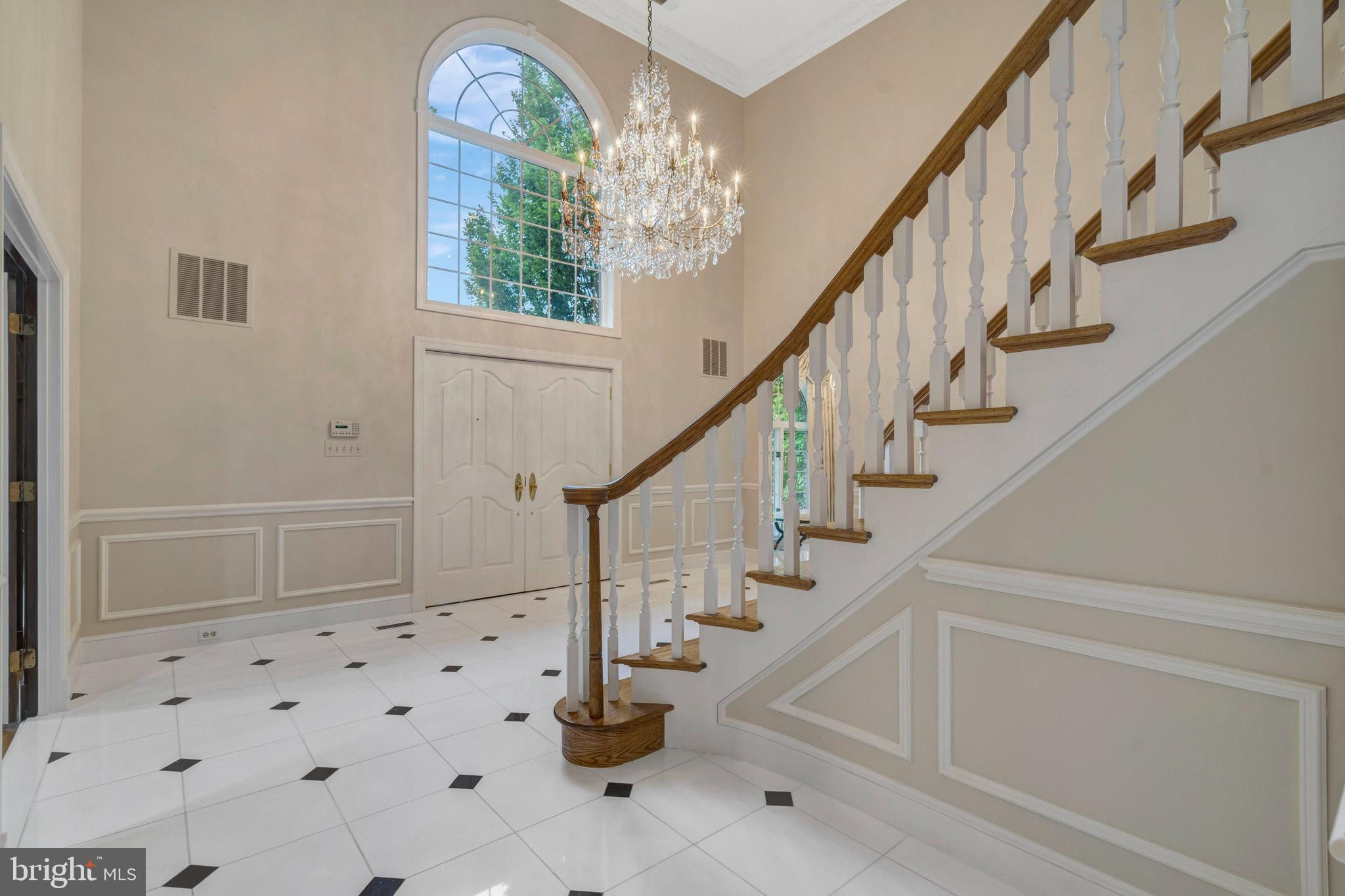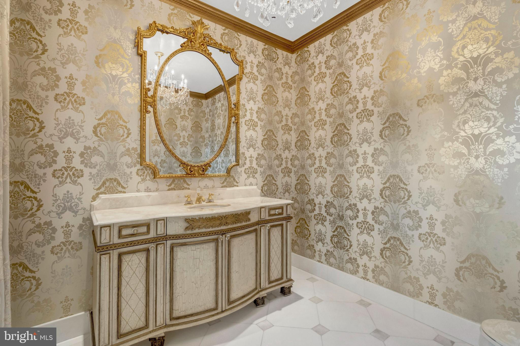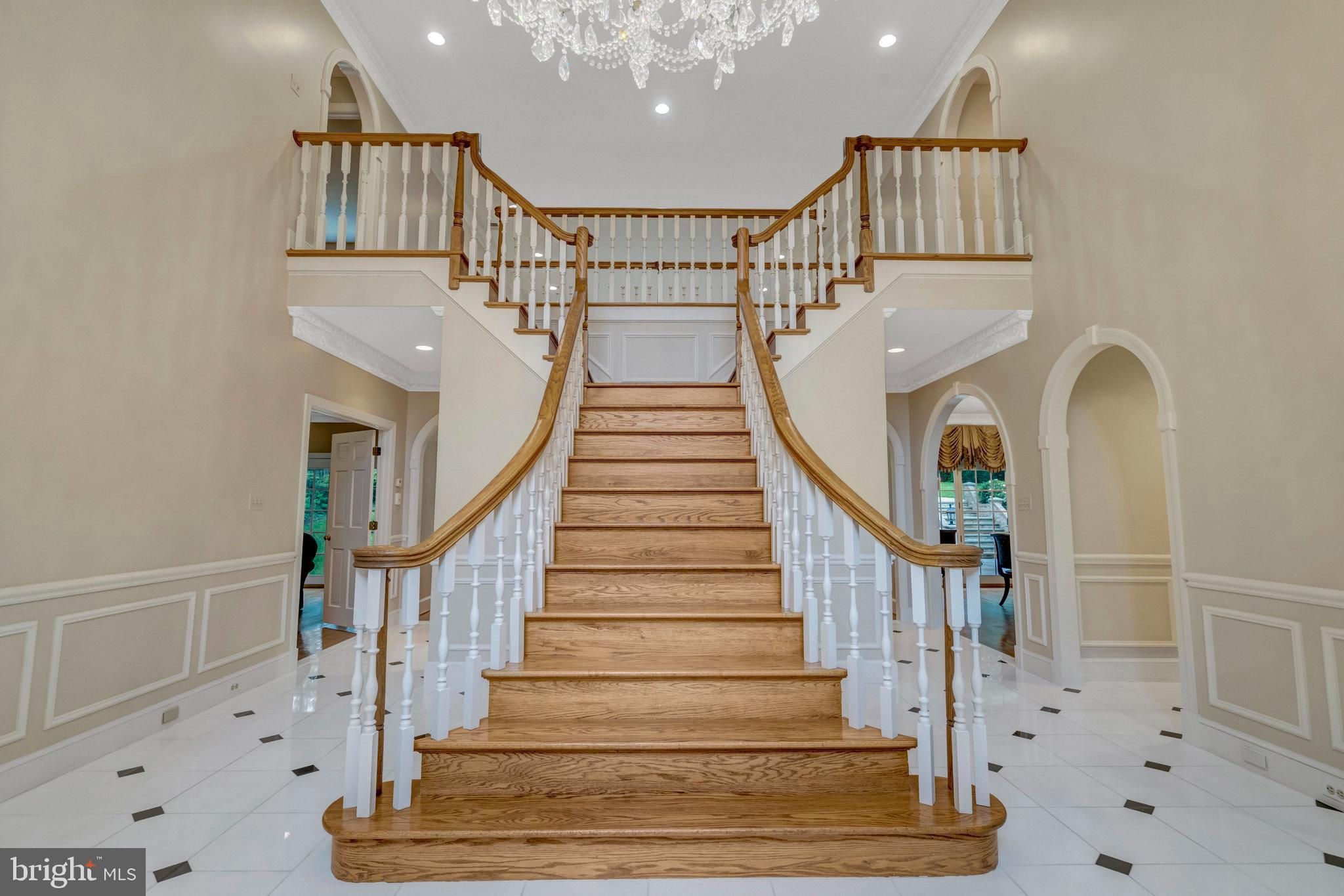 Nestled on nearly a full acre of beautifully landscaped grounds, this exquisite brick colonial offers 7672 square feet of luxurious living space. This is an exceptionally well built and beautifully maintained home by the original owner, very light and bright. The circular drive is flanked by stately brick pillars with outdoor lighting, and a side-load 3-car garage. The double front doors open to a welcoming 2-story marble foyer with a dramatic central staircase. Elegant panel wainscoting, and gracefully arched doorways mirror the shape of the large, beautiful arched transom windows. Just off the foyer, large wooden double doors open to a handsome library with hardwood floors. Chestnut-colored built-in bookshelves and cabinetry are bathed in natural light from two large, beautiful, arched windows. Across the foyer, a spacious powder room boasts marble floors and a stunning marble vanity, adding a touch of opulence. The family room features a gorgeous, stone, woodburning fireplace, hardwood floors, recessed lighting, crown moulding. A large glass door opens to the rear patio. The formal living room is exquisite, with soaring 2-story windows, hardwood floors, an elegant fireplace, and charming doorways. The dining room is equally refined, with its own set of arched doorways, hardwood floors, and exquisite mouldings, making it ideal for entertaining in style. The gourmet kitchen is stunning. It features elegant antique white cabinetry including an integrated panel refrigerator. The gas stove is a Dacor with 6 burners. The jet-cut marble mosaic backsplash adds an artistic touch. There is a second oven in the island, plus there is a built-in microwave and trash compactor. Marble countertops and diagonally laid marble floor tiles harmonize beautifully with the cabinetry. The sunny breakfast area features a vaulted cathedral ceiling and 2 skylights. A large window and a large cozy window seat overlook the back yard. An arched window lets more light onto the upper level. An additional staircase leads from the kitchen area to the primary bedroom. Connecting the kitchen to the garage is a convenient mud room/laundry room with a pantry closet, new GE Profile washer and dryer, a sink, and ample cabinetry. The sun room features hardwood floors, a cathedral ceiling, 2 skylights, and a marble fireplace between built-in cabinetry and shelving. A large glass door leads to the expansive rear patio, perfect for enjoying the serene surroundings. The upper level has hardwood flooring throughout, featuring the primary suite plus four additional generously sized bedrooms, a jack-and-jill bath with a double vanity and water closet, a hall bath, and a sitting area. The bathrooms feature elegant wallpaper, stylish light fixtures, and a skylight in the hall bath. The enormous primary bedroom features a dramatic cove ceiling and a walk-in closet with custom shelving. A luxurious en-suite bathroom with a double vanity, a bidet, and jetted corner tub with picturesque windows. The lower level is quite large and completely finished, with neutral wall to wall carpeting, neutral walls, and recessed lighting. There is a rec room, game room, den/potential 6th bedroom, a full bath with a bidet, and utility rooms. In the rec room there is a fireplace flanked by built-in mirrored shelving, a granite wet bar with a mini fridge, and a wine room. The expansive treed back yard offers privacy and relaxing views, perfect for a pool. The giant 1400+ sq .ft. Flagstone patio wraps around and is accessible from multiple rooms on the main level. This fabulous patio is particularly picturesque and perfect for parties. The spacious garage features a built-in refrigerator, built-in storage cabinets, and automatic door openers. There is an indoor-outdoor intercom system that conveys as-is. Located on quiet cul de sac of 20 estate homes, with convenient access to Tysons, DC, Reagan National Airport, Dulles, Silver Line Metro, Great Falls Park, and Langley Schools.