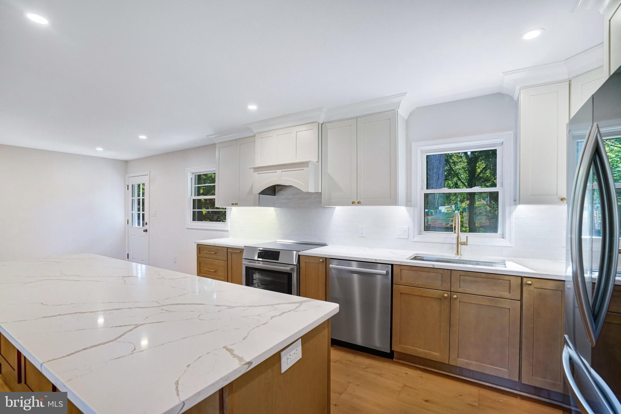Stunning classic brick rambler with modern finishes. This beautifully renovated rambler blends classic charm with contemporary style. Featuring 4 bedrooms and 4 full baths, including en-suites with walk-in closets on both levels, this home offers flexible living for families or guests. The open-concept kitchen is a showstopper with an oversized island featuring a magnificent quartz top. Top of the line Bosch induction stove, and an oversized sink—perfect for cooking and entertaining. A light filled sunroom with mini-split system provides year-round usability. Engineered white oak flooring runs throughout the main level for a warm, cohesive look from sunroom to bedroom. Downstairs, enjoy a spacious L-shaped den with textured carpet, a beautifully designed laundry area with sink, storage, and workspace, plus two additional bedrooms and baths. Outside, the home offers plenty of yard space for outdoor activities, and cedar privacy fence. Detached garage with storage room above, a rare find in this area. Expanded driveway that easily fits multiple cars or larger vehicles. A thoughtfully updated home combining craftsmanship, comfort, and functionality—move right in and enjoy! Nestled in the desirable Mount Vernon area, commuters will appreciate easy access to Ft. Belvoir to the south and GW Parkway to the north for scenic commuting to Old Town, Pentagon and DC. Owner/agent.