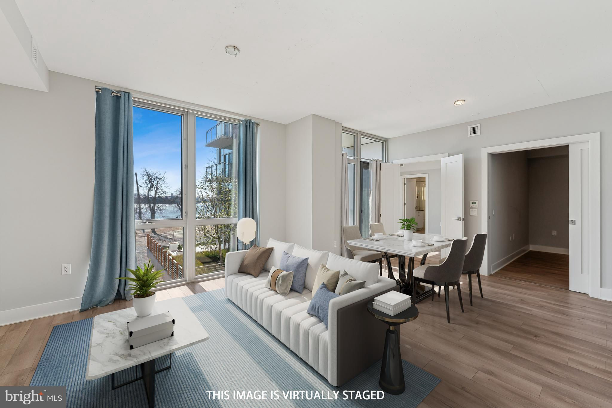 APPROVED SHORT SALE…Luxury Waterfront Living at Peninsula 88 - 88 V Street SW, Washington, DC Unit 203 is a stunning two-bedroom (owners' suite and flexible den/bedroom), two-bathroom residence at Peninsula 88. Nestled in the vibrant Buzzard Point area of the Capitol Riverfront neighborhood, this home offers breathtaking water views and unparalleled access to some of DC's most exciting attractions, including Nationals Park, Navy Yard, and Audi Field. Exceptional Interior features include a private balcony with captivating water views, Open floor plan with high ceilings and floor-to-ceiling windows, Gourmet kitchen featuring stainless steel appliances, quartz countertops, built-in microwave, and wide plank flooring. There's a full size in-unit washer and dryer for added convenience. Resort Life Style Building Amenities: Rooftop deck with panoramic river views, grills, and firepits. Skytop lounge equipped with workstations, large-screen TVs, and a full kitchen. The garage has Bike and kayak storage racks, Dog spa for pampering furry residents, DIY car wash area or optional customer-paid car wash service, Free electric car chargers and dry-cleaning lockers. Secure Luxer package room for easy package retrieval. 24-hour remote security, on-site property manager, and daily custodian staff. LEED Certified for sustainable, eco-friendly living. Prime Location & Transportation: Easy access to bus stops and Circuit e-cars for seamless transportation to Navy Yard and The Wharf. Close to Waterfront and Navy Yard Metro stations for effortless citywide connectivity. One garage parking space included. Don't miss the opportunity to embrace the Southwest Waterfront lifestyle with this luxurious Peninsula 88 residence.