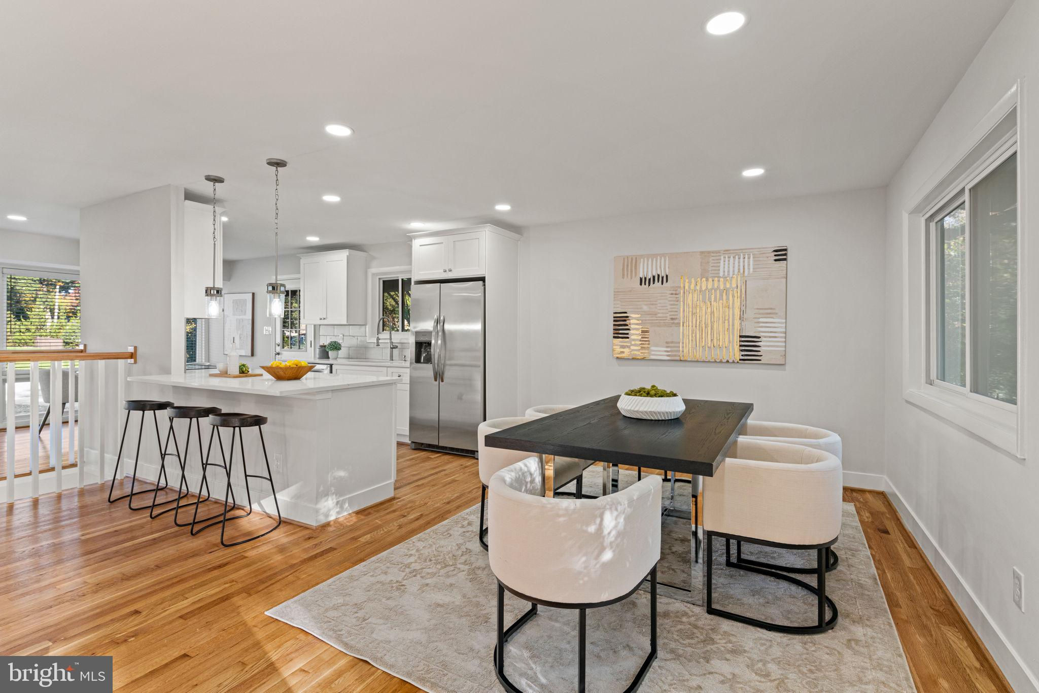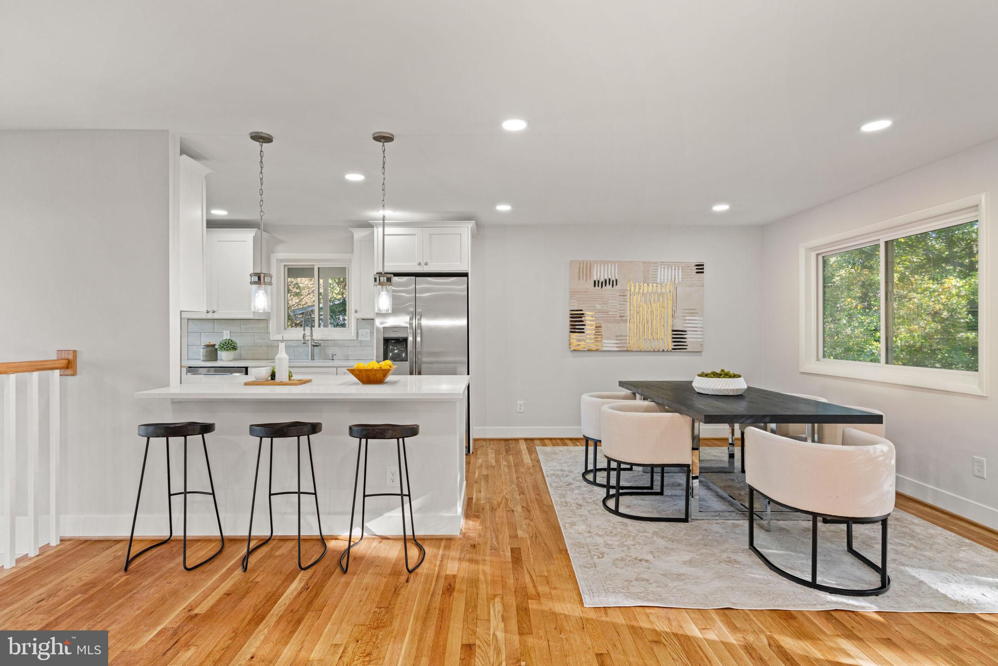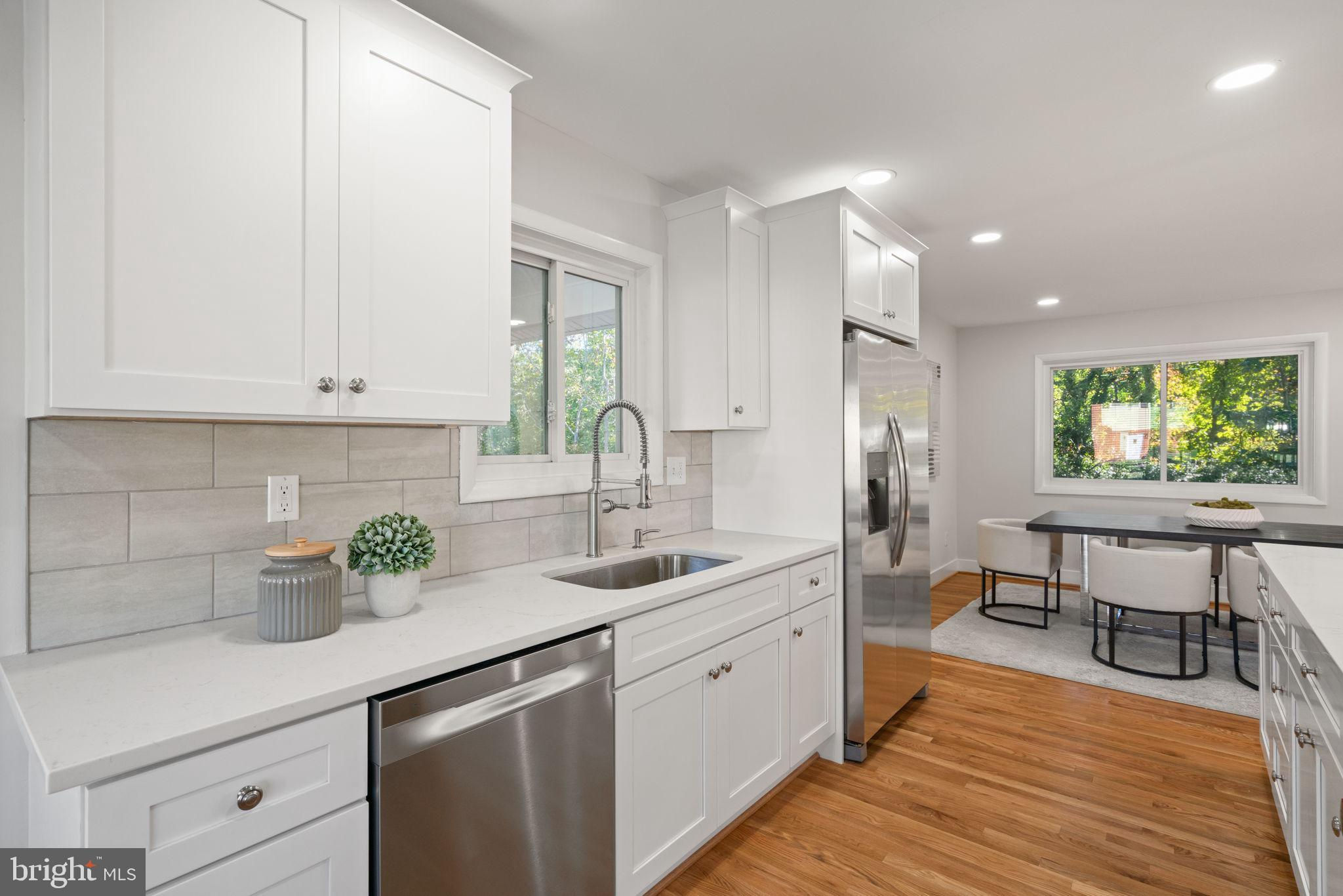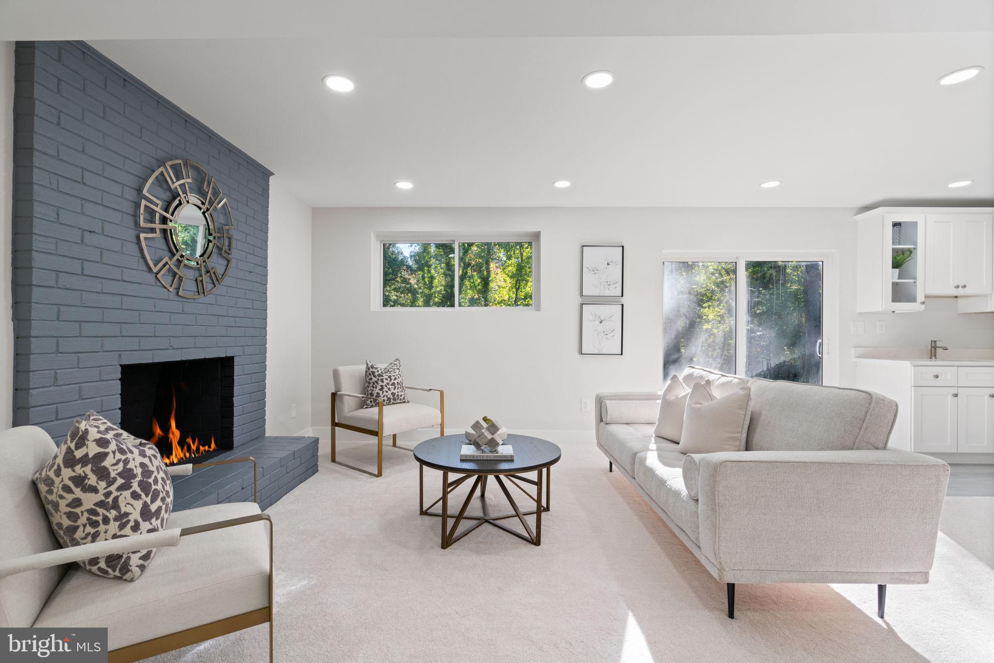 Tucked away on a quiet street, this completely turn key home boasts a full renovation in addition to its top notch location. 4 bedrooms and 3 full baths on 2 finished levels. Step inside to find gleaming hardwood floors flowing throughout the open concept main level complete with walls of windows. The gourmet eat in kitchen features modern white shaker cabinetry, stunning Premata quartz counters, a custom tiled backsplash and new stainless steel appliances. The eat-in nook with its large front window is perfect for that morning coffee! Just off the kitchen you have a large dining and living room. Bright new recessed lighting and ample oversized windows allow for an abundance of natural light and stunning views of the private backyard oasis. Make your way down the hall to find two spacious guest bedrooms each featuring new lighting and hardwood flooring with loads of natural light. Across the hall is a fully renovated bathroom with a modern vanity and a custom tiled shower and bath. The 3rd bedroom, a main level primary suite is a true retreat! Sitting on the rear of the home, this bedroom features the same hardwood flooring along with views of the backyard. The en-suite bath is a true show stopper with a beautifully tiled shower. As you make your way down to the fully finished walkout basement, the oversized rec room features a wood burning fireplace, fresh carpet, a brand new wet bar, recessed lighting and a sliding door walk-out to the flat and spacious backyard. Enjoy entertaining inside or outside on the newly poured large concrete patio! Back inside, you’ll find a third fully renovated full bathroom and the bright and sunny fourth bedroom, complete with egress window. The laundry and storage room with a separate entrance to the outside can also be found down here. Brand new 2025 roof, 2022 Lennox HVAC system, 2025 water heater, newer vinyl windows. Carport with side entrance into the main level. Backs to woods/creek. Quiet street.