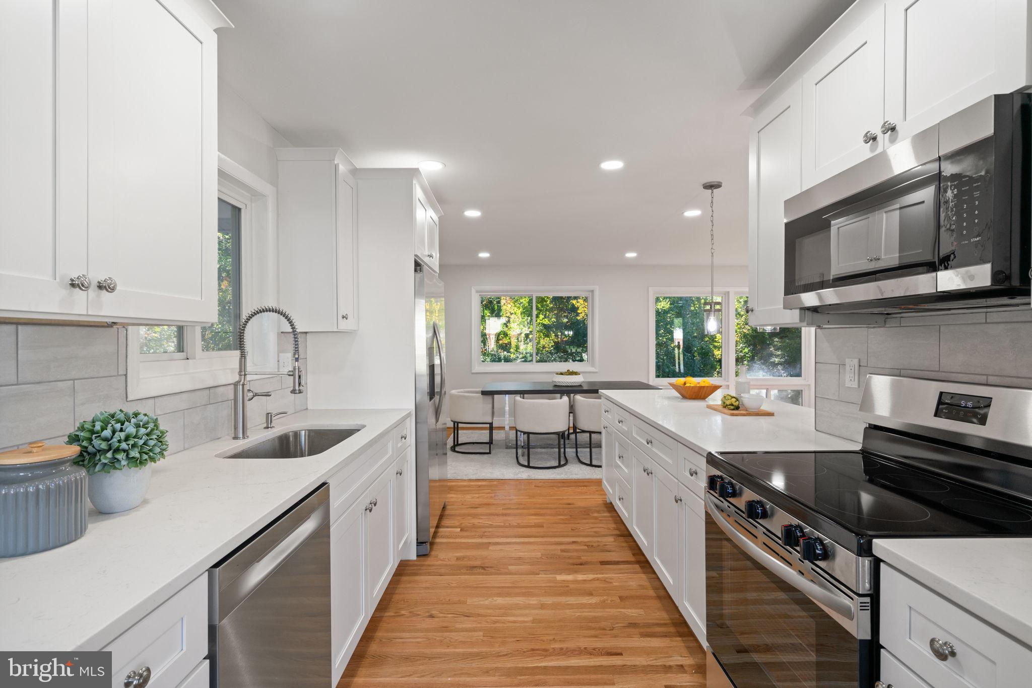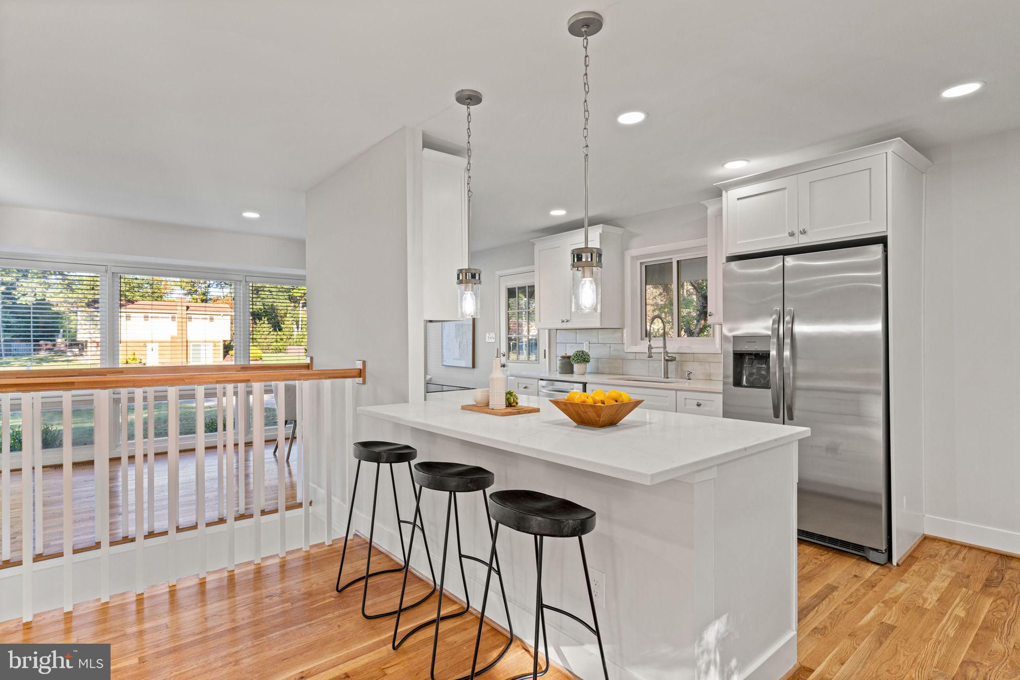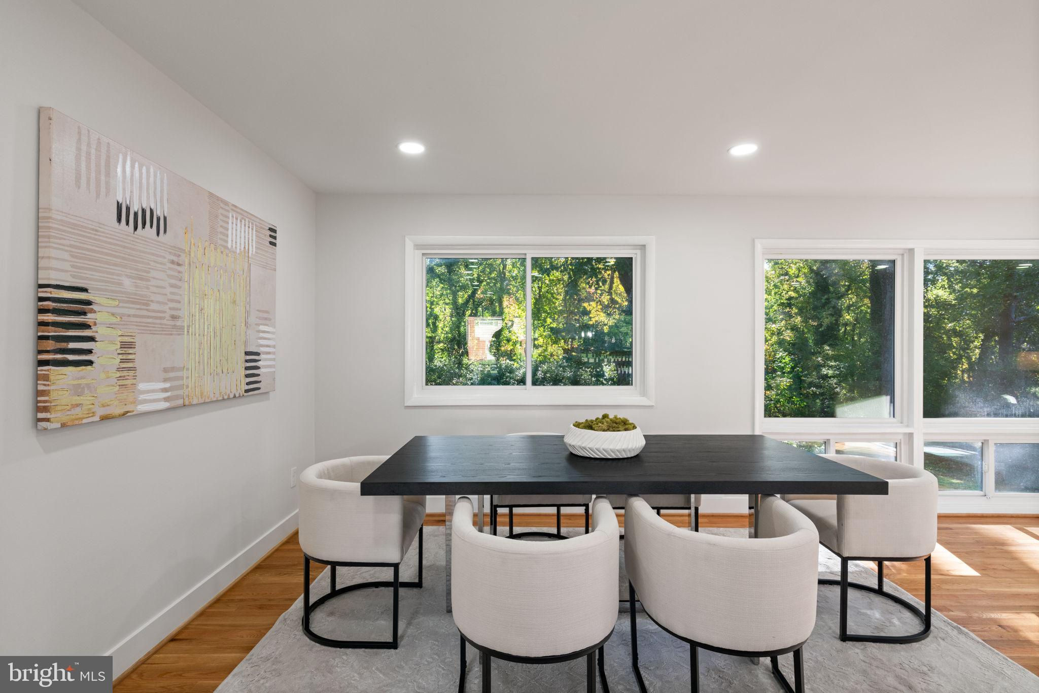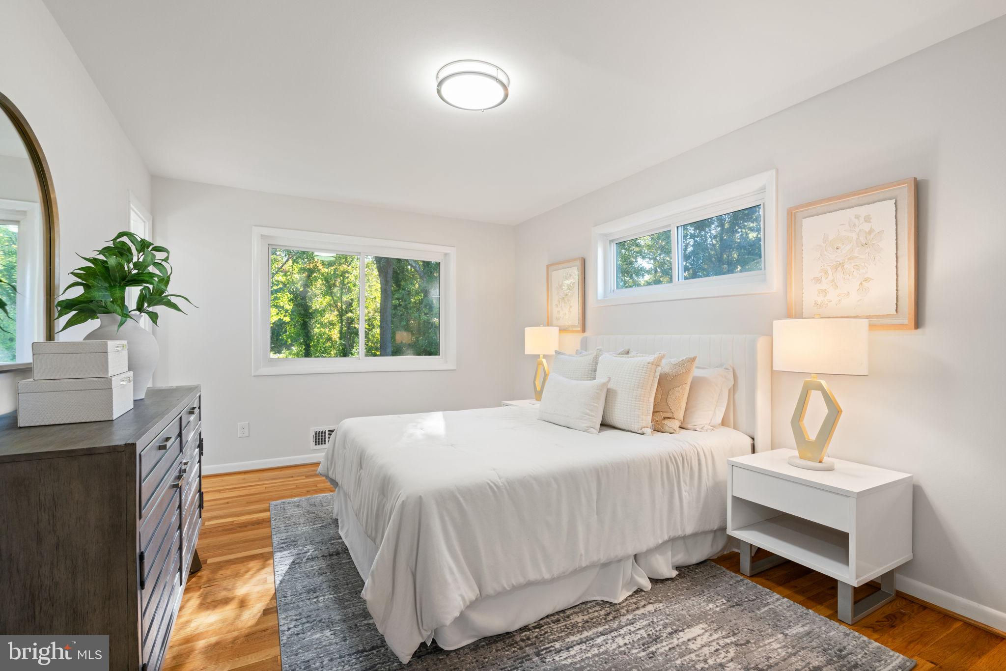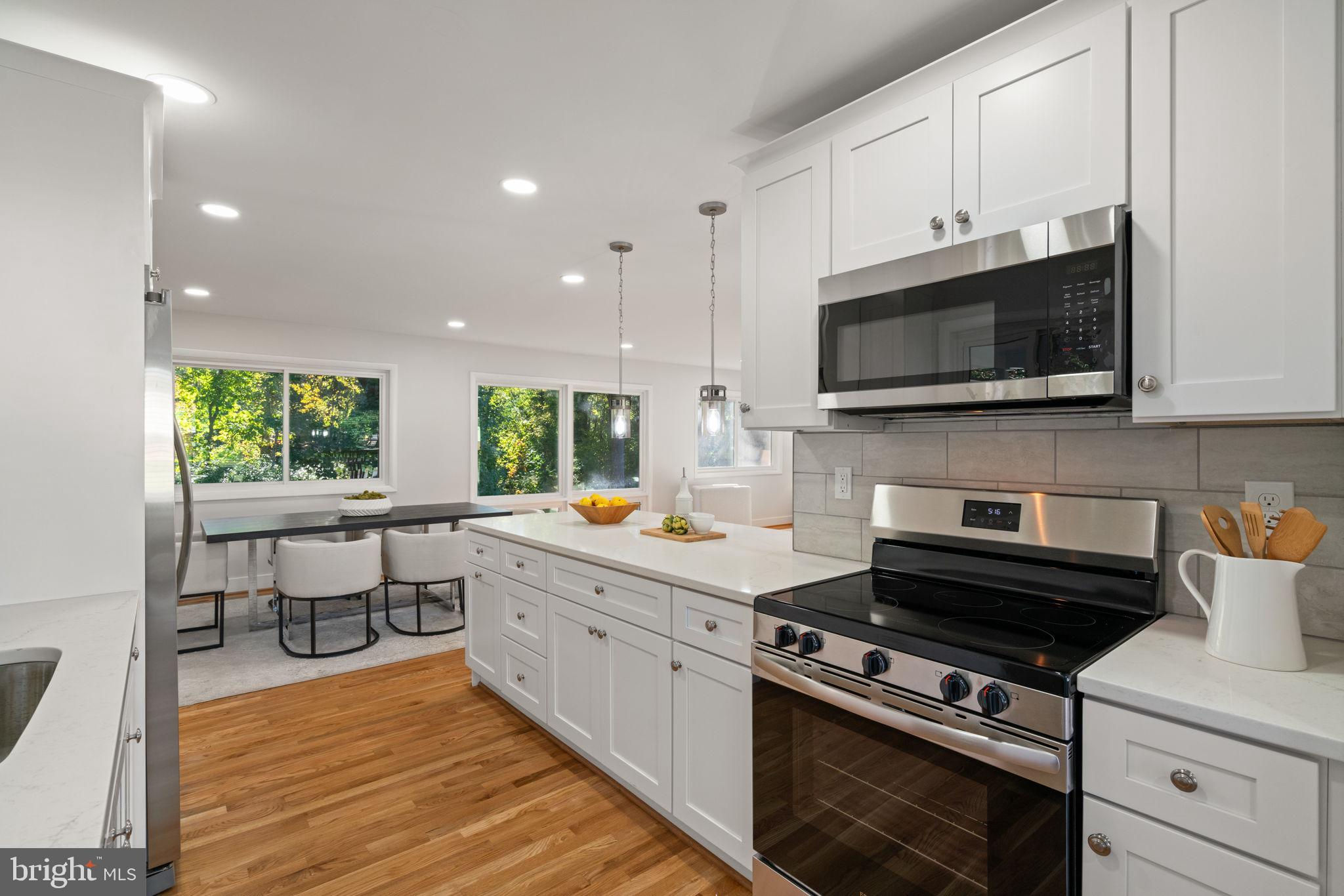Tucked away on a quiet street, this completely turn key home boasts a full renovation in addition to its top notch location. 4 bedrooms and 3 full baths on 2 finished levels. Step inside to find gleaming hardwood floors flowing throughout the open concept main level complete with walls of windows. The gourmet eat in kitchen features modern white shaker cabinetry, stunning Premata quartz counters, a custom tiled backsplash and new stainless steel appliances. The eat-in nook with its large front window is perfect for that morning coffee! Just off the kitchen you have a large dining and living room. Bright new recessed lighting and ample oversized windows allow for an abundance of natural light and stunning views of the private backyard oasis. Make your way down the hall to find two spacious guest bedrooms each featuring new lighting and hardwood flooring with loads of natural light. Across the hall is a fully renovated bathroom with a modern vanity and a custom tiled shower and bath. The 3rd bedroom, a main level primary suite is a true retreat! Sitting on the rear of the home, this bedroom features the same hardwood flooring along with views of the backyard. The en-suite bath is a true show stopper with a beautifully tiled shower. As you make your way down to the fully finished walkout basement, the oversized rec room features a wood burning fireplace, fresh carpet, a brand new wet bar, recessed lighting and a sliding door walk-out to the flat and spacious backyard. Enjoy entertaining inside or outside on the newly poured large concrete patio! Back inside, you’ll find a third fully renovated full bathroom and the bright and sunny fourth bedroom, complete with egress window. The laundry and storage room with a separate entrance to the outside can also be found down here. Brand new 2025 roof, 2022 Lennox HVAC system, 2025 water heater, newer vinyl windows. Carport with side entrance into the main level. Backs to woods/creek. Quiet street.