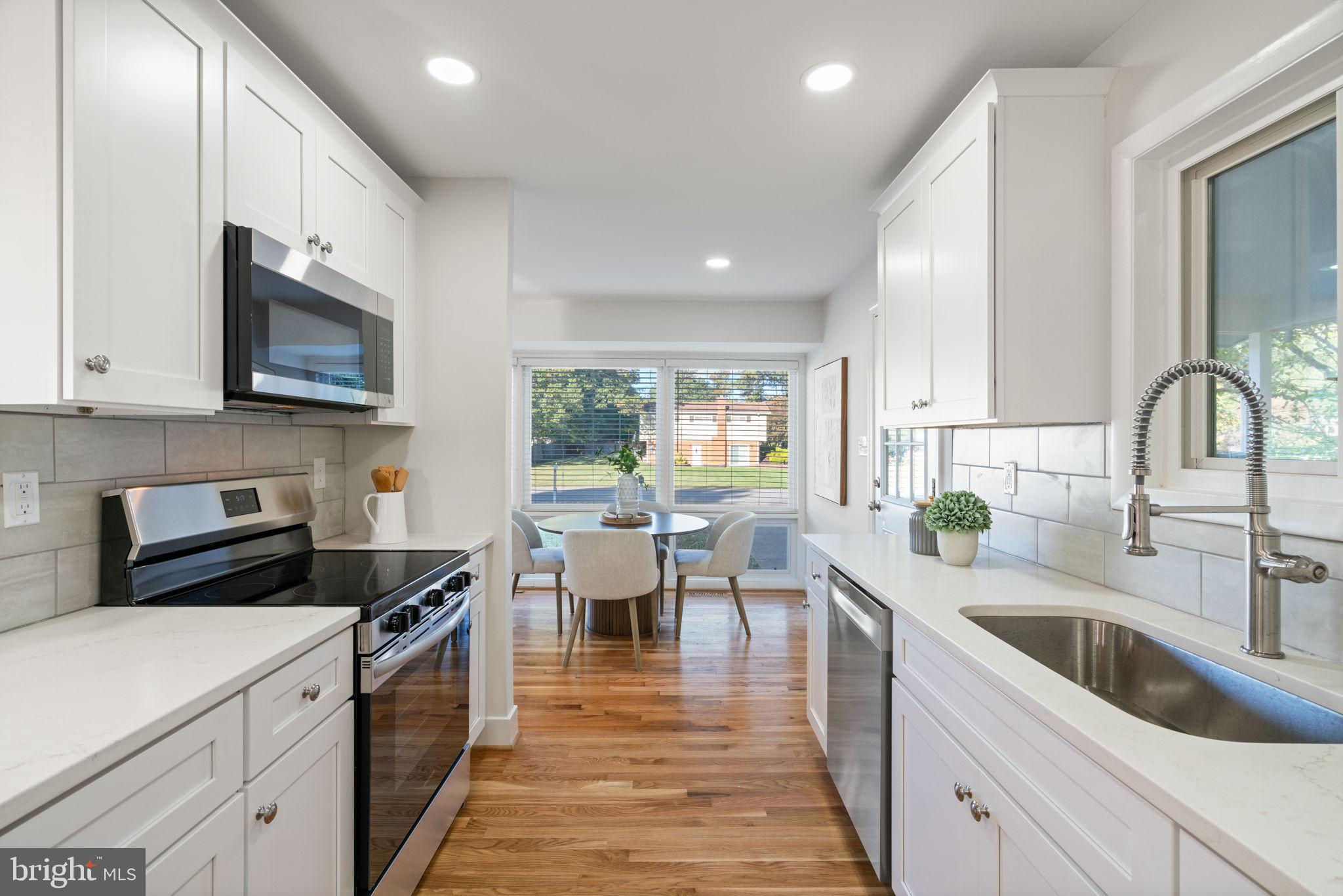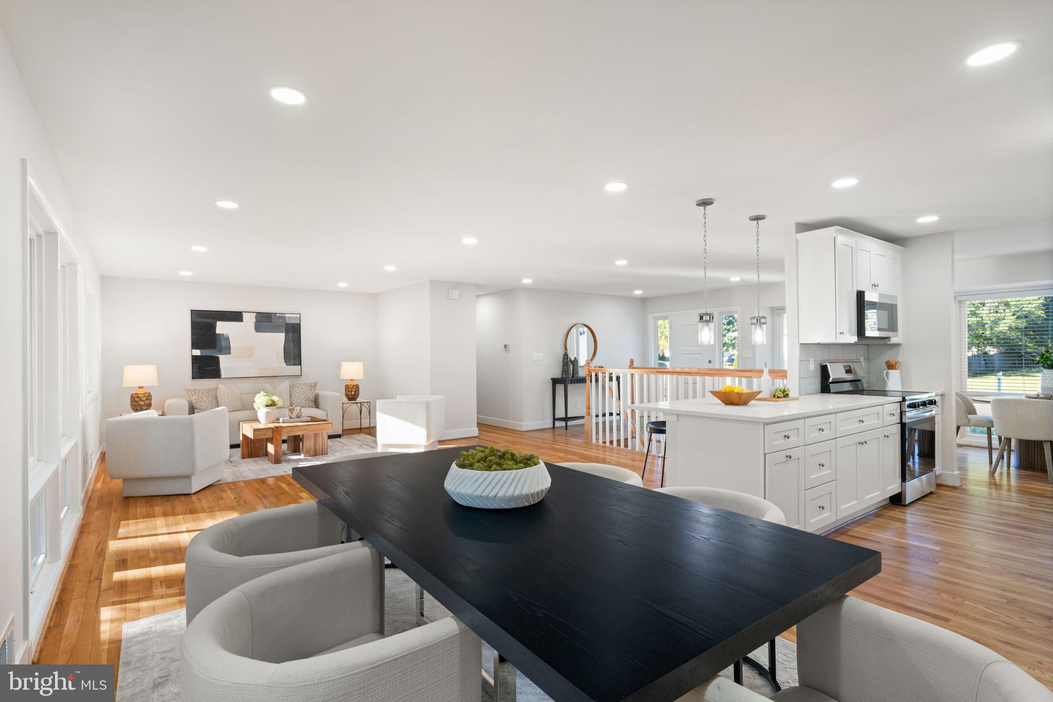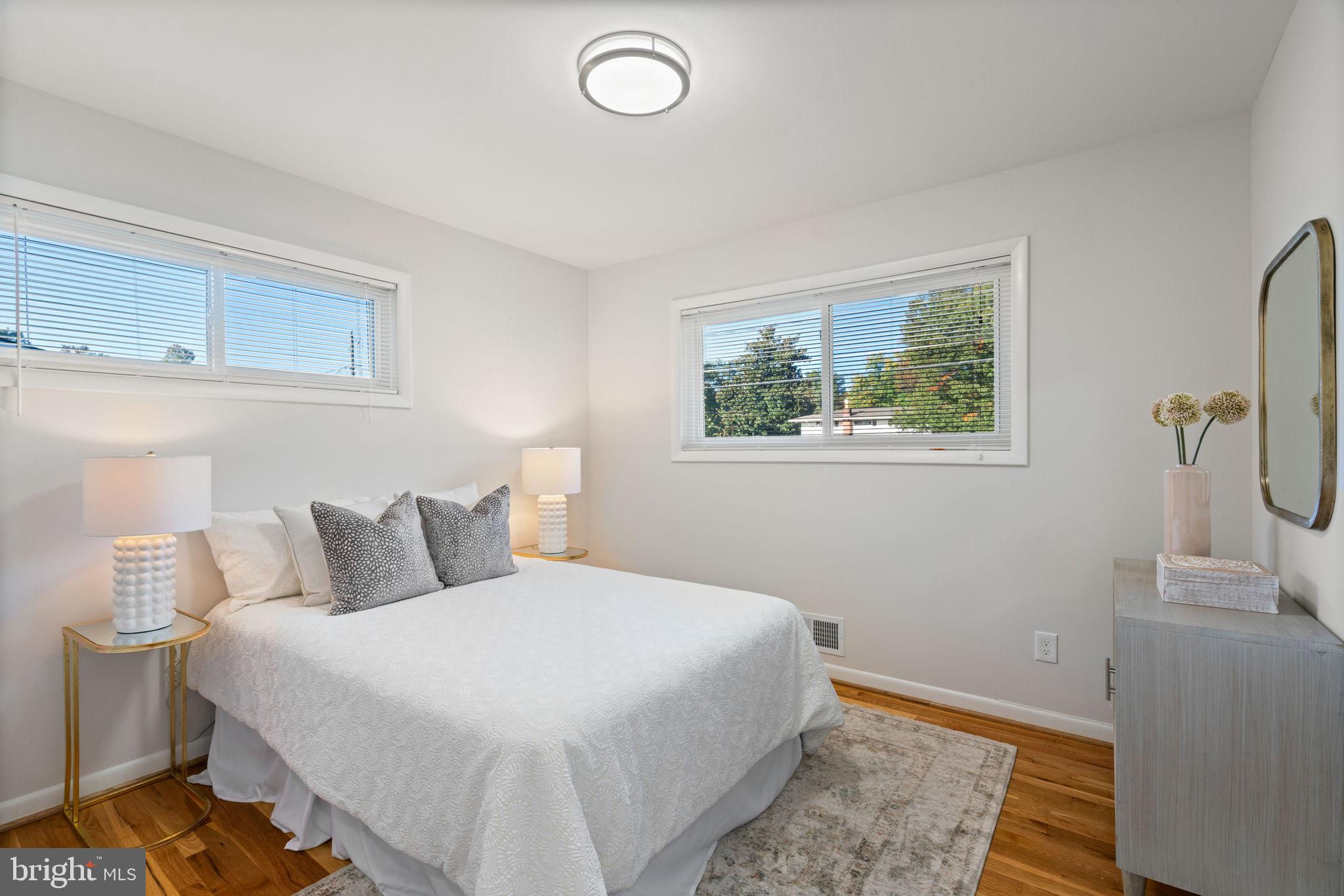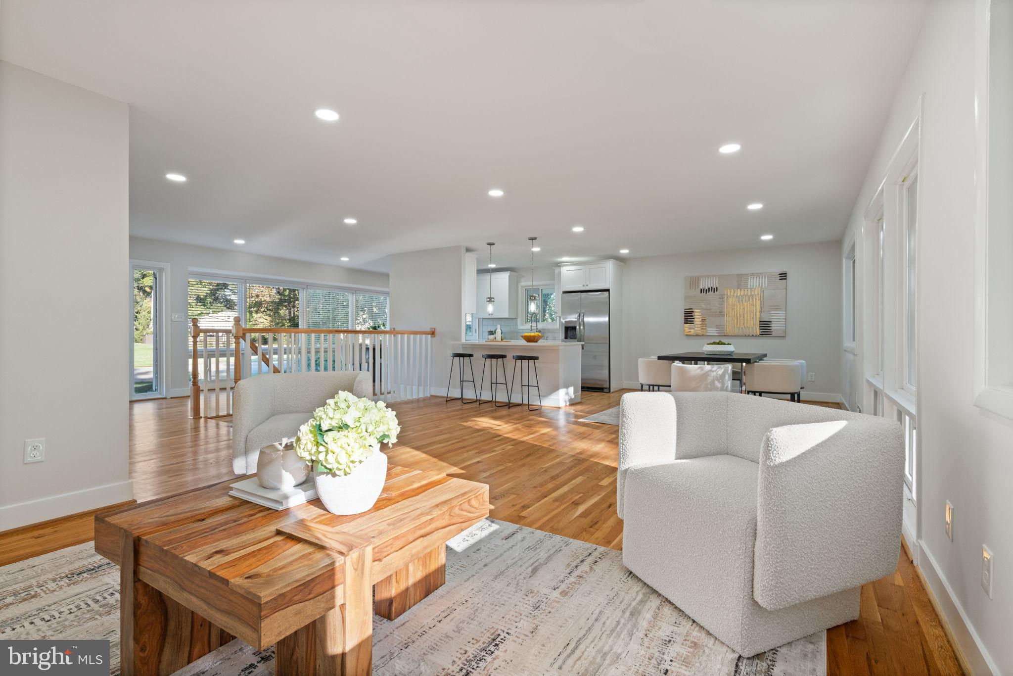 Tucked away on a quiet street, this completely turn key home boasts a full renovation in addition to its top notch location. 4 bedrooms and 3 full baths on 2 finished levels. Step inside to find gleaming hardwood floors flowing throughout the open concept main level complete with walls of windows. The gourmet eat in kitchen features modern white shaker cabinetry, stunning Premata quartz counters, a custom tiled backsplash and new stainless steel appliances. The eat-in nook with its large front window is perfect for that morning coffee! Just off the kitchen you have a large dining and living room. Bright new recessed lighting and ample oversized windows allow for an abundance of natural light and stunning views of the private backyard oasis. Make your way down the hall to find two spacious guest bedrooms each featuring new lighting and hardwood flooring with loads of natural light. Across the hall is a fully renovated bathroom with a modern vanity and a custom tiled shower and bath. The 3rd bedroom, a main level primary suite is a true retreat! Sitting on the rear of the home, this bedroom features the same hardwood flooring along with views of the backyard. The en-suite bath is a true show stopper with a beautifully tiled shower. As you make your way down to the fully finished walkout basement, the oversized rec room features a wood burning fireplace, fresh carpet, a brand new wet bar, recessed lighting and a sliding door walk-out to the flat and spacious backyard. Enjoy entertaining inside or outside on the newly poured large concrete patio! Back inside, you’ll find a third fully renovated full bathroom and the bright and sunny fourth bedroom, complete with egress window. The laundry and storage room with a separate entrance to the outside can also be found down here. Brand new 2025 roof, 2022 Lennox HVAC system, 2025 water heater, newer vinyl windows. Carport with side entrance into the main level. Backs to woods/creek. Quiet street.